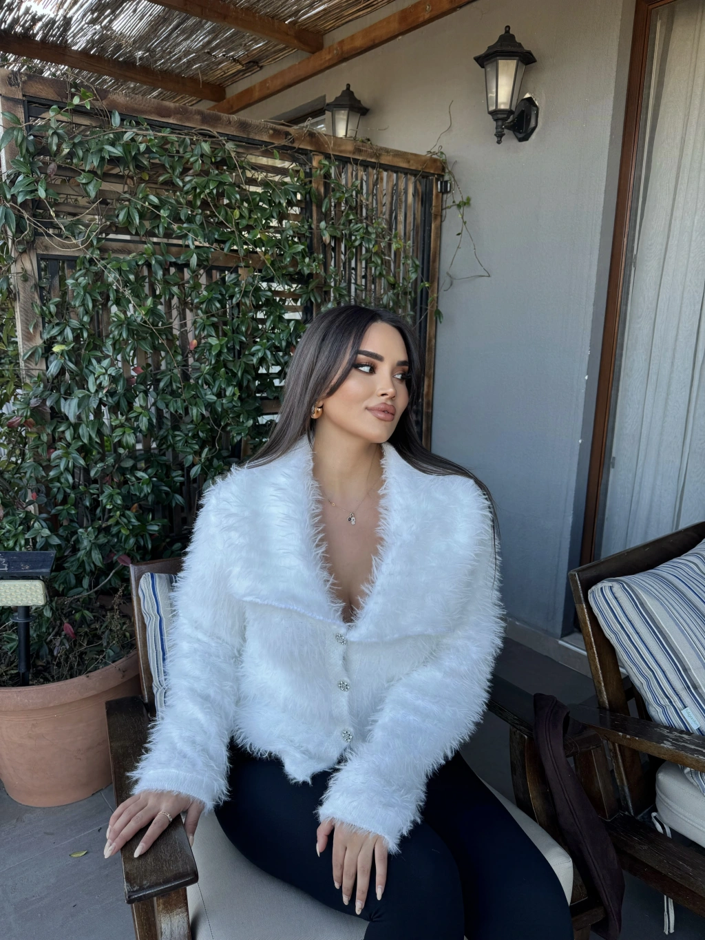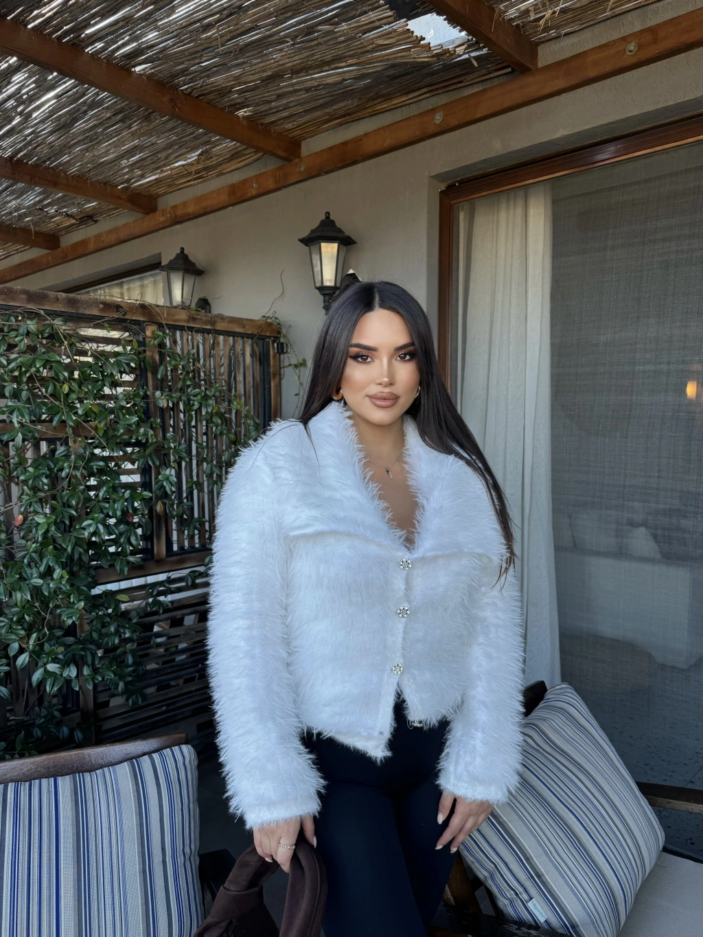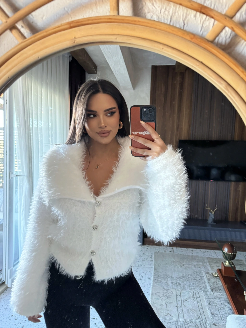 Beyaz Polo Yaka Taşlı Yumoş Kazak