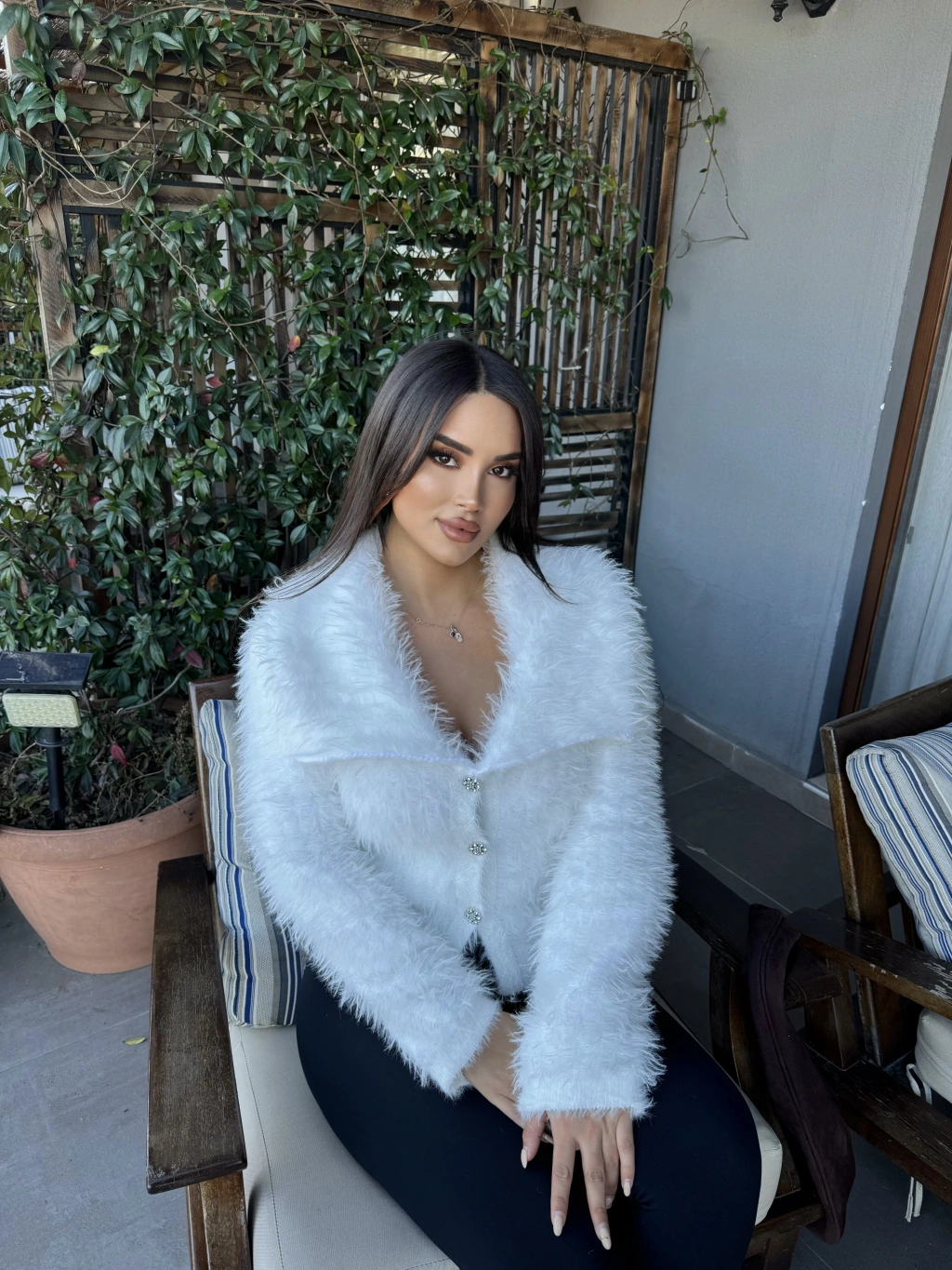 Beyaz Polo Yaka Taşlı Yumoş Kazak