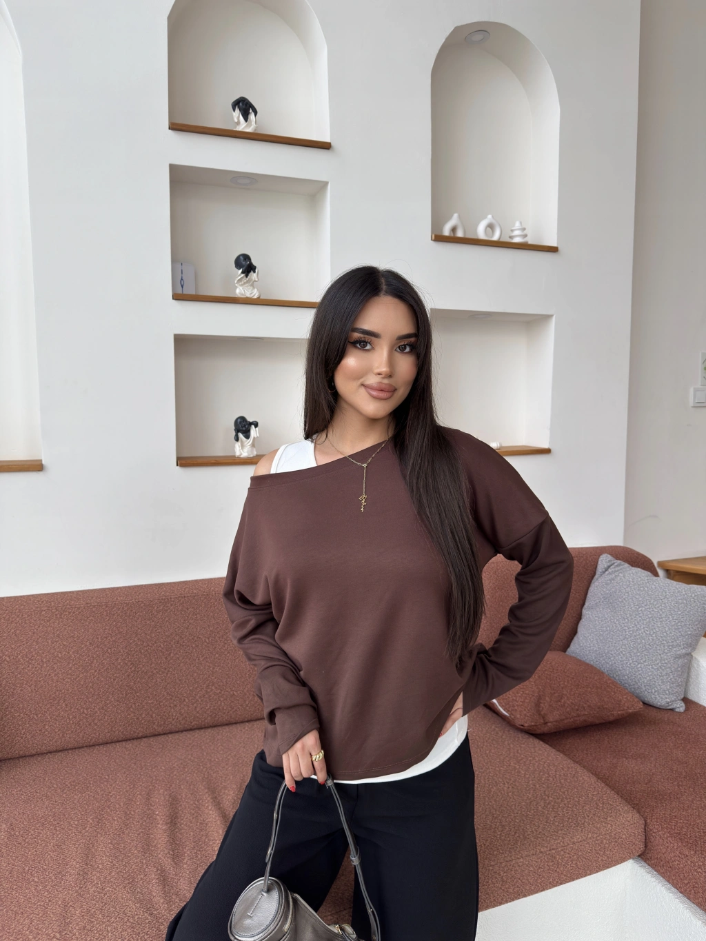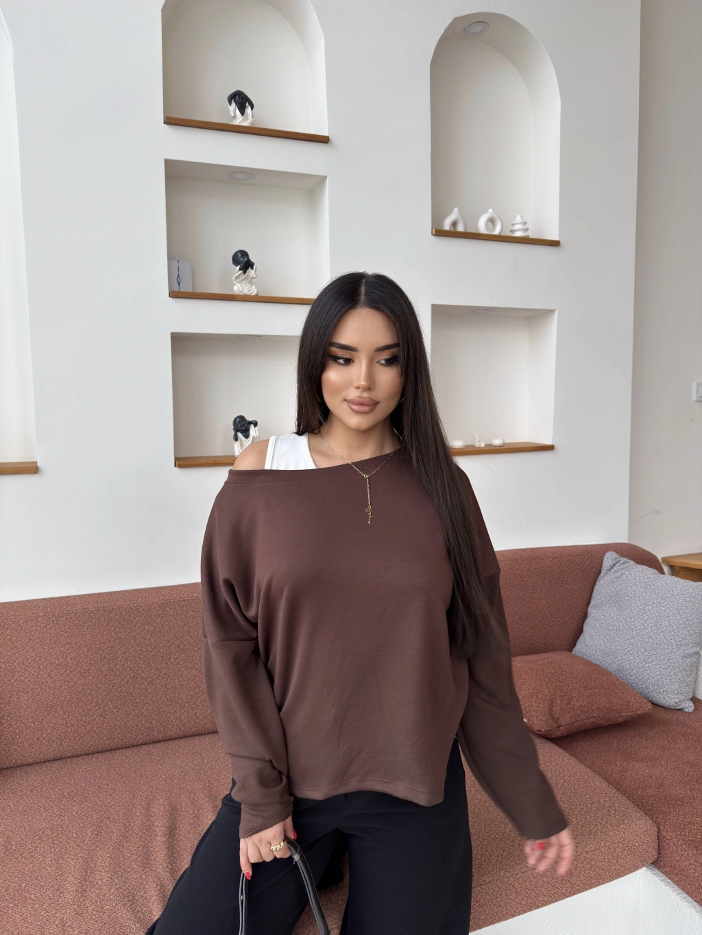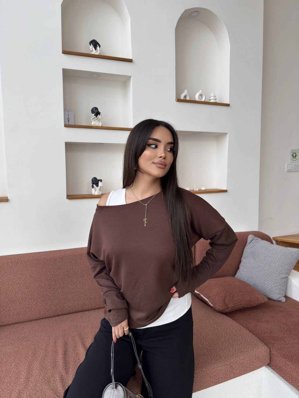 Kahverengi İkili Kayık Yaka Bluz Takım