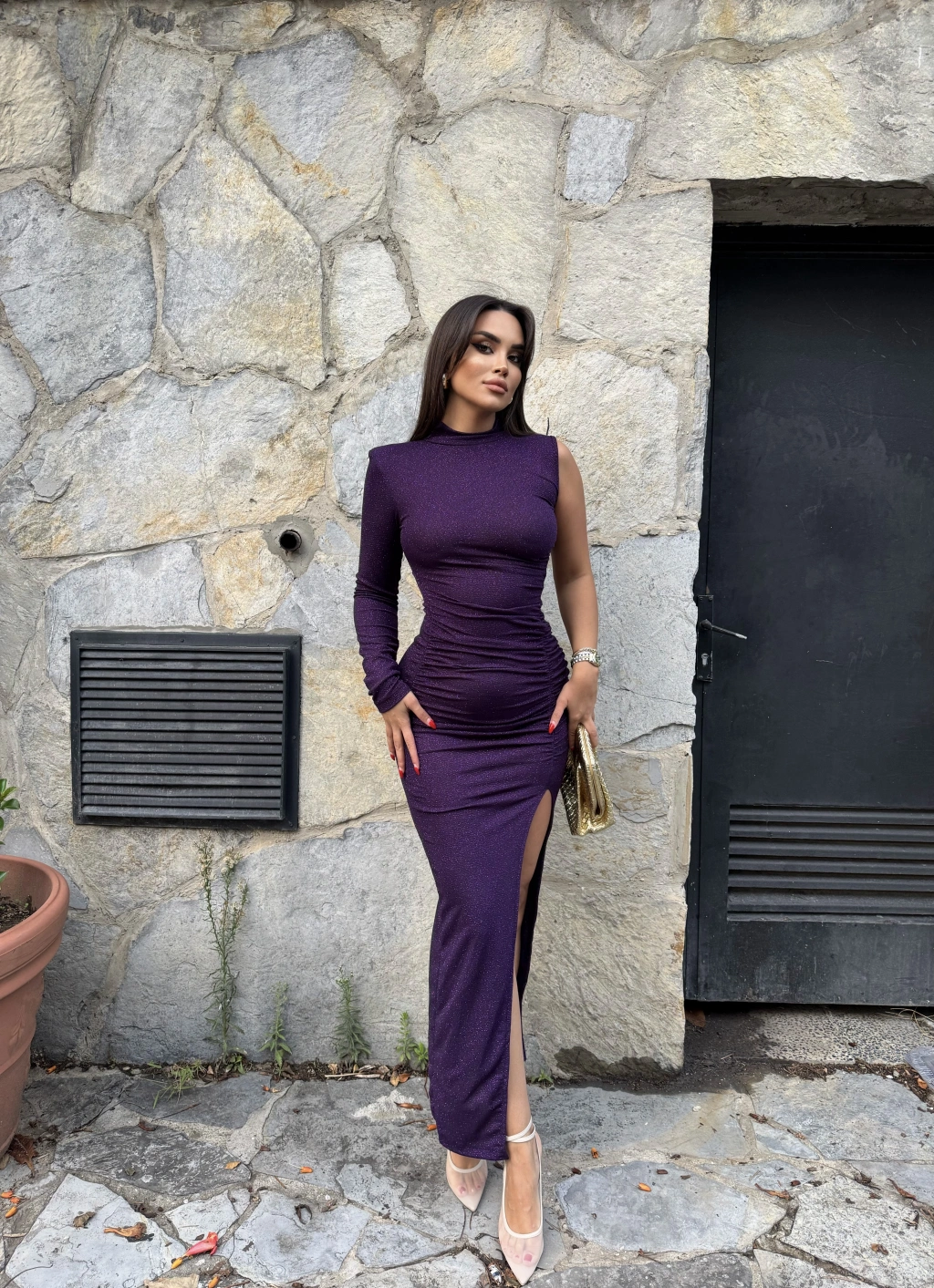 Mor Tek Kol Simli Drapeli Elbise