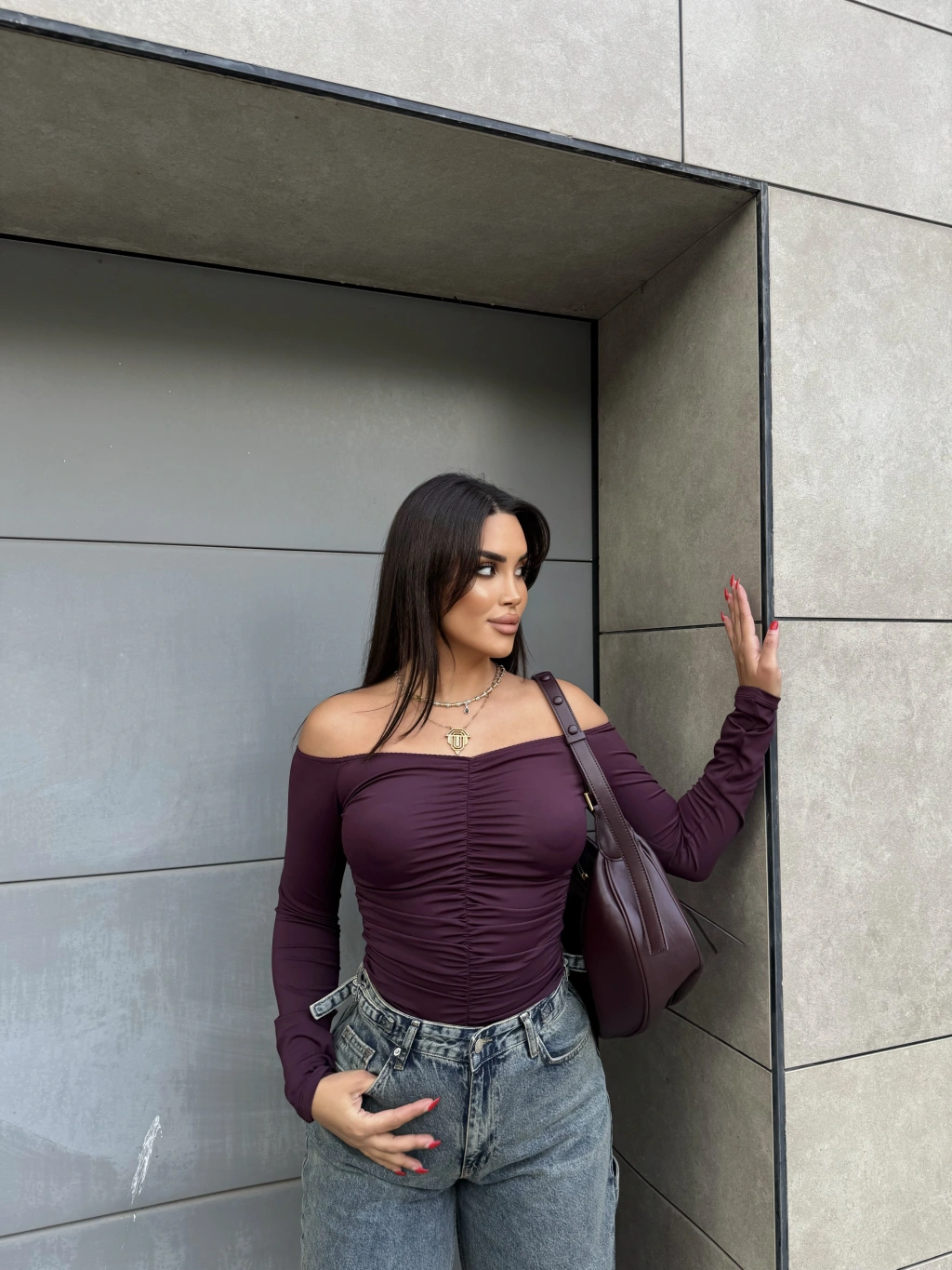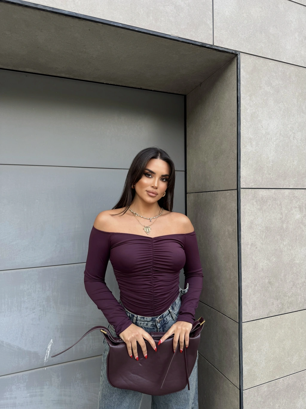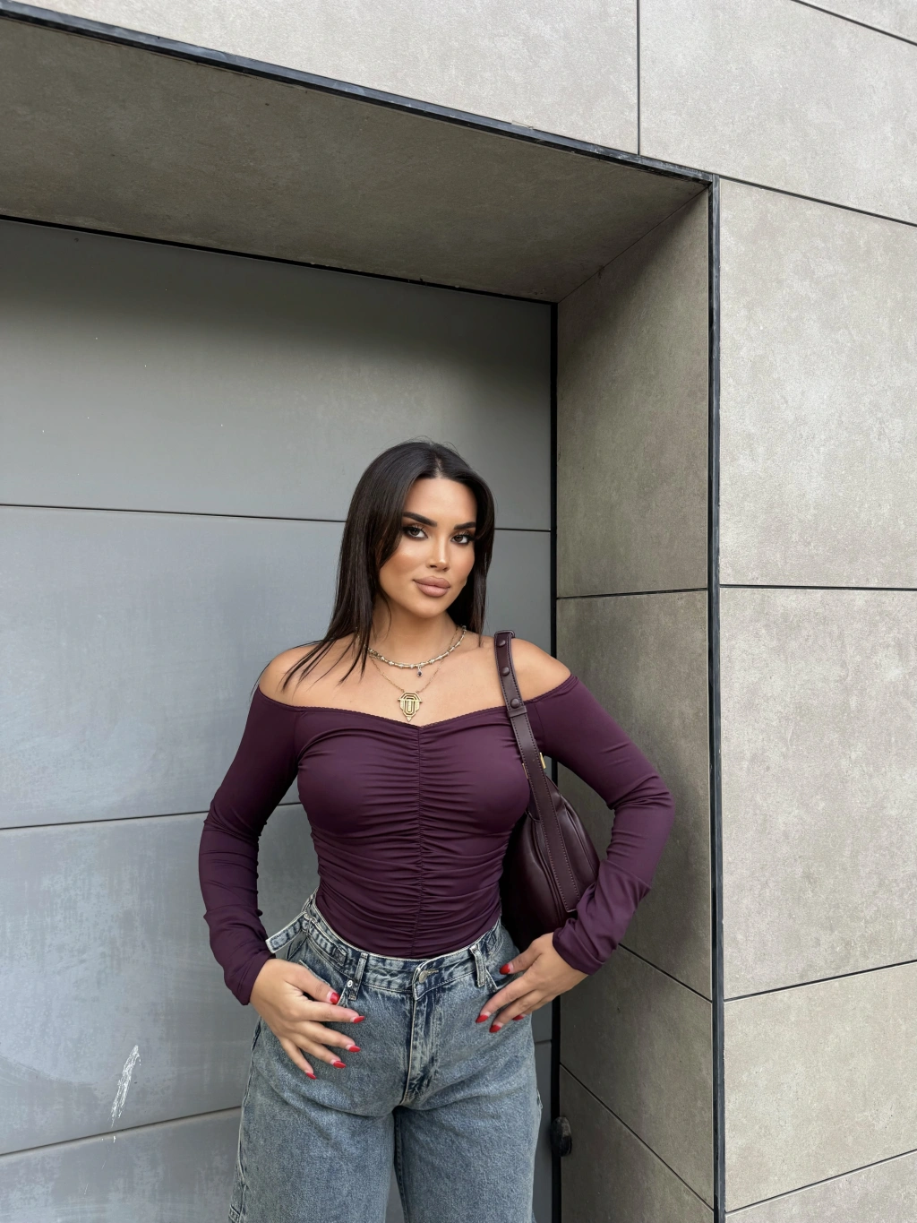 Mürdüm Madonna Yaka Drapeli Bluz