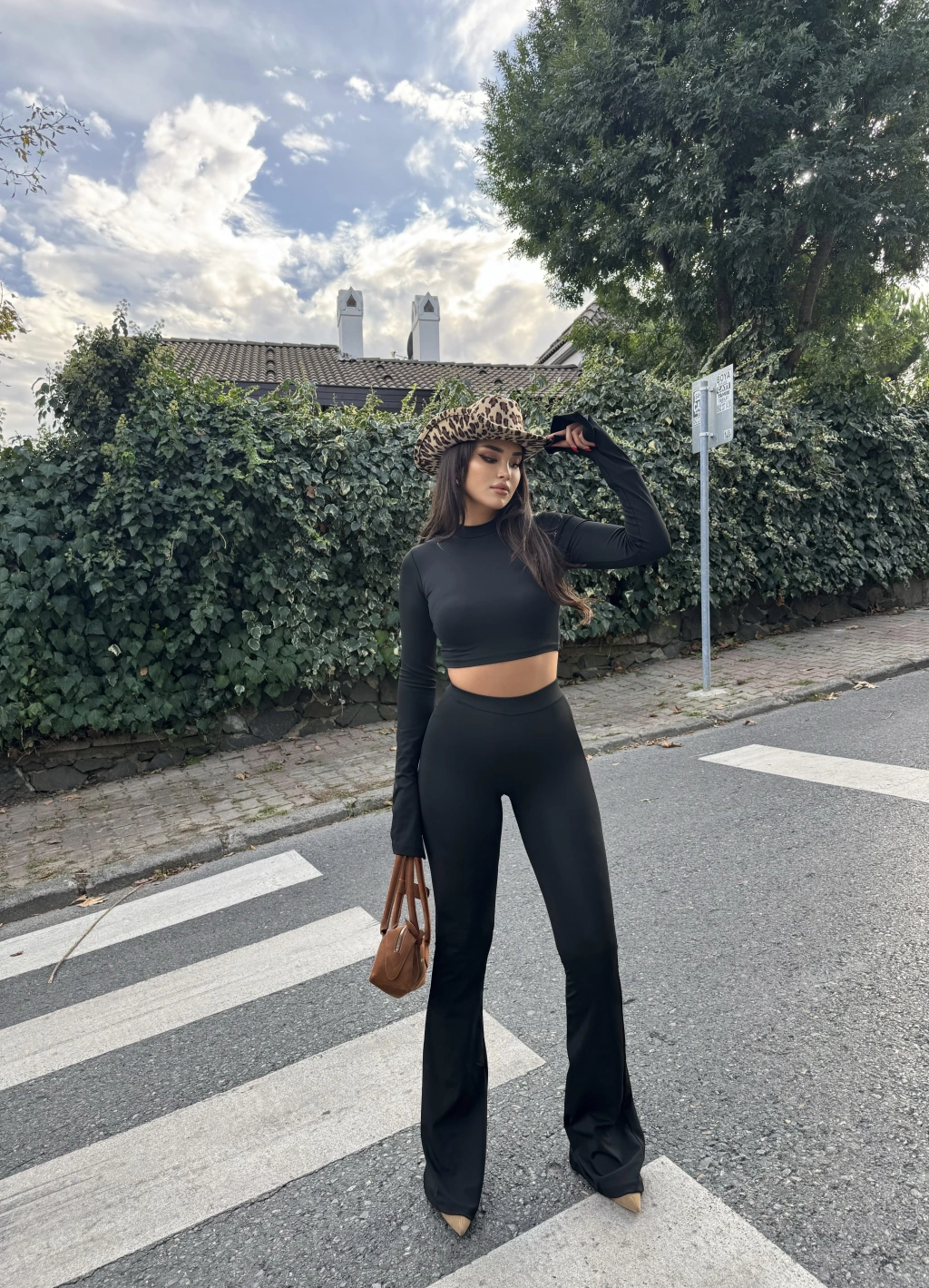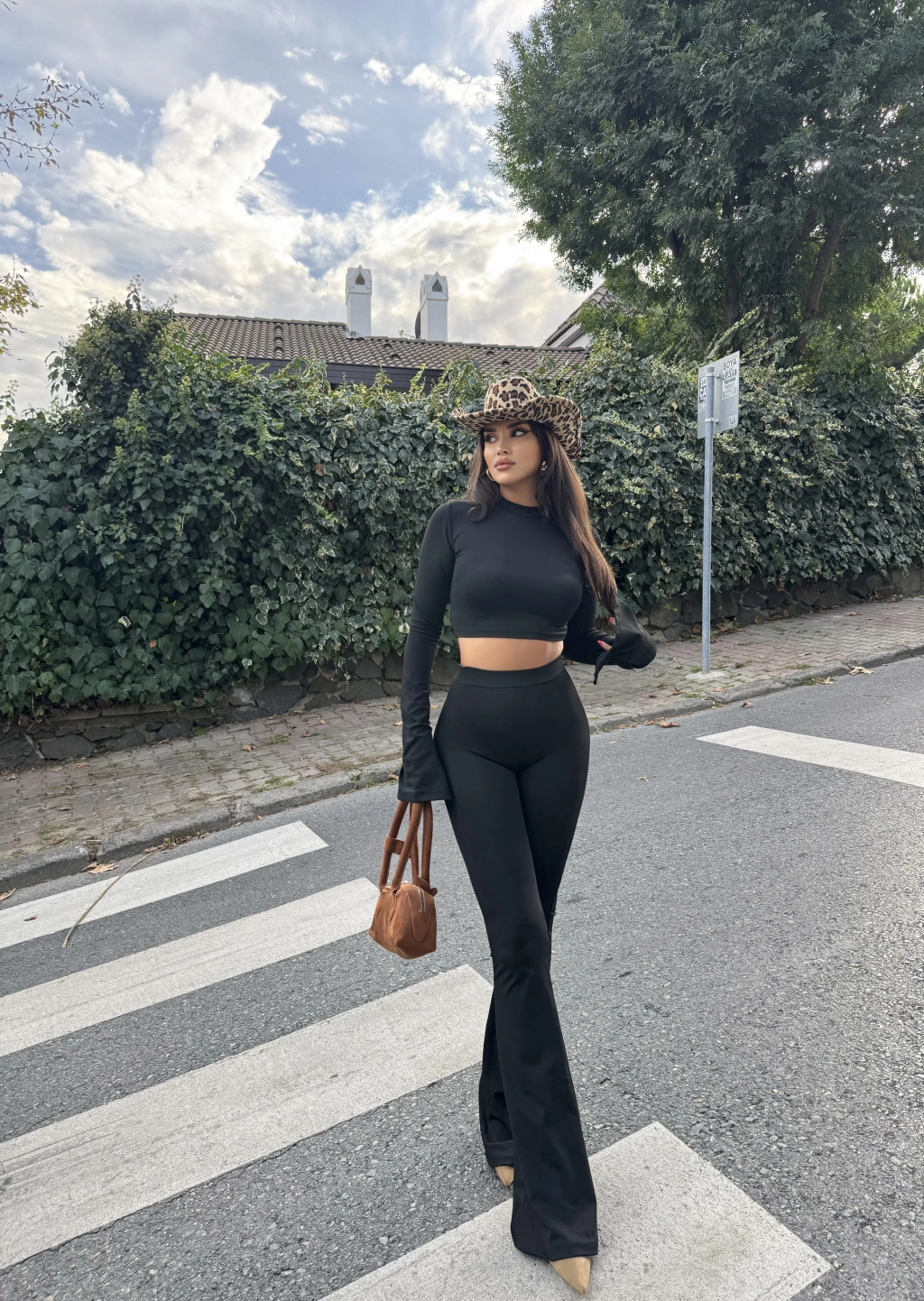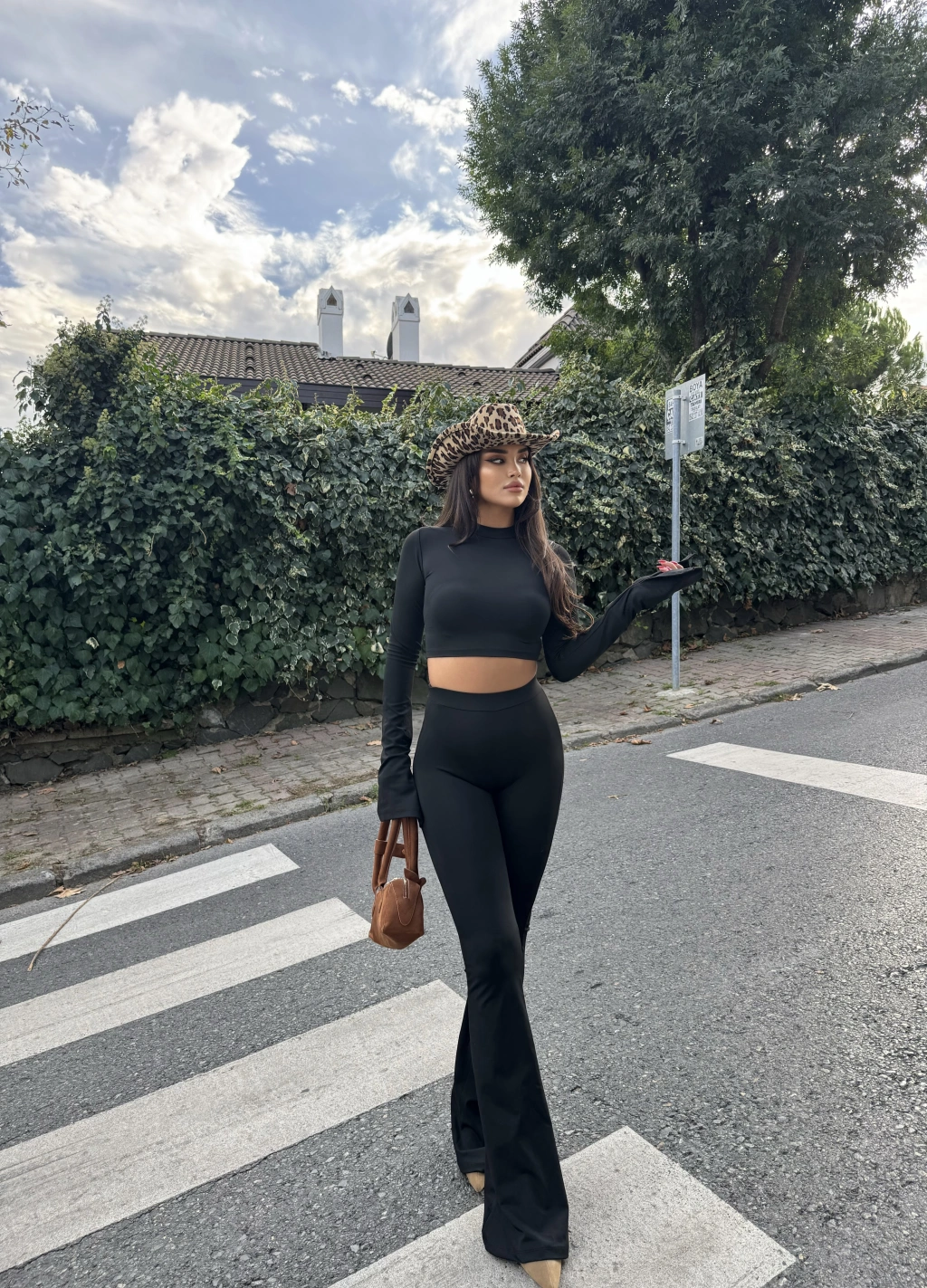 Siyah Balıkçı Yaka İspanyol Kol Crop Tayt Takım