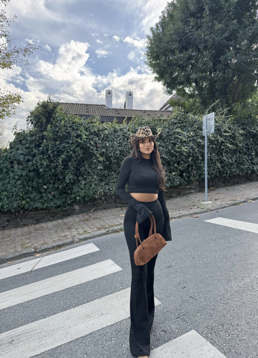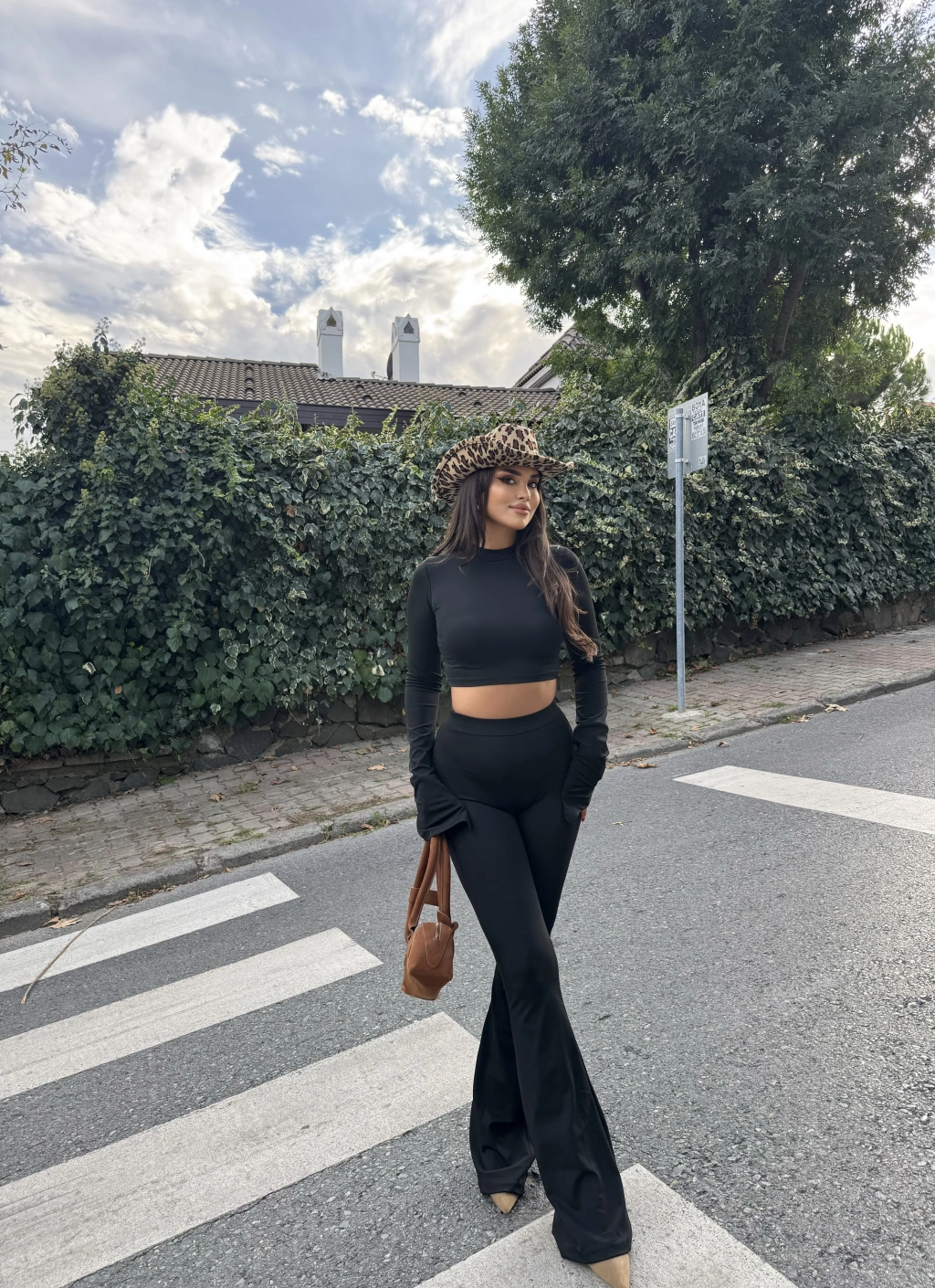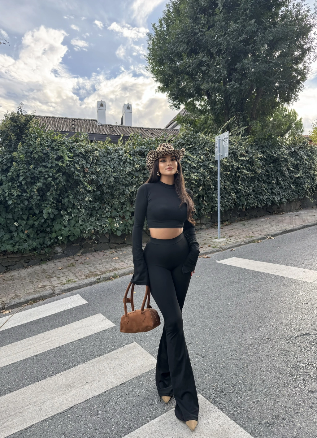 Siyah Balıkçı Yaka İspanyol Kol Crop Tayt Takım