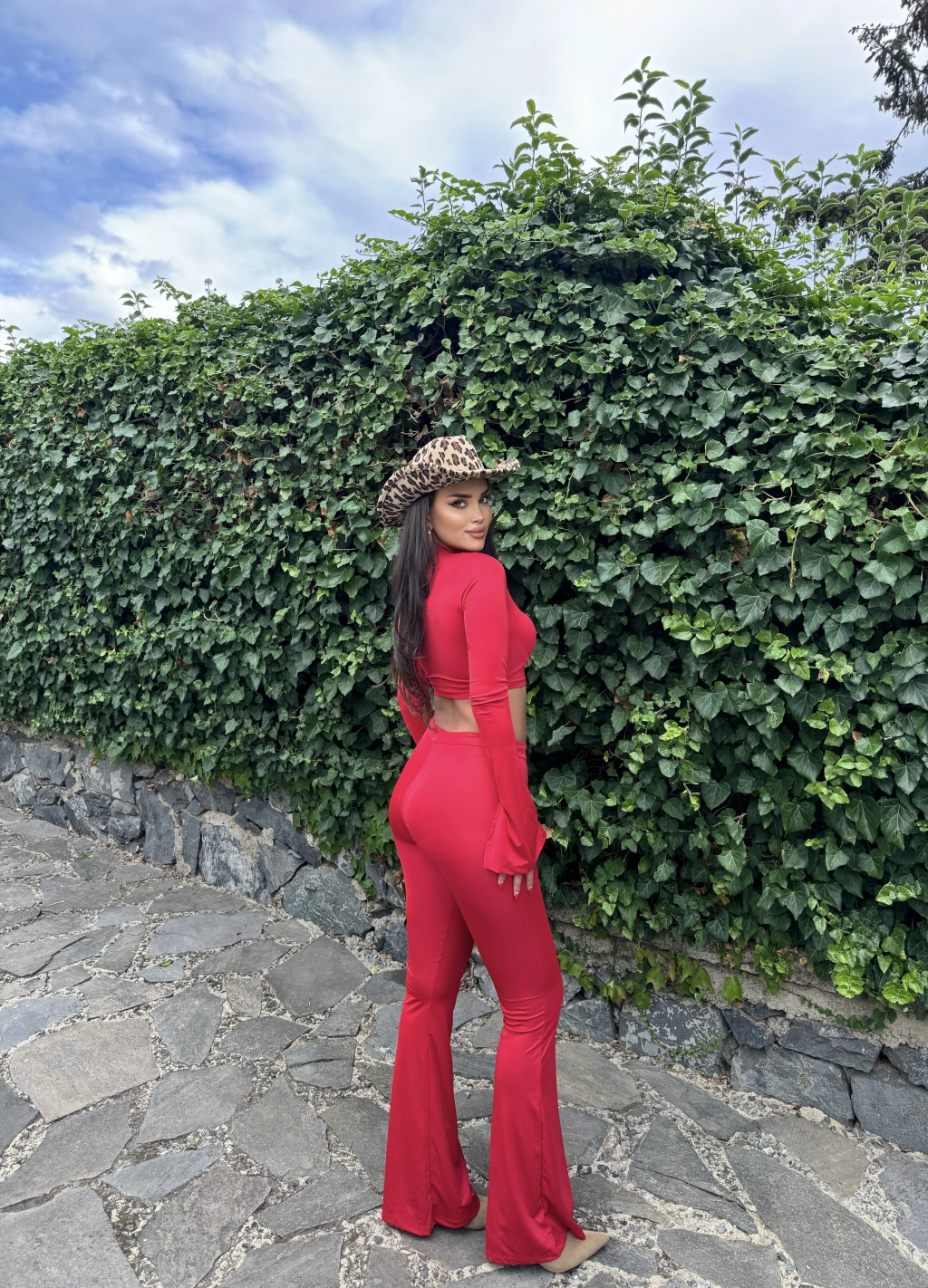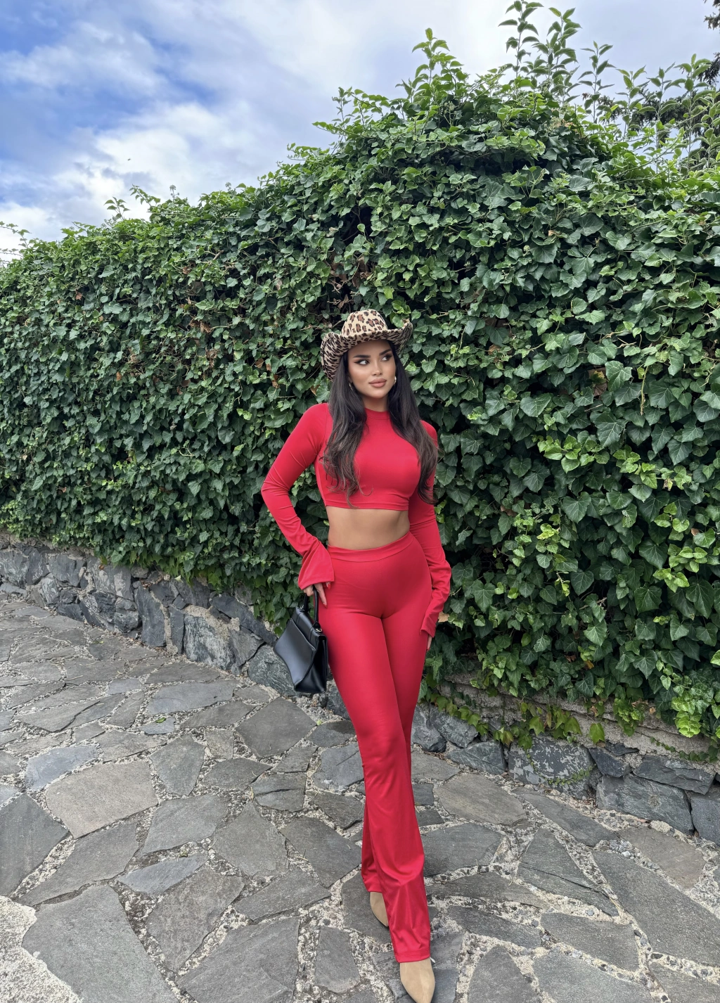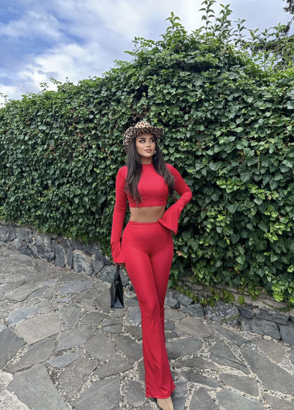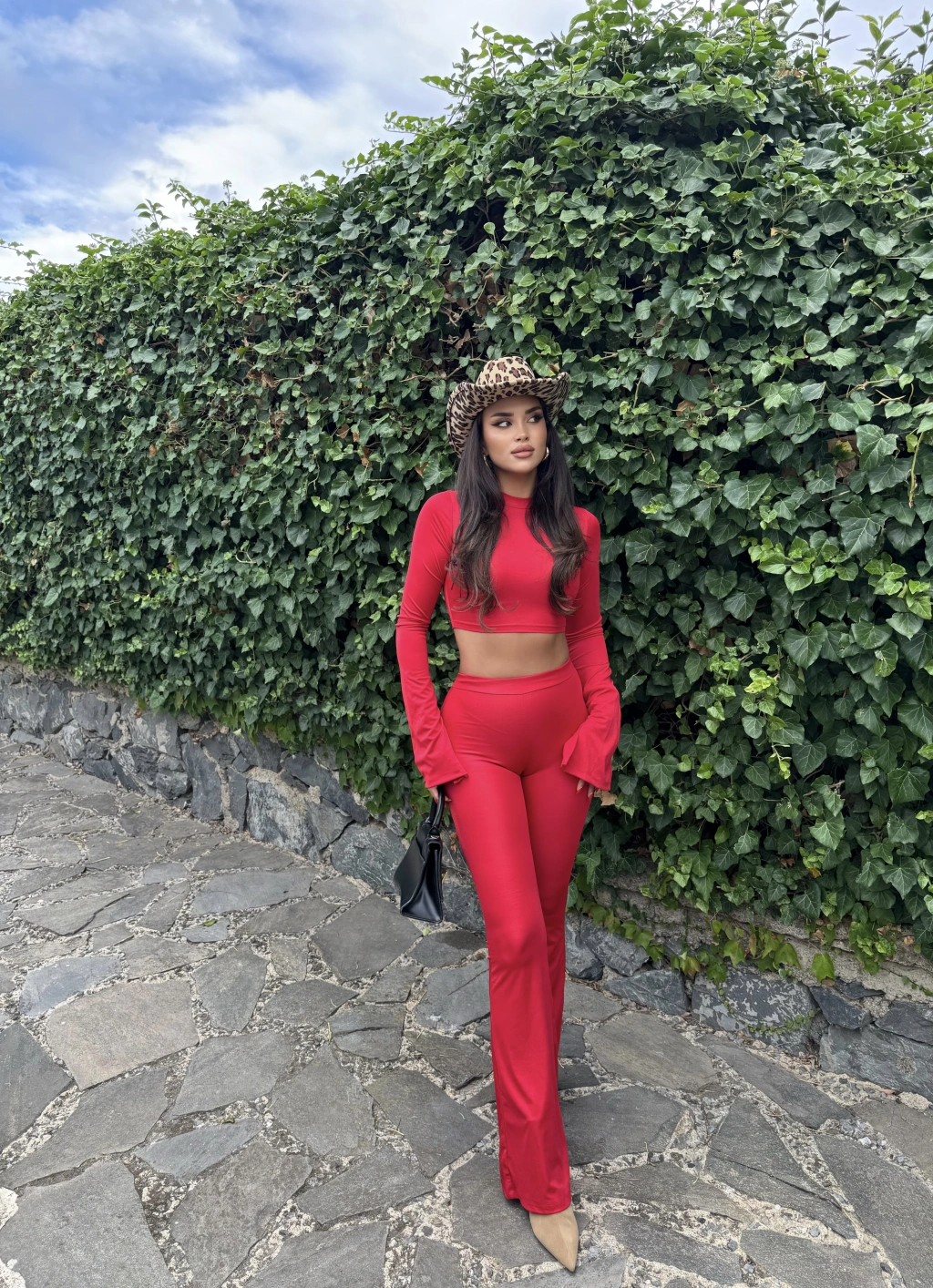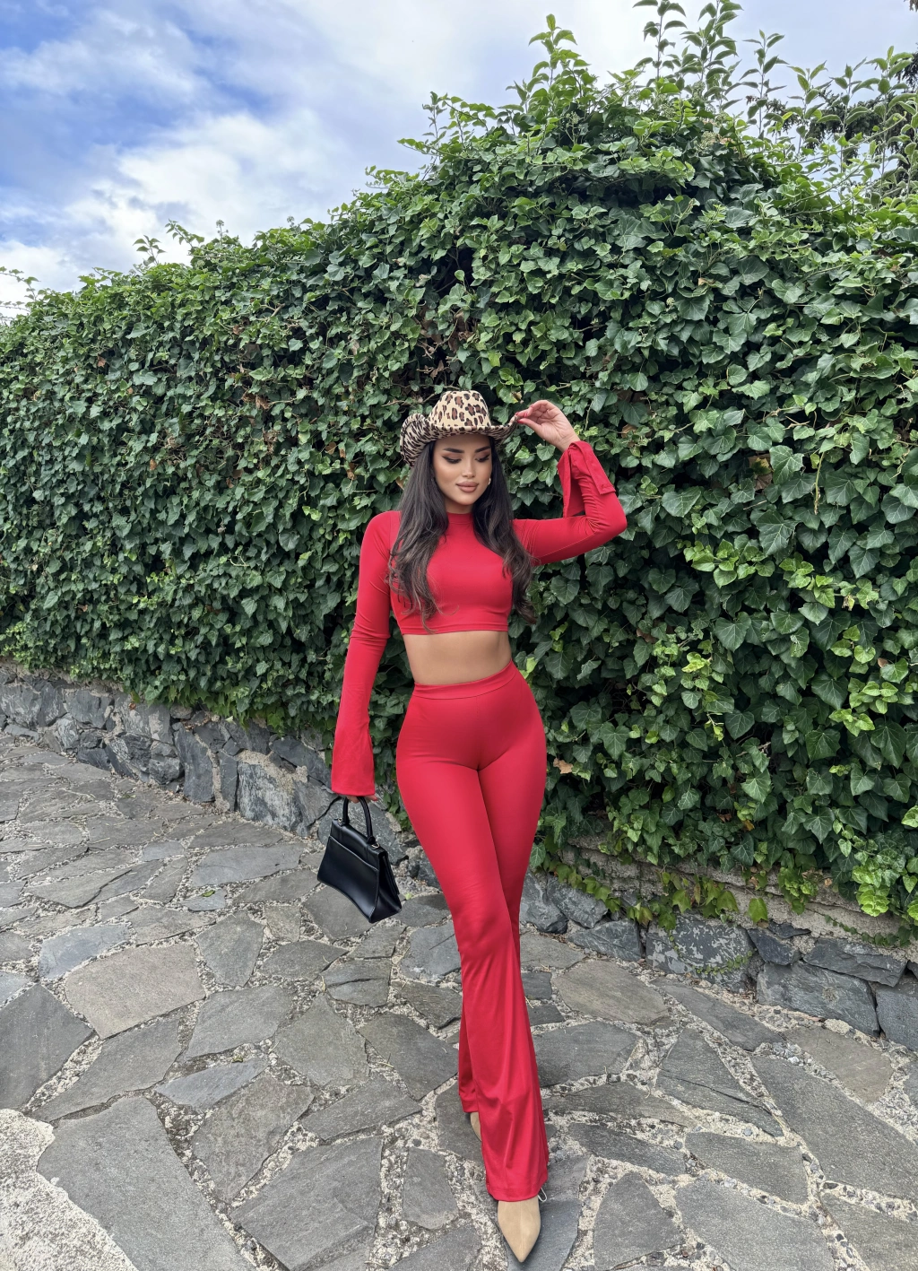Kırmızı Balıkçı Yaka İspanyol Kol Crop Tayt Takım
