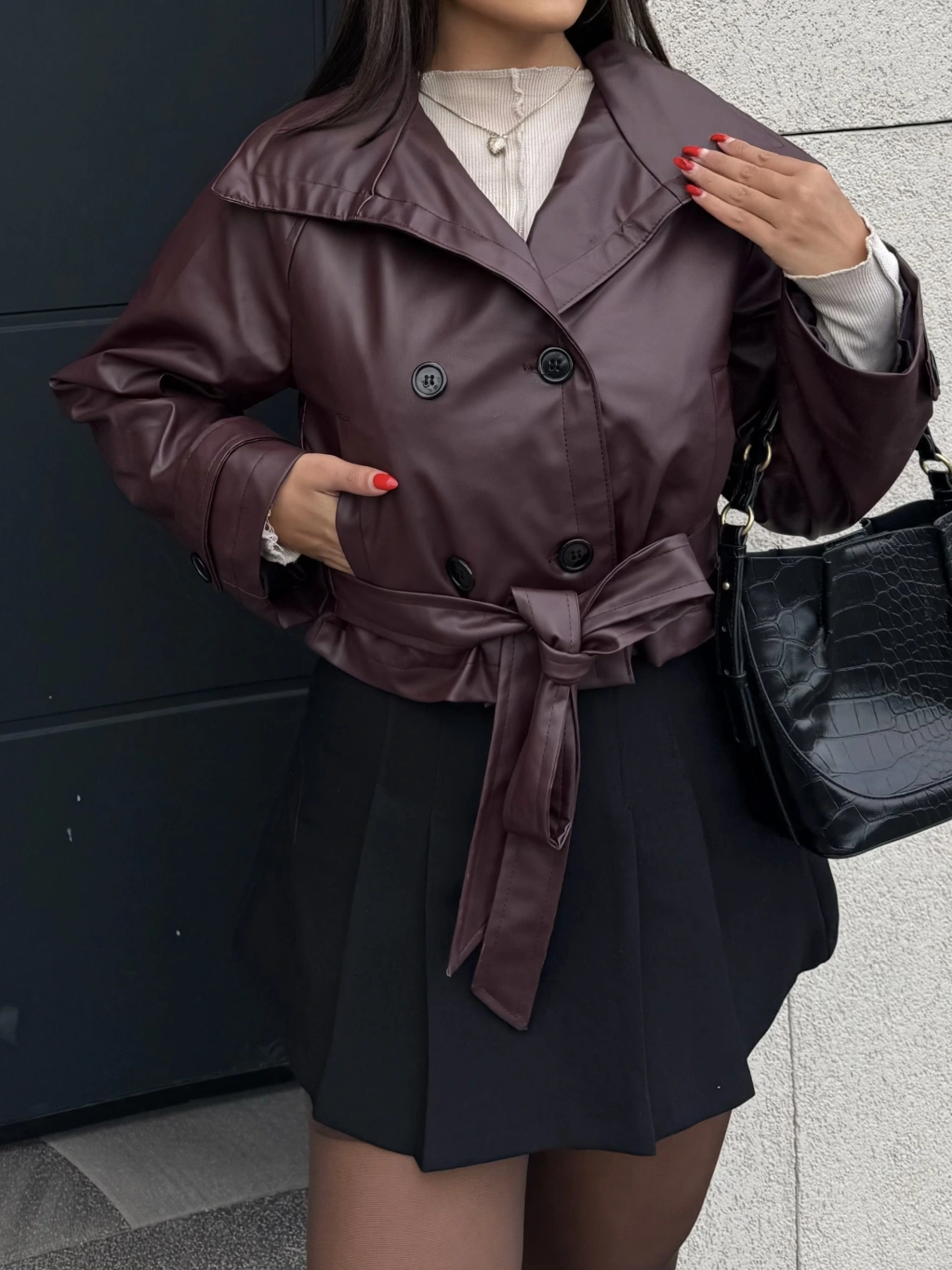 Bordo Kısa Kuşaklı Deri Mont