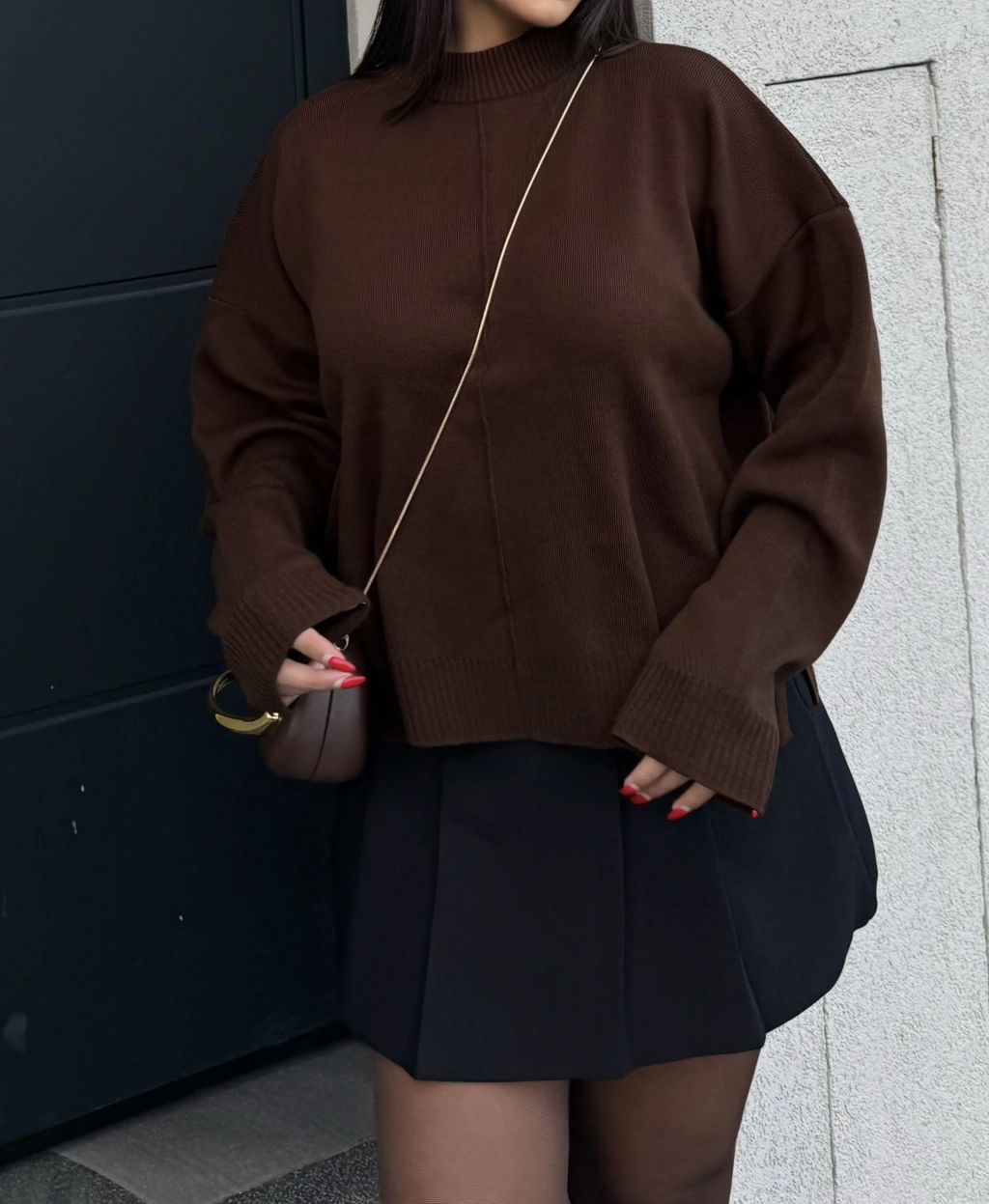 Kahverengi Yırtmaç Detay Basic Oversize Kazak
