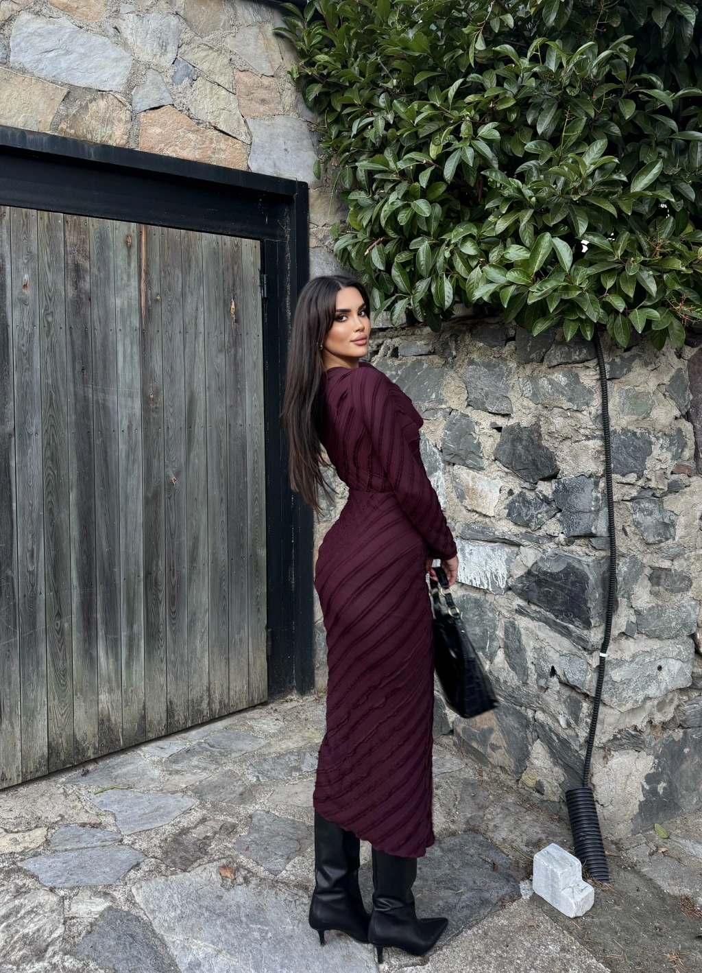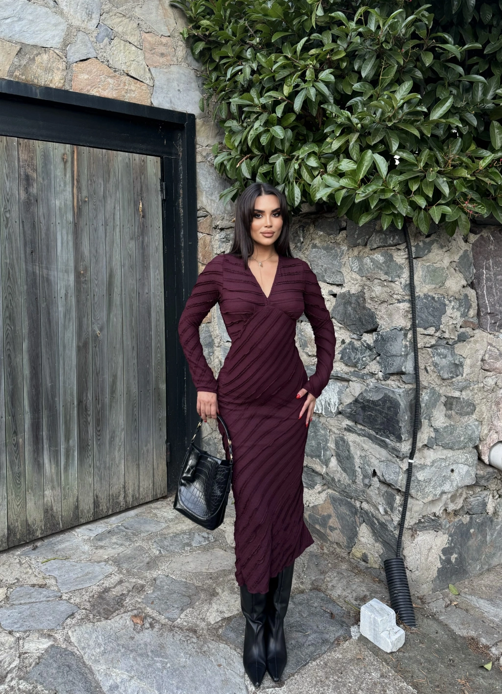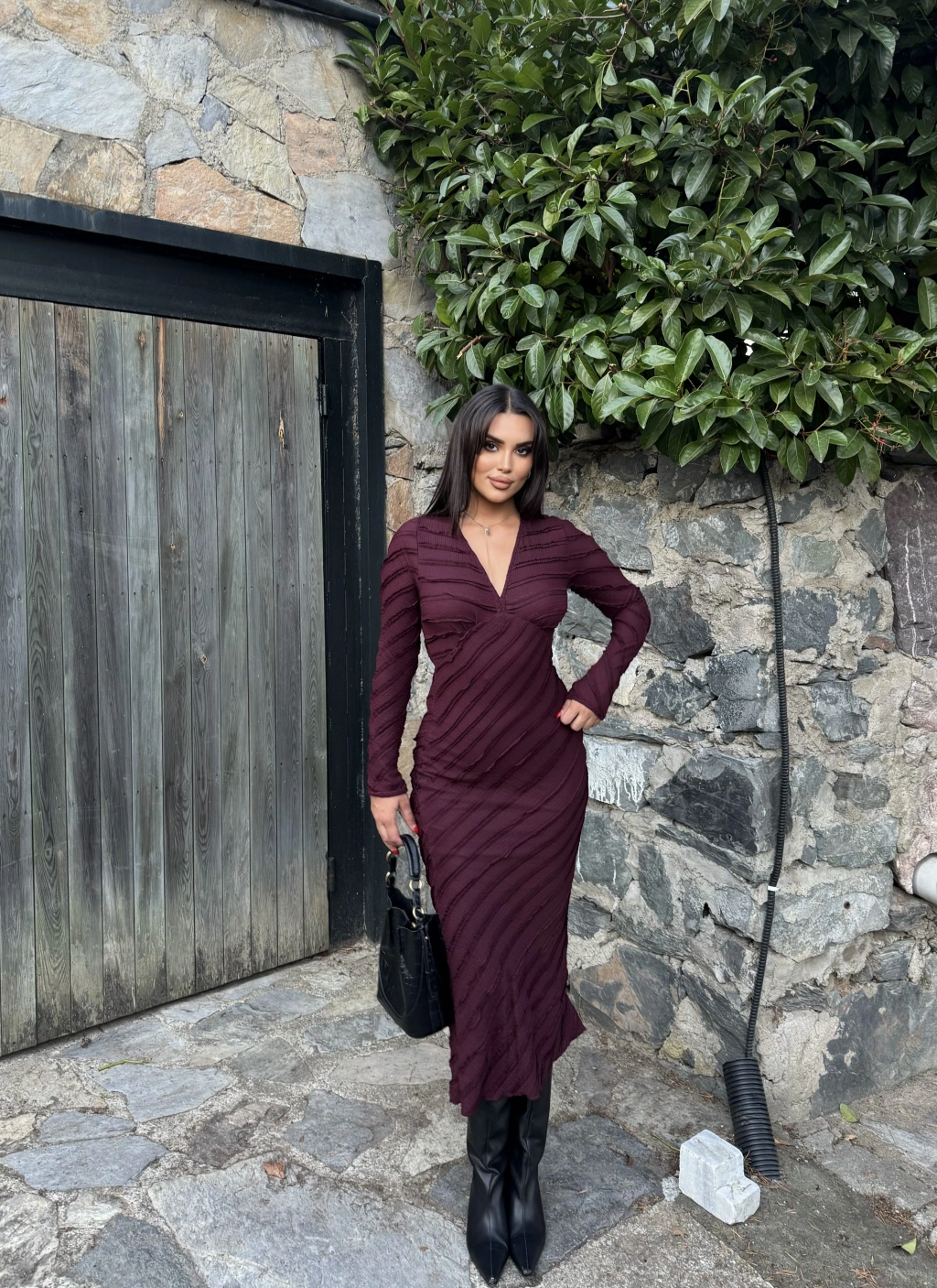 Mürdüm Fırfırlı Uzun Elbise