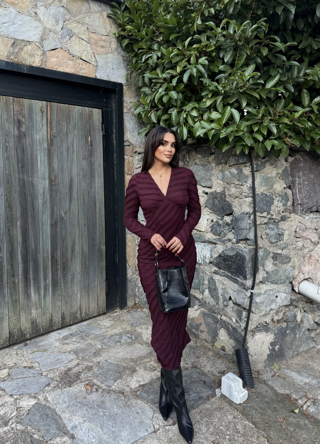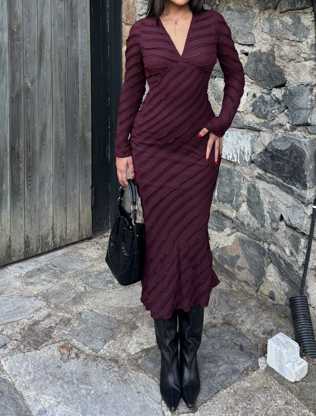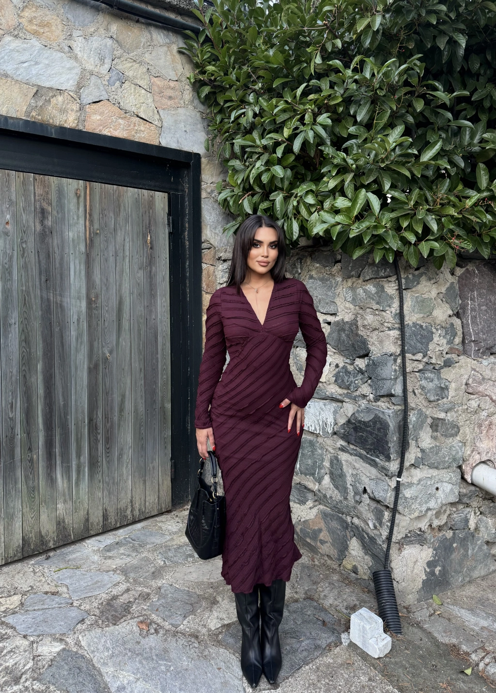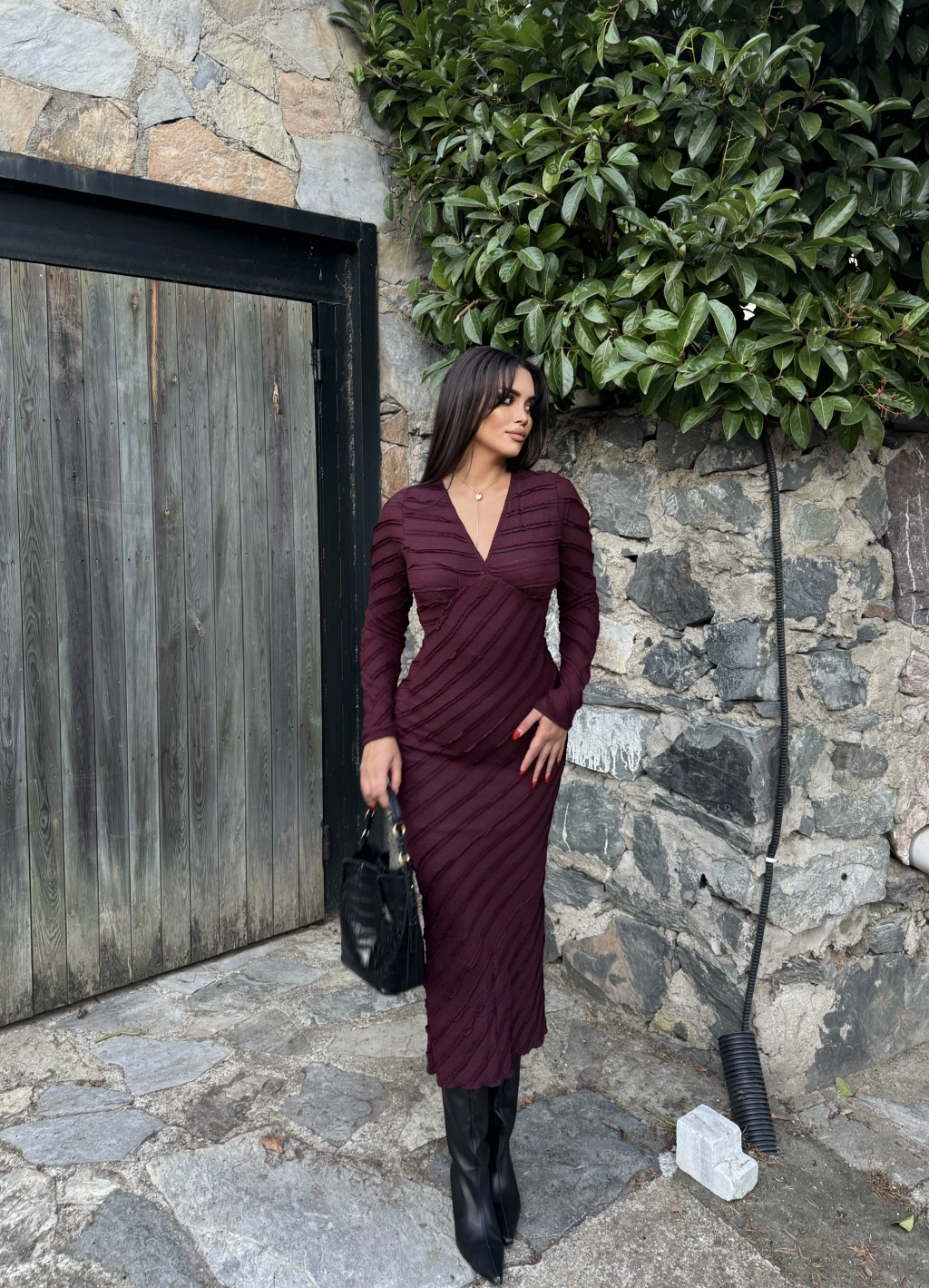 Mürdüm Fırfırlı Uzun Elbise
