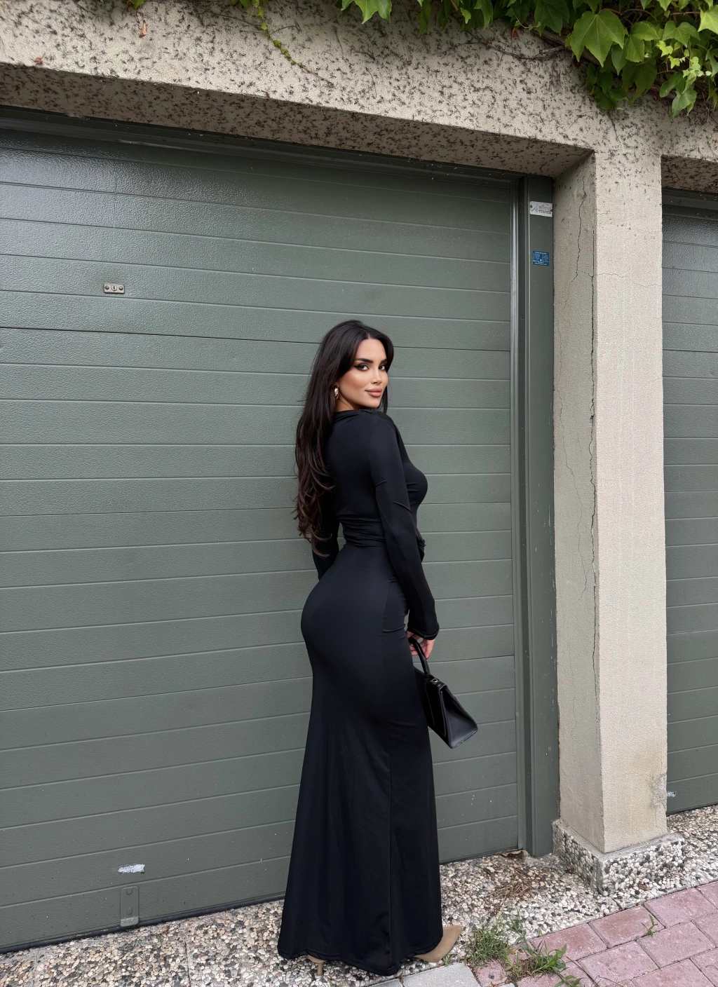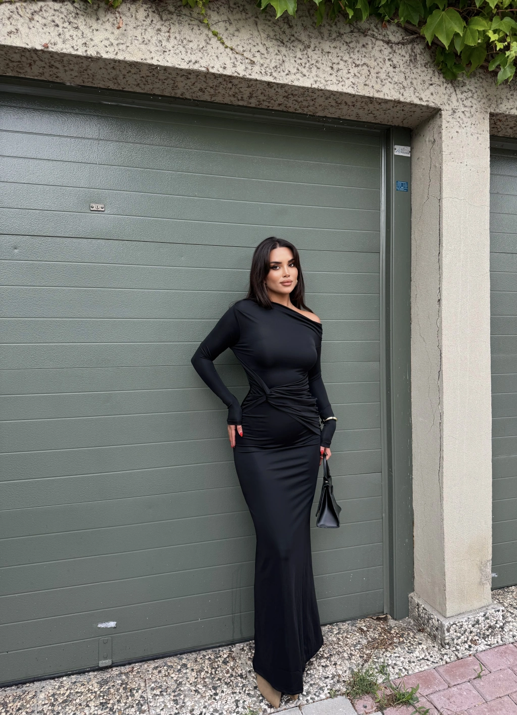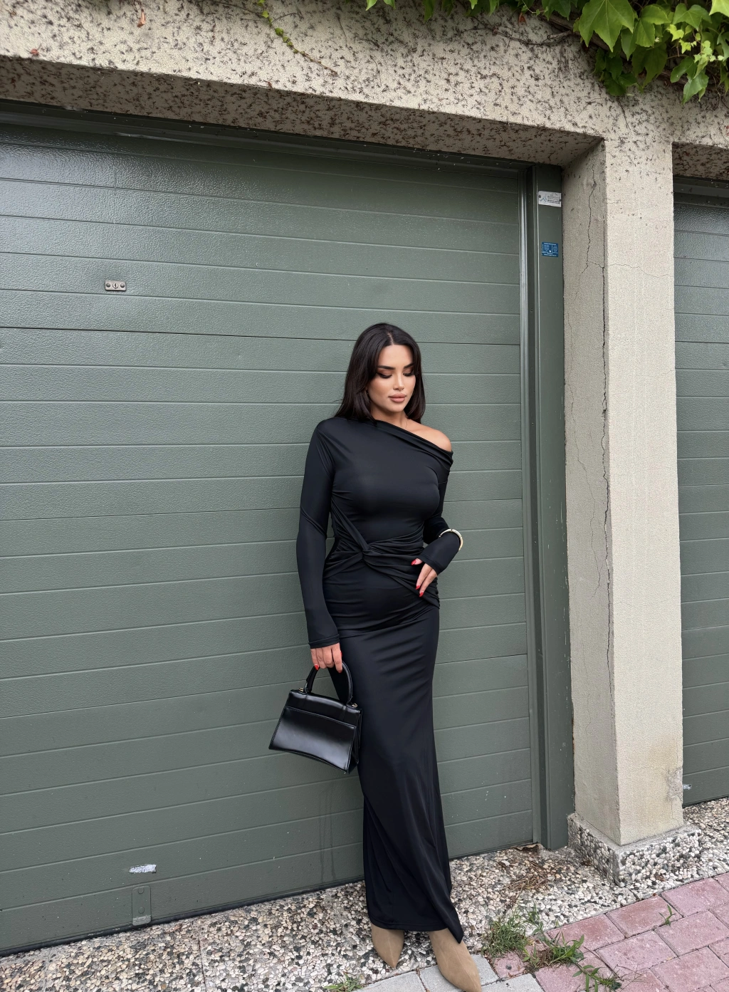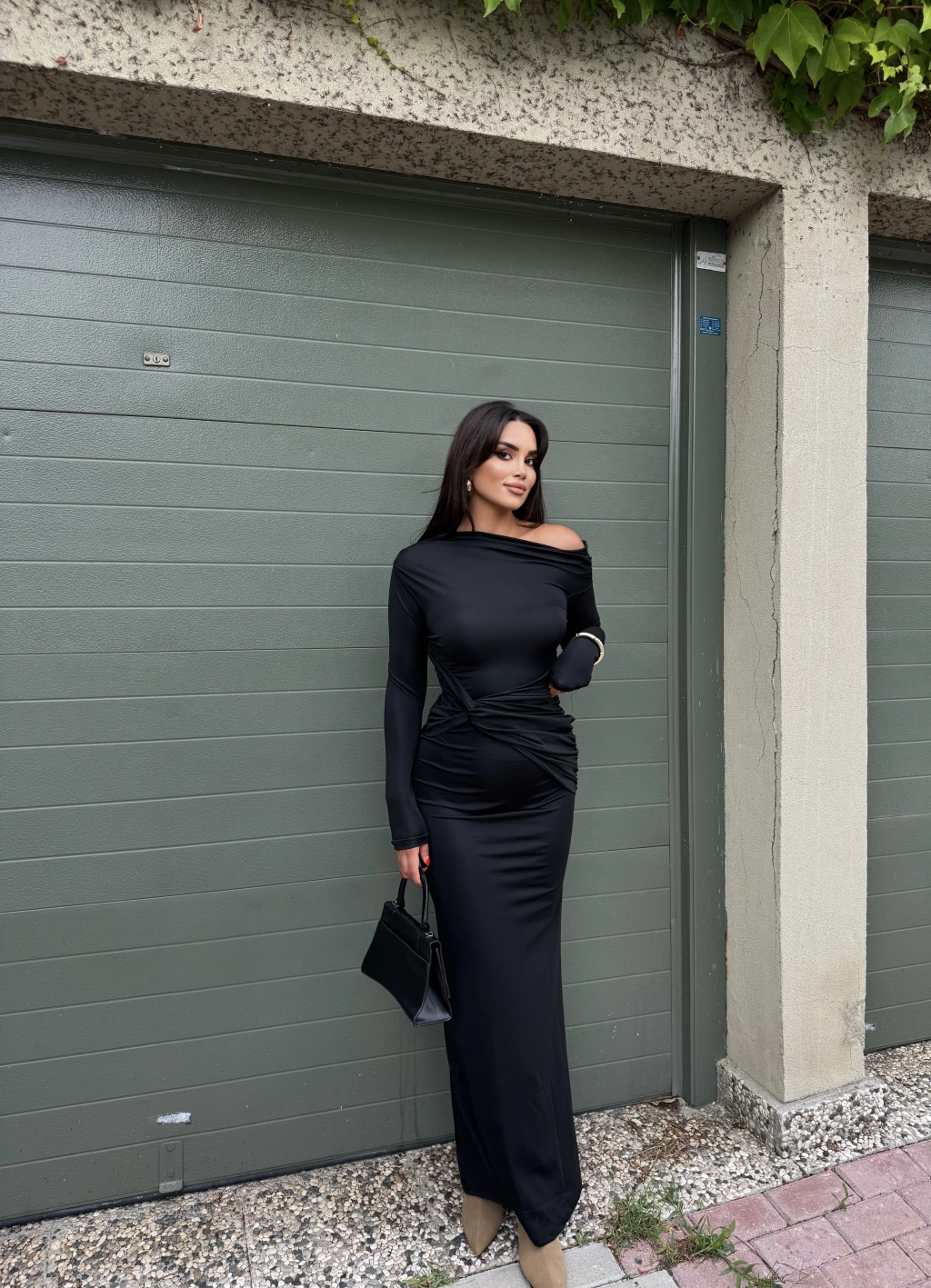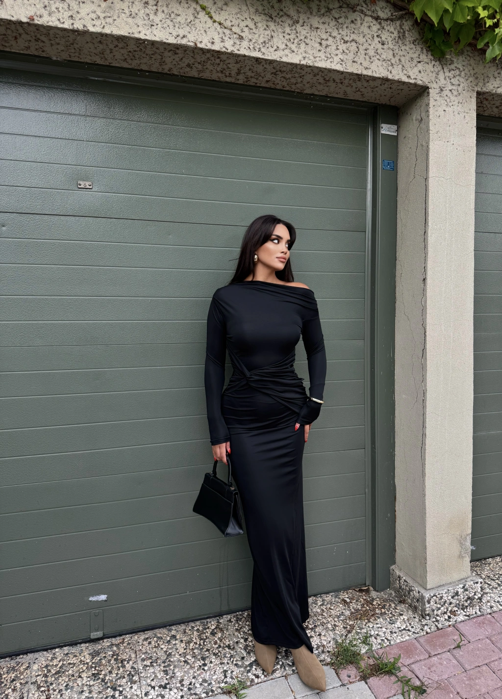 Siyah Omuz Detay Tasarım Uzun Elbise