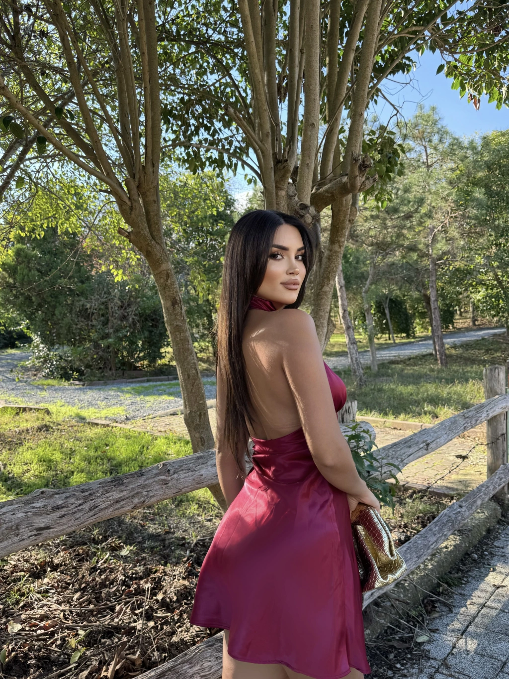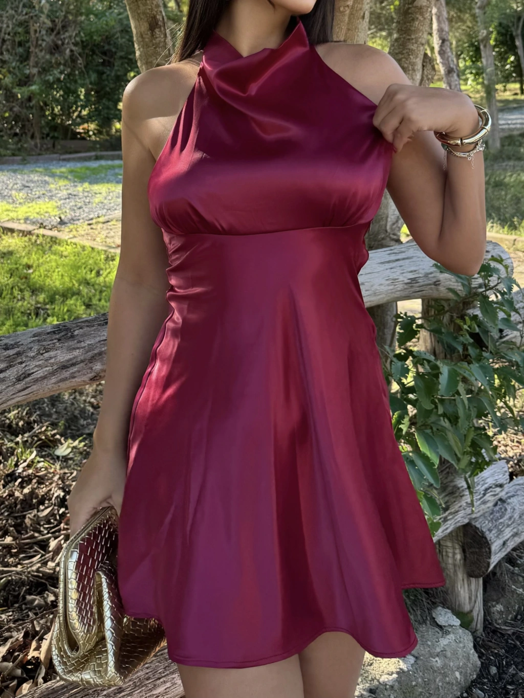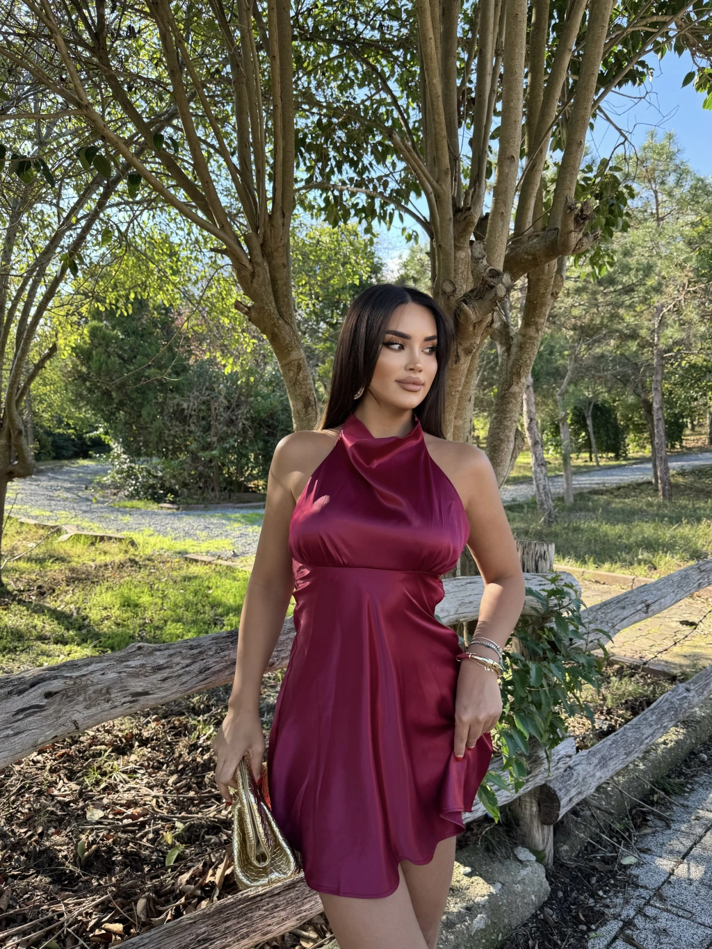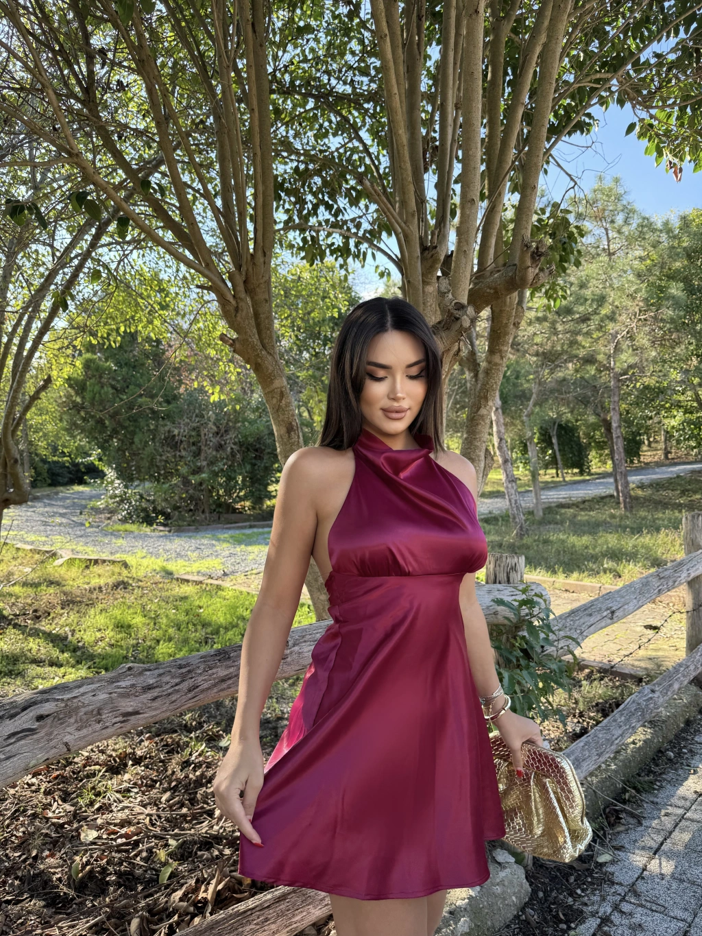 Bordo Saten Sırt Detay Mini Elbise