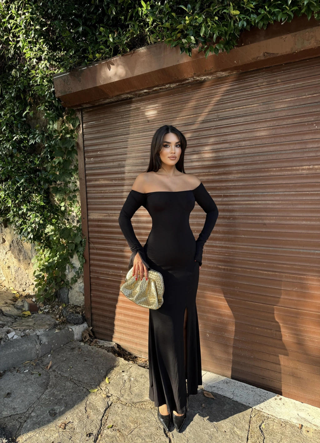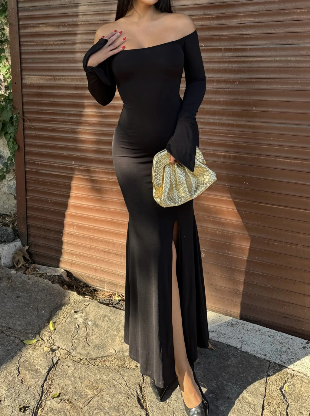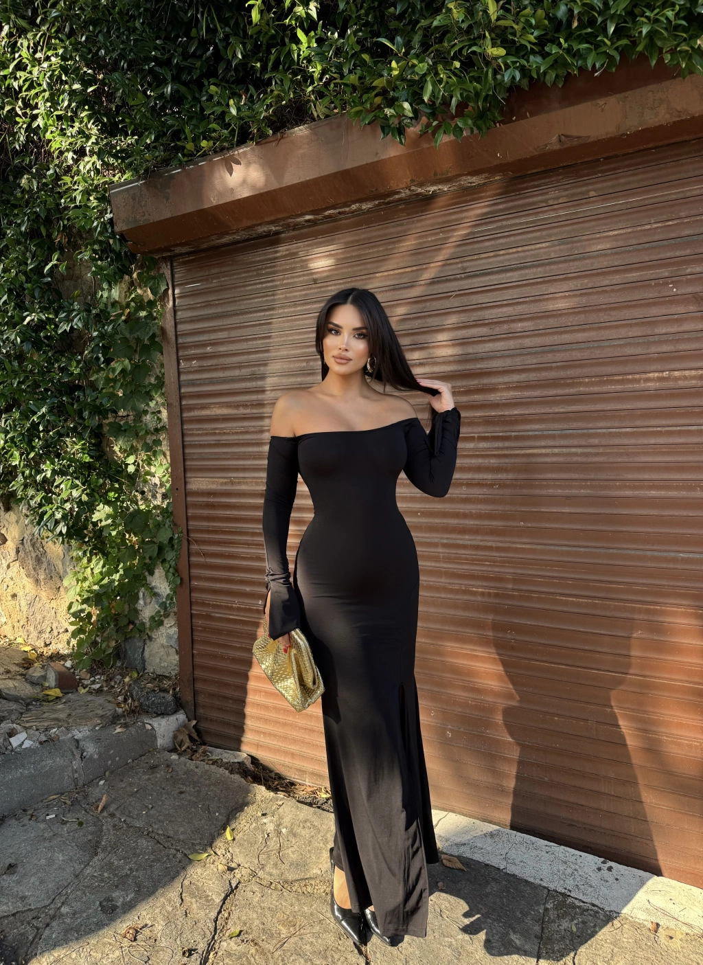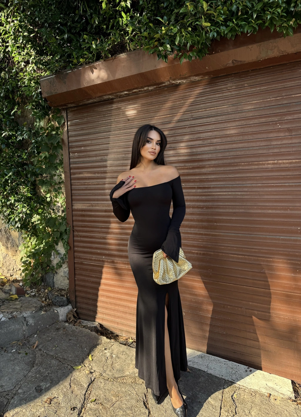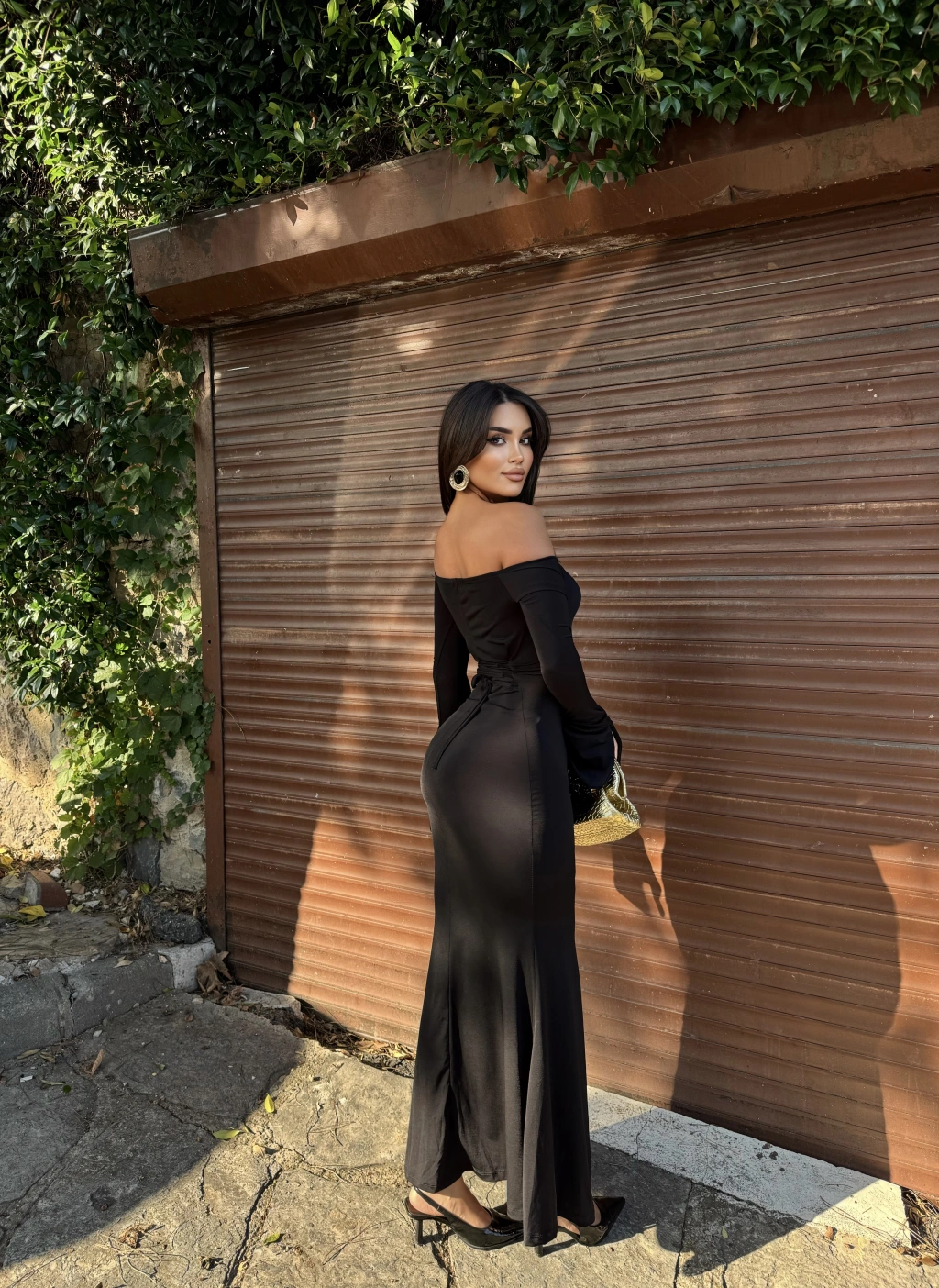 Siyah Sırt Bağlama Detay Uzun Elbise