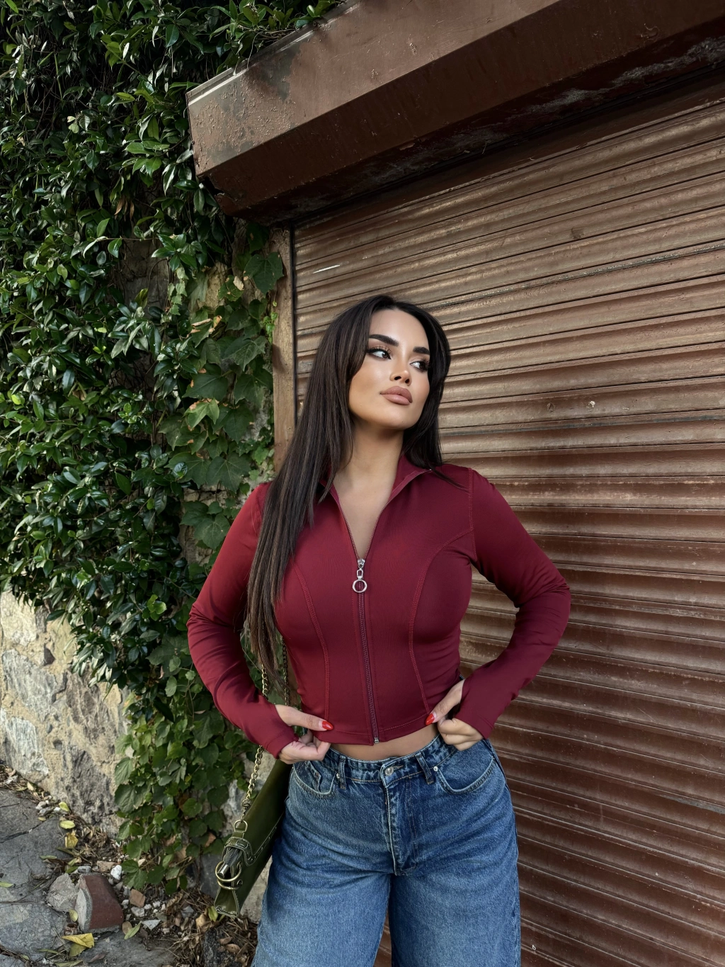 Bordo Slim Fit Fermuarlı Body