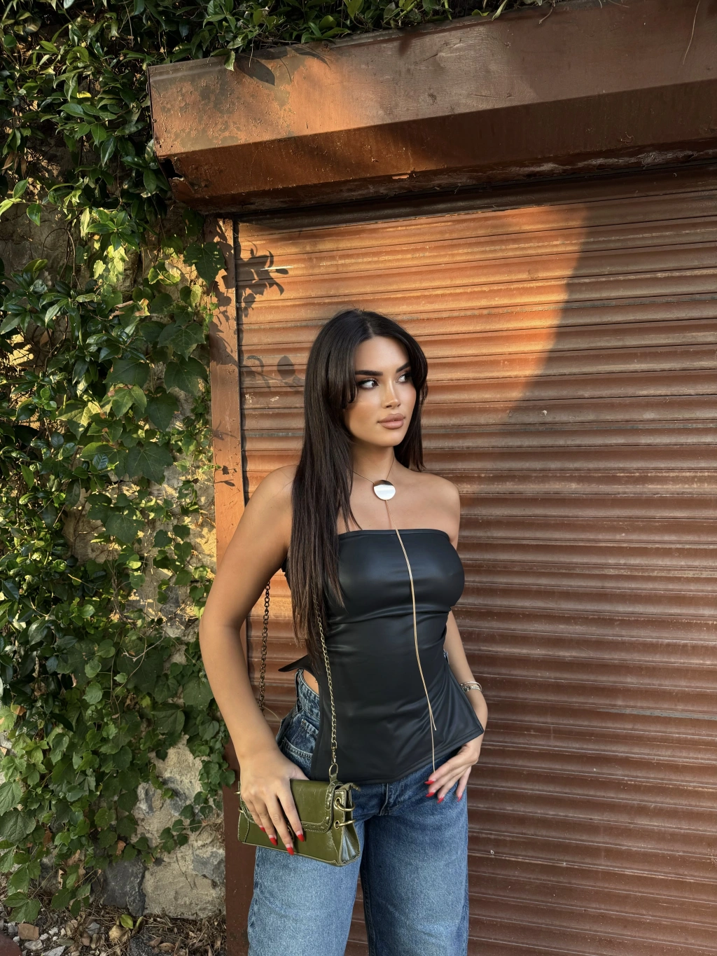 Siyah Straplez Yırtmaç Detay Deri Crop