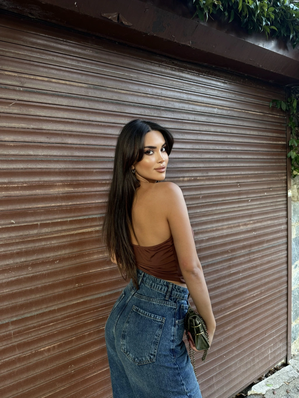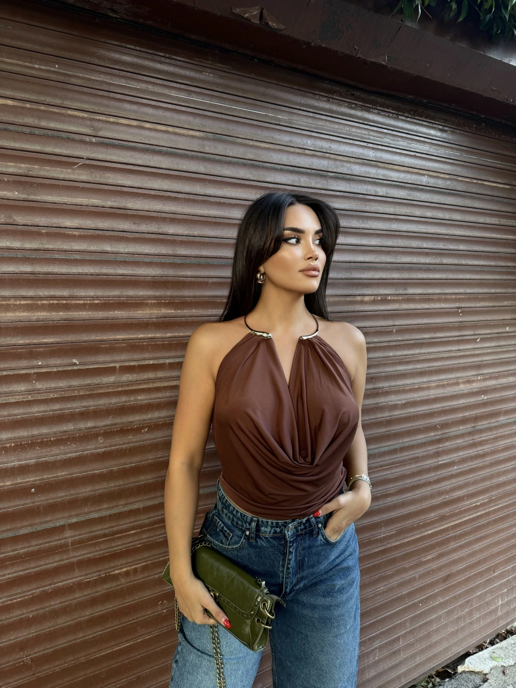 Kahverengi Degaje Yaka Boyun Aksesuarlı Bluz