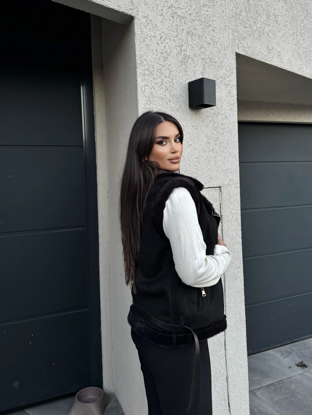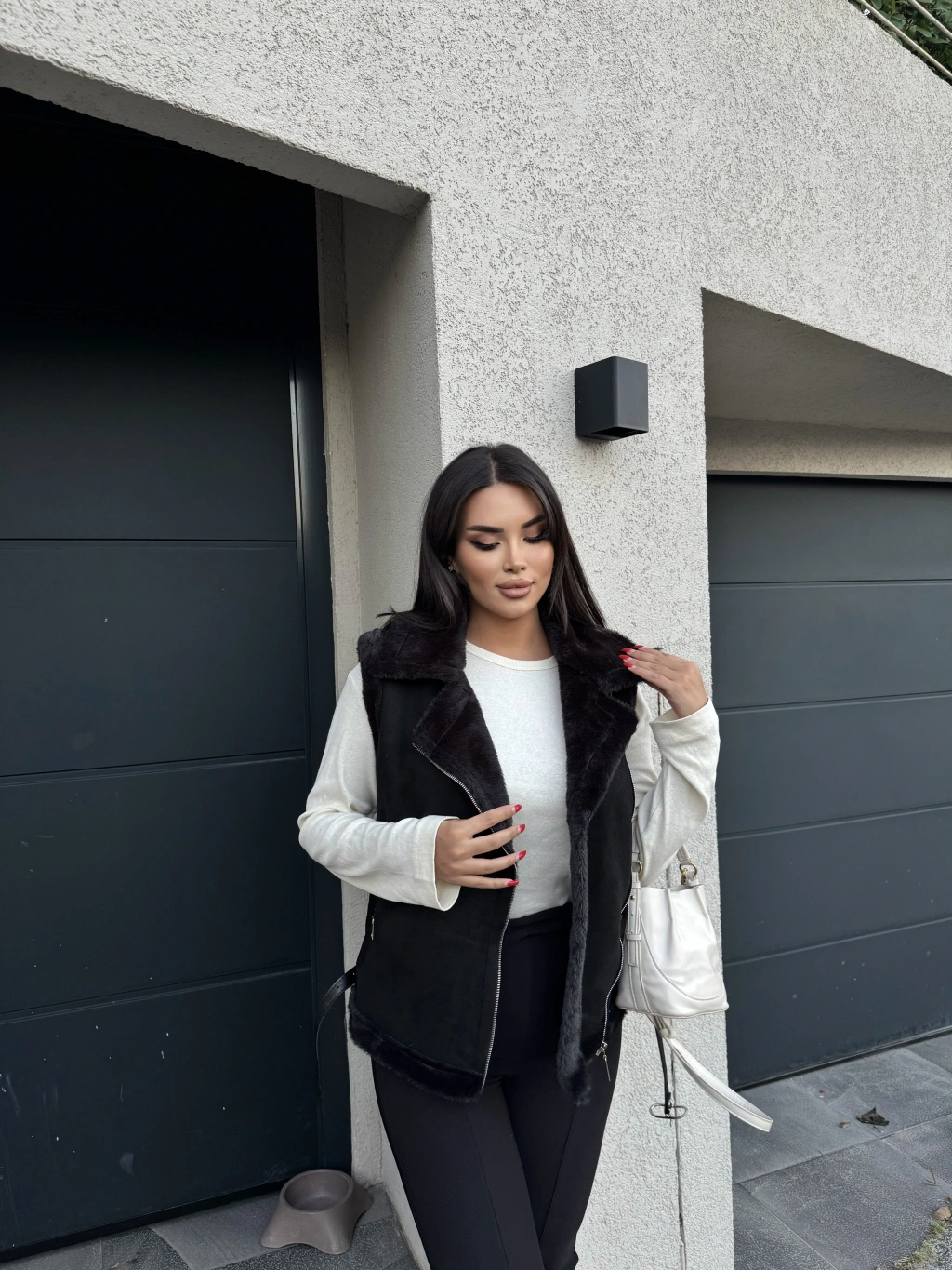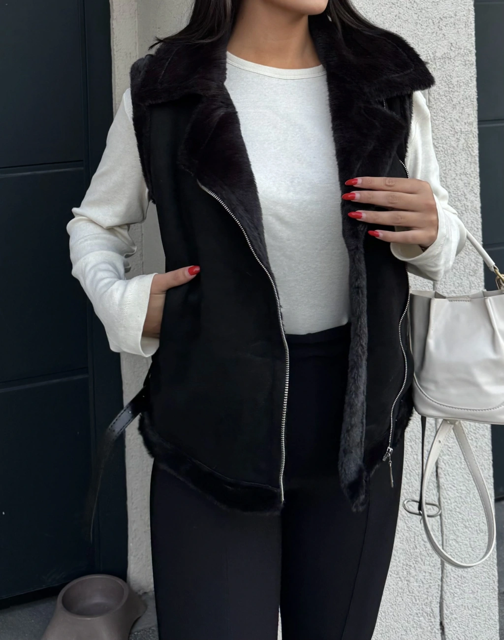 Siyah Peluş Detay Kürk Yelek