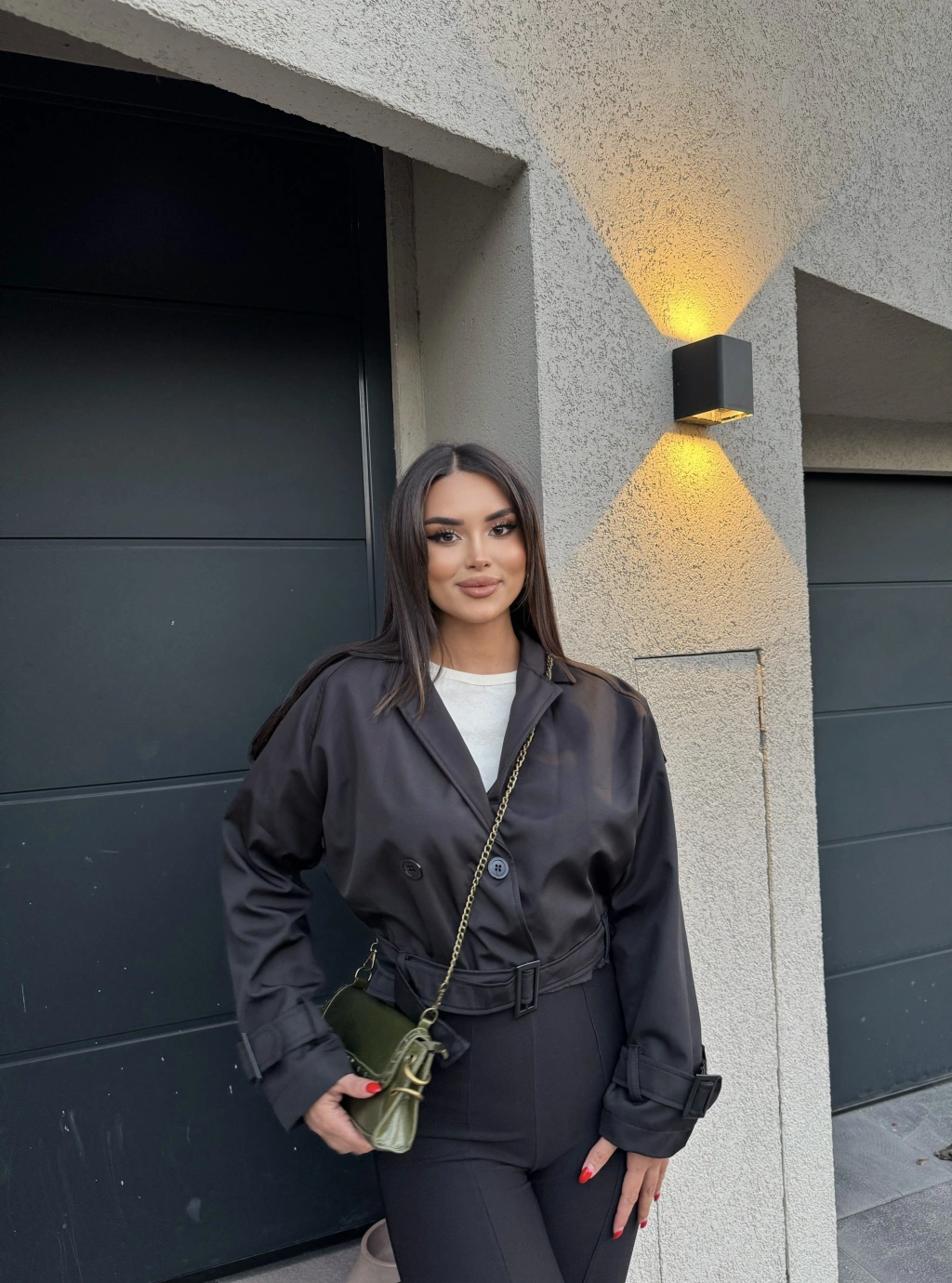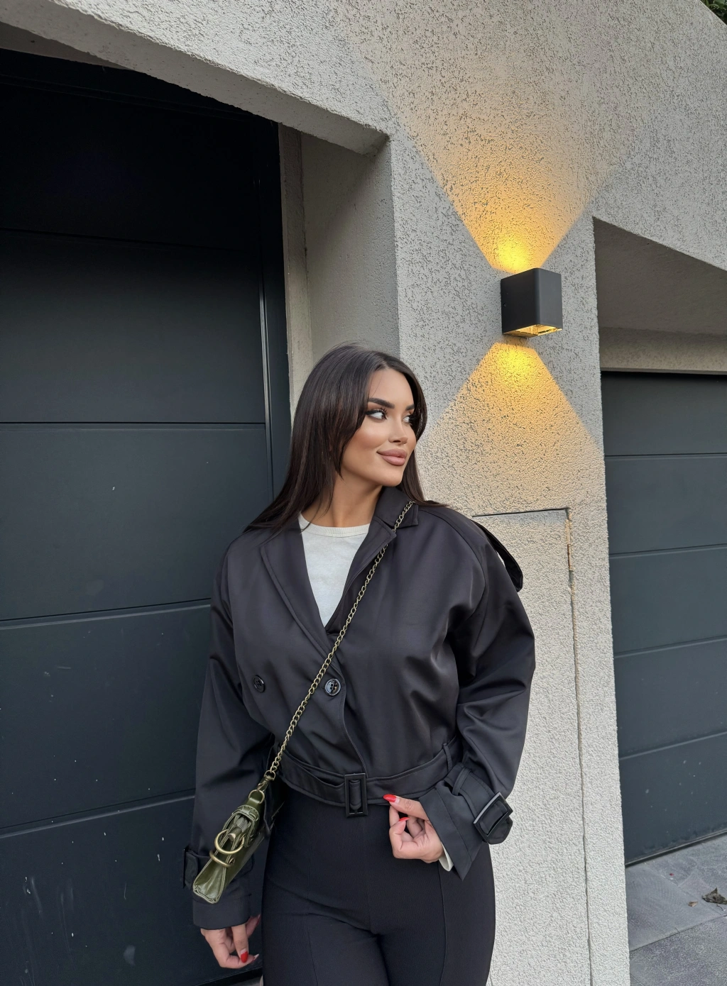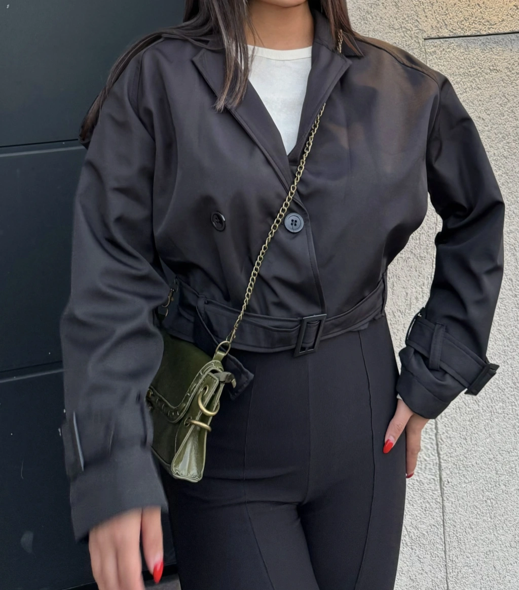Siyah Düğme Detay Kemerli Crop Trençkot