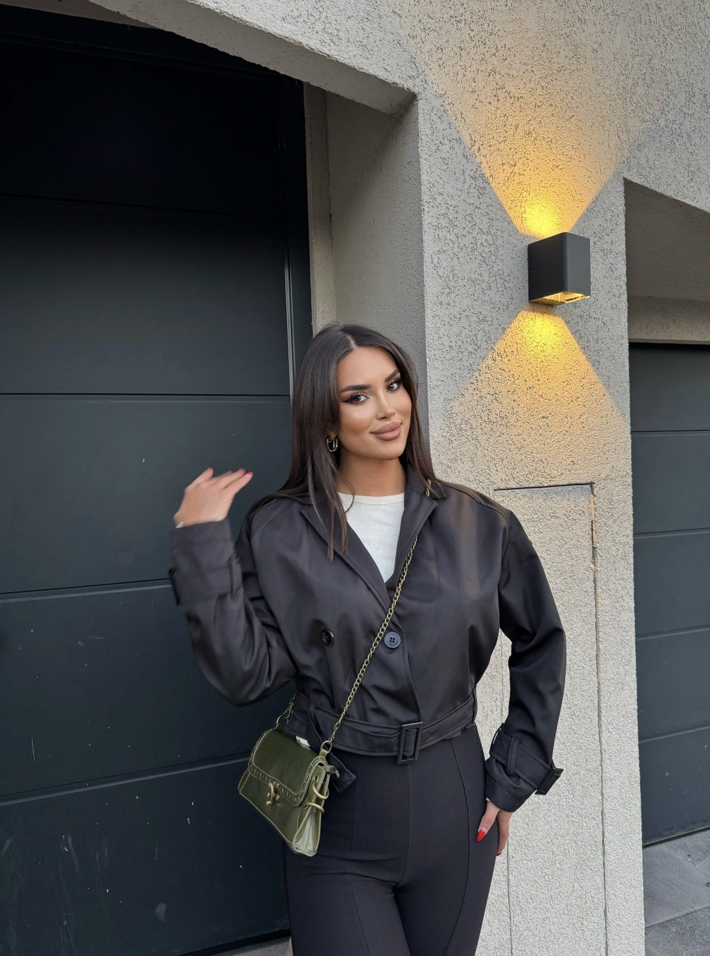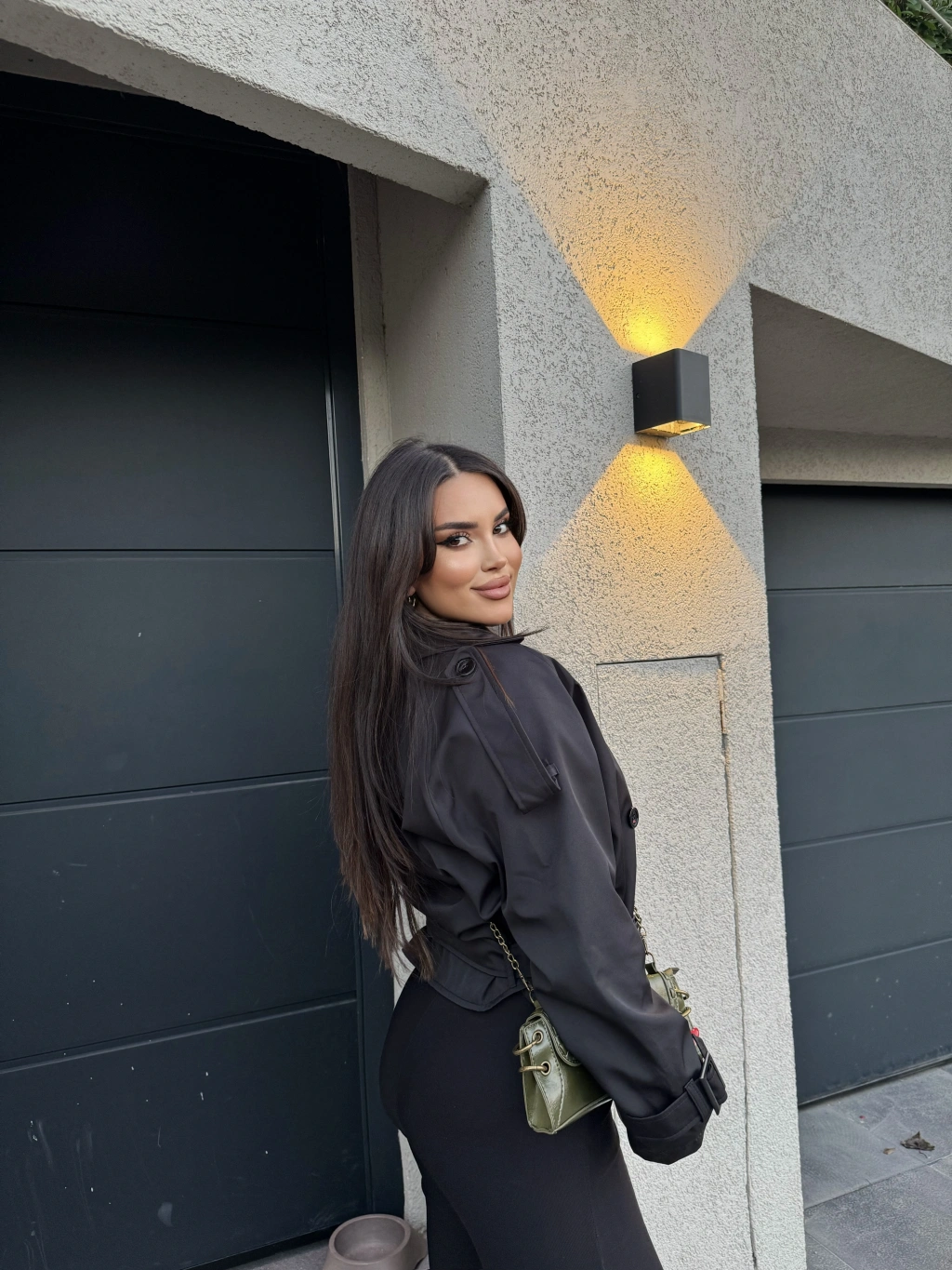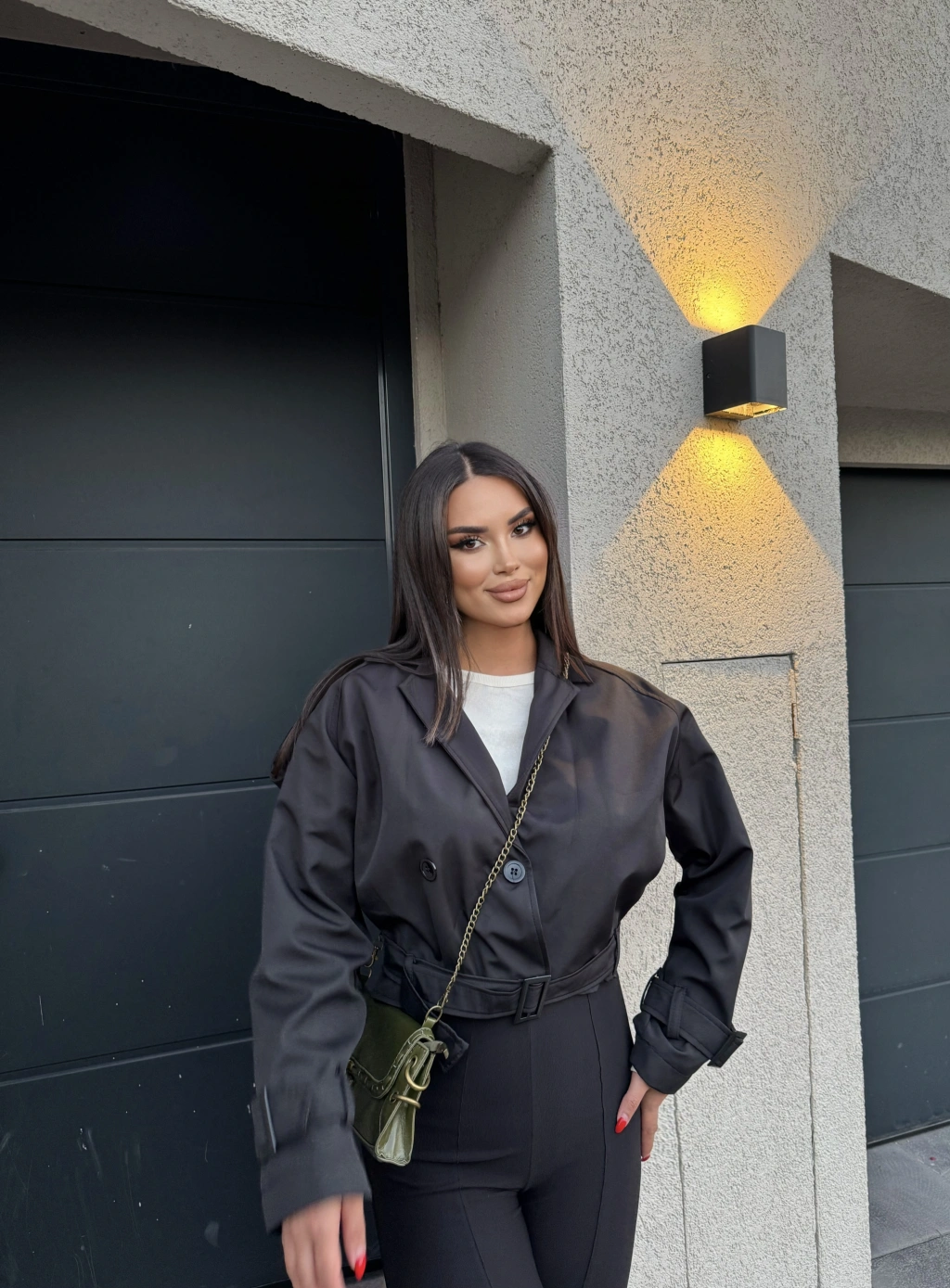 Siyah Düğme Detay Kemerli Crop Trençkot