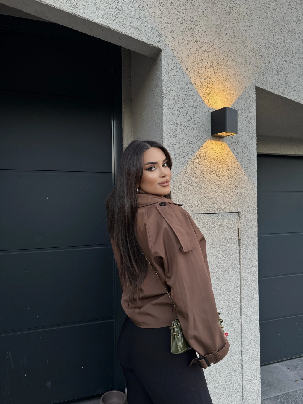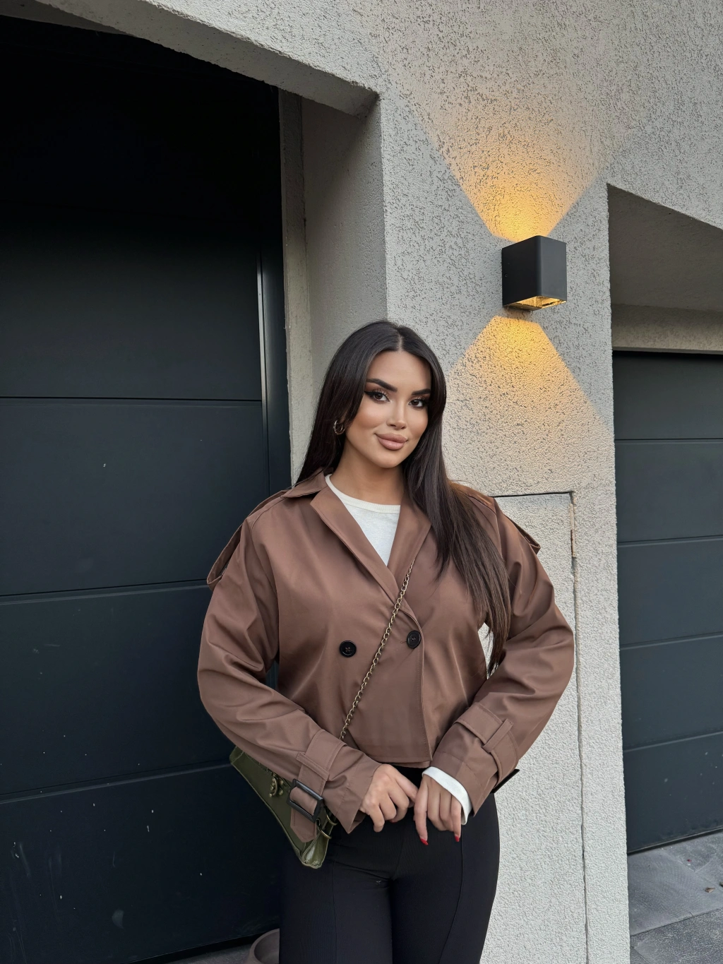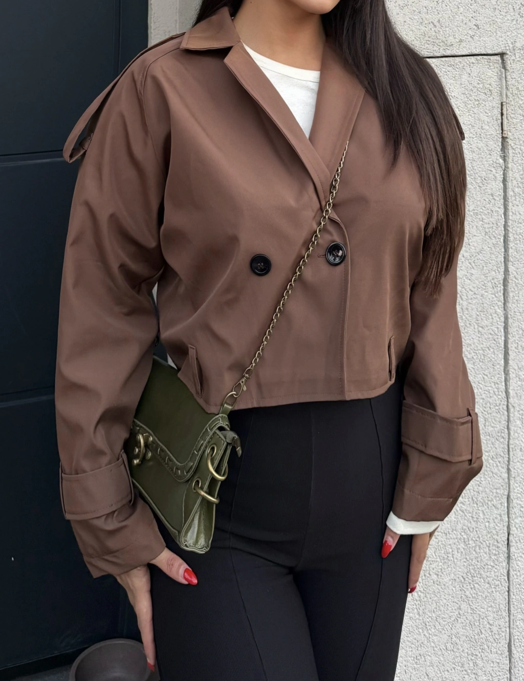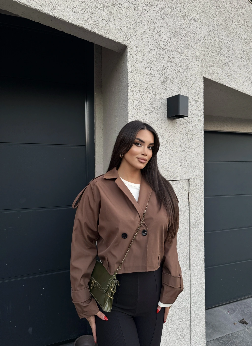 Kahverengi Düğme Detay Kemerli Crop Trençkot