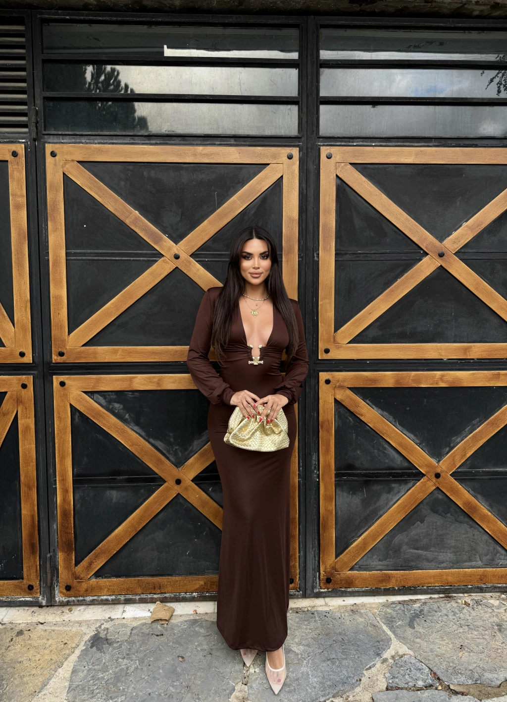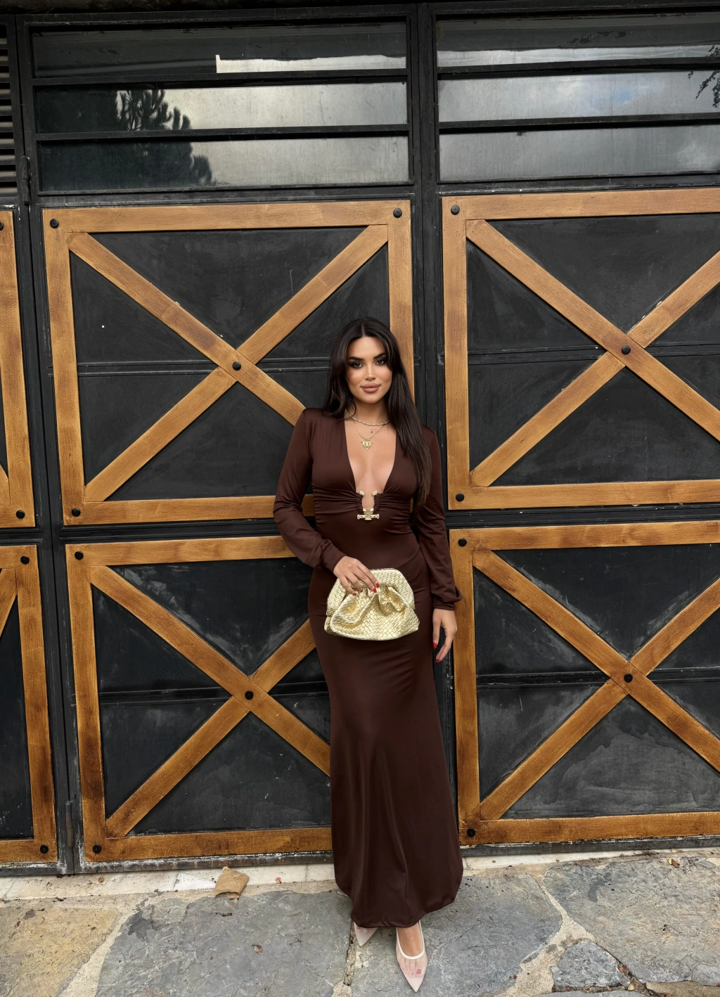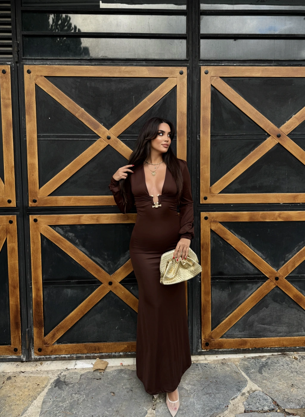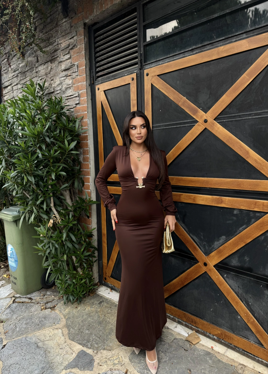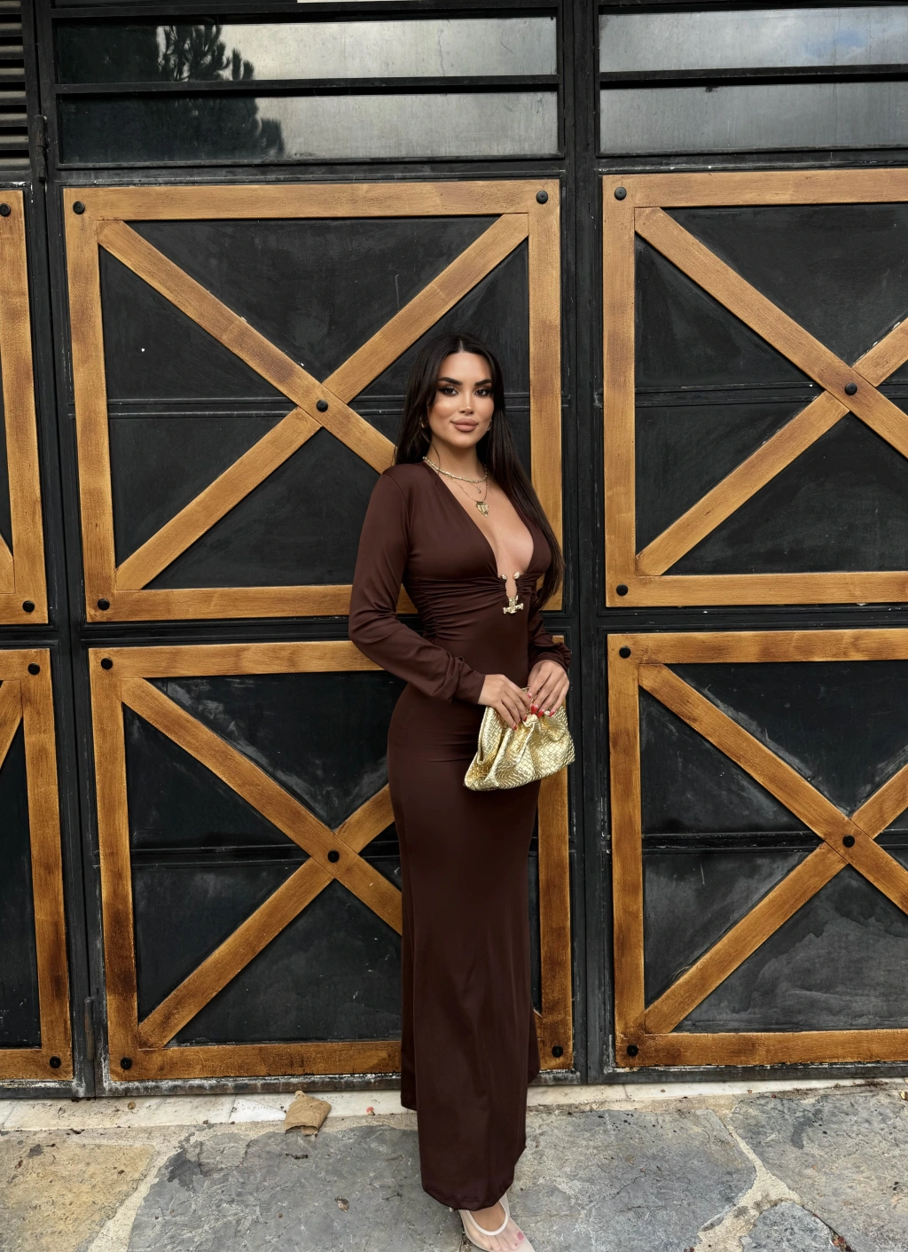 Kahverengi U Yaka Aksesuarlı Uzun Elbise