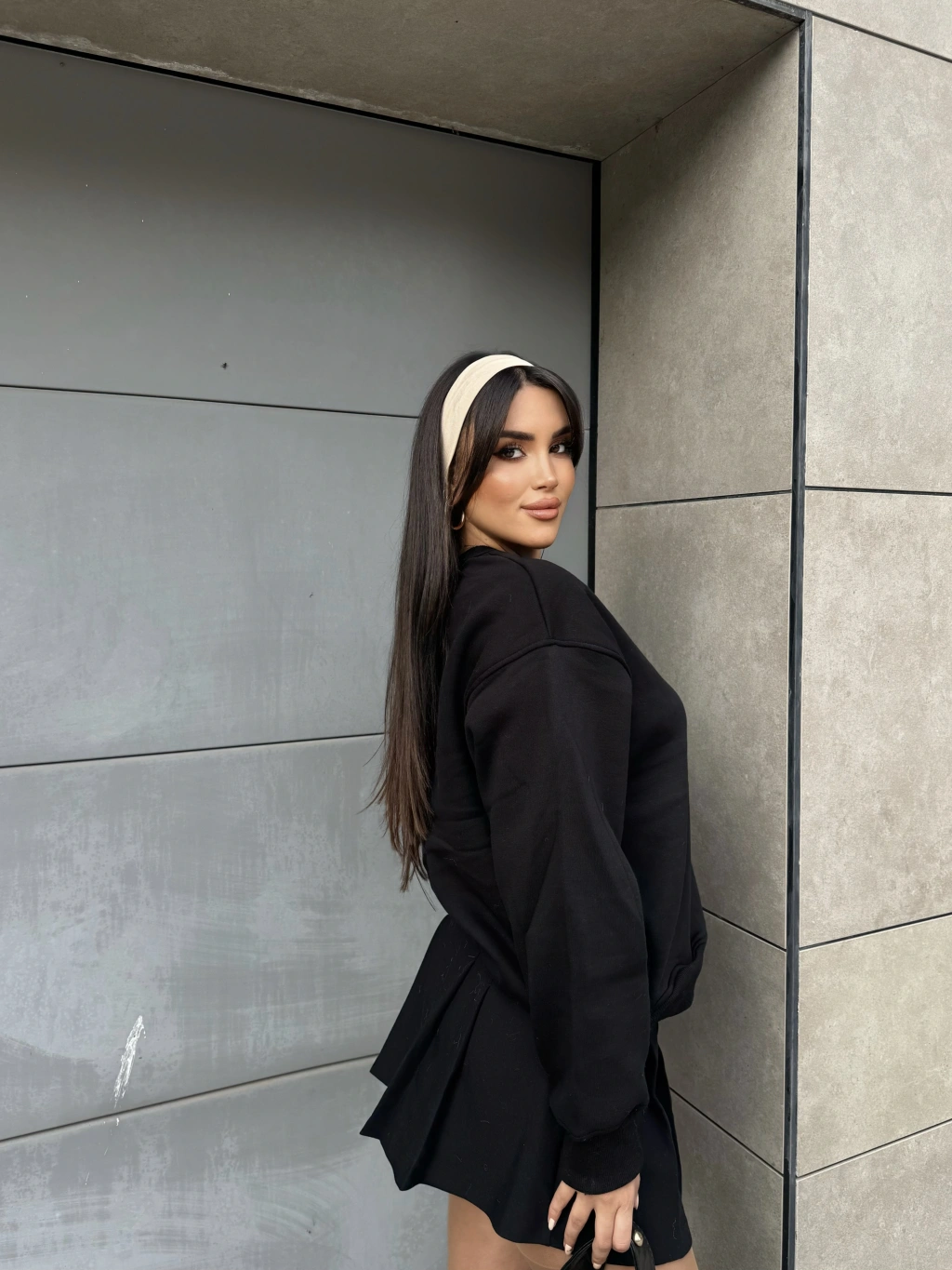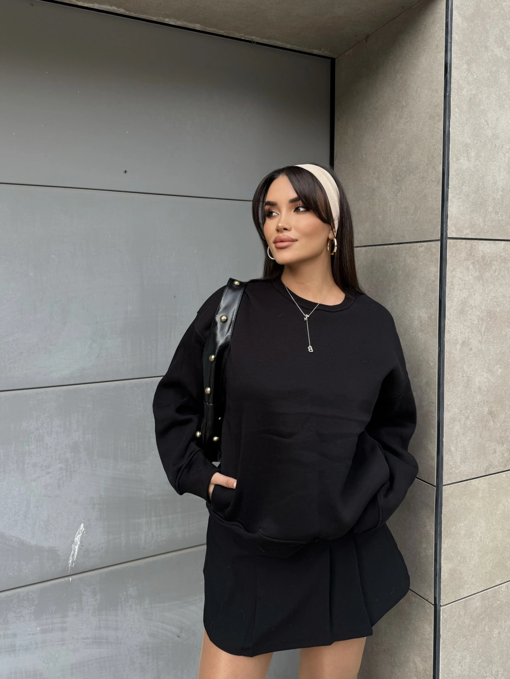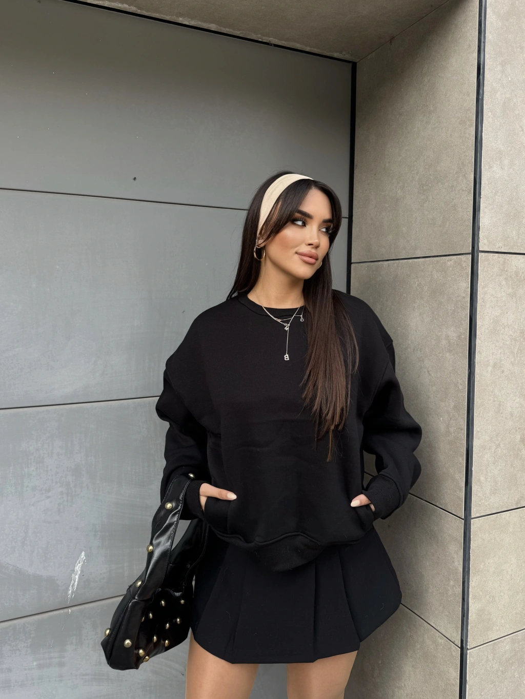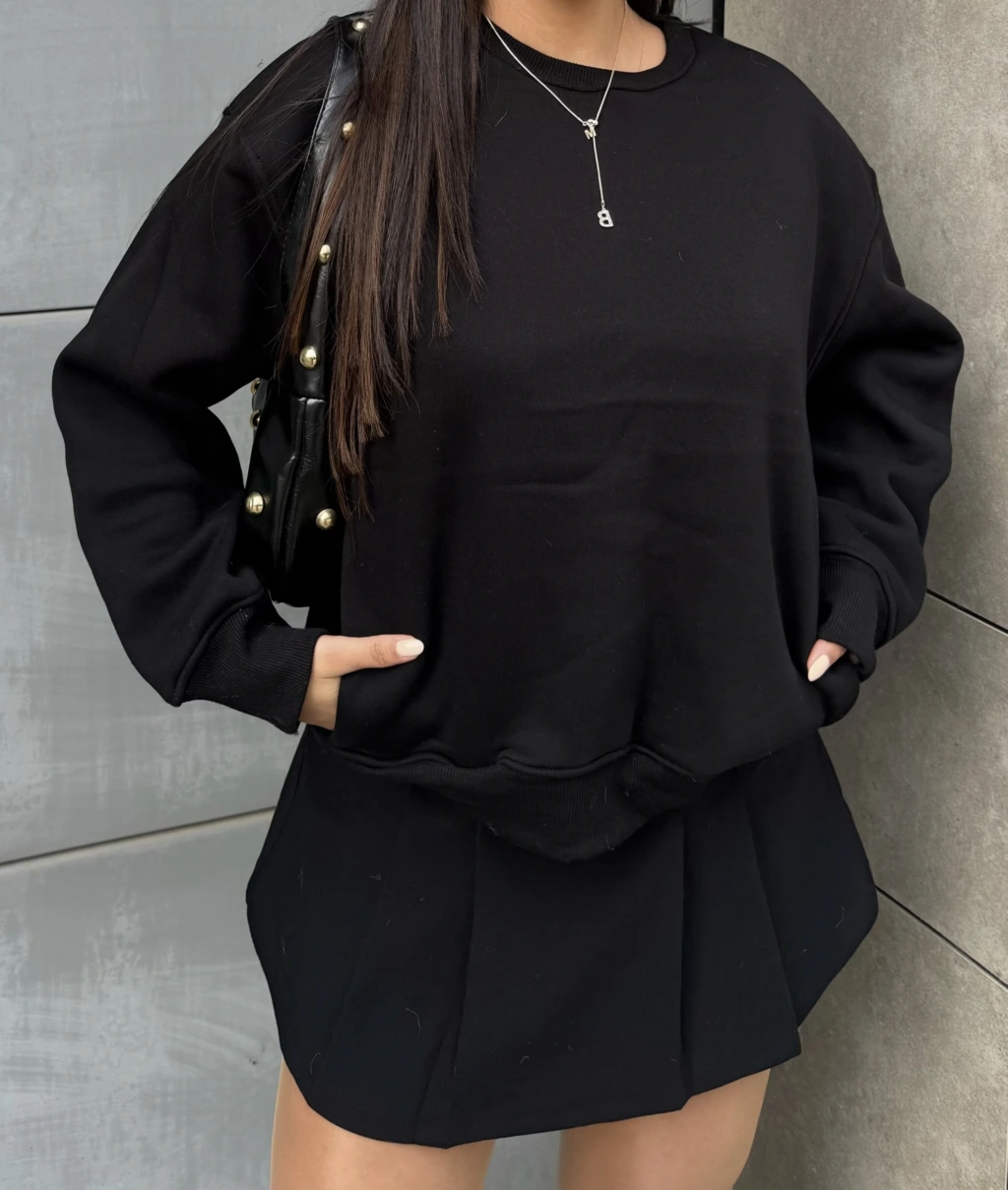 Siyah Bisiklet Yaka Cepli Sweatshirt
