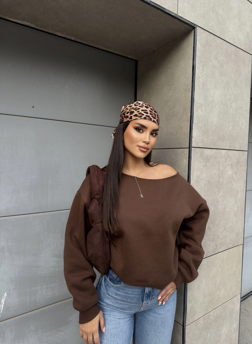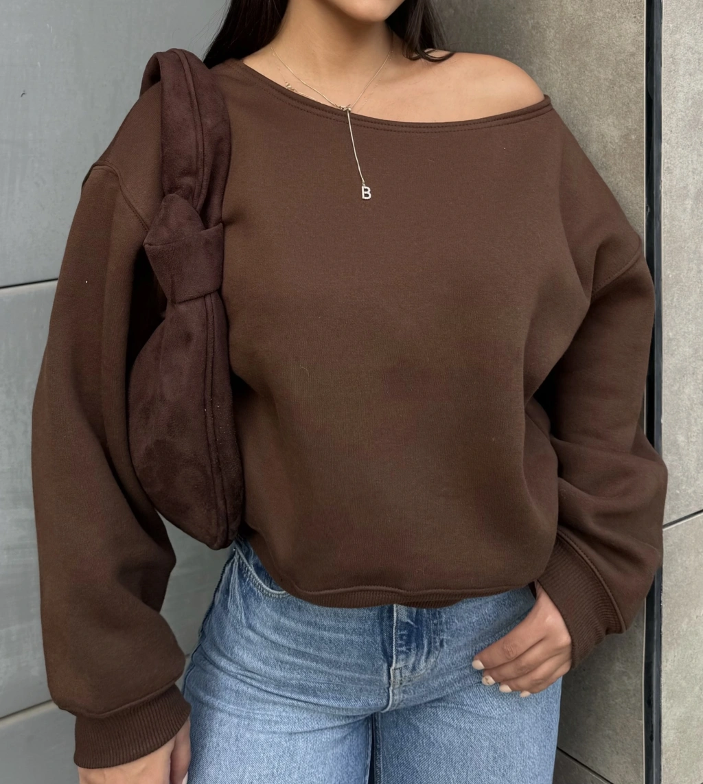 Kahverengi Kayık Yaka Oversize Sweatshirt