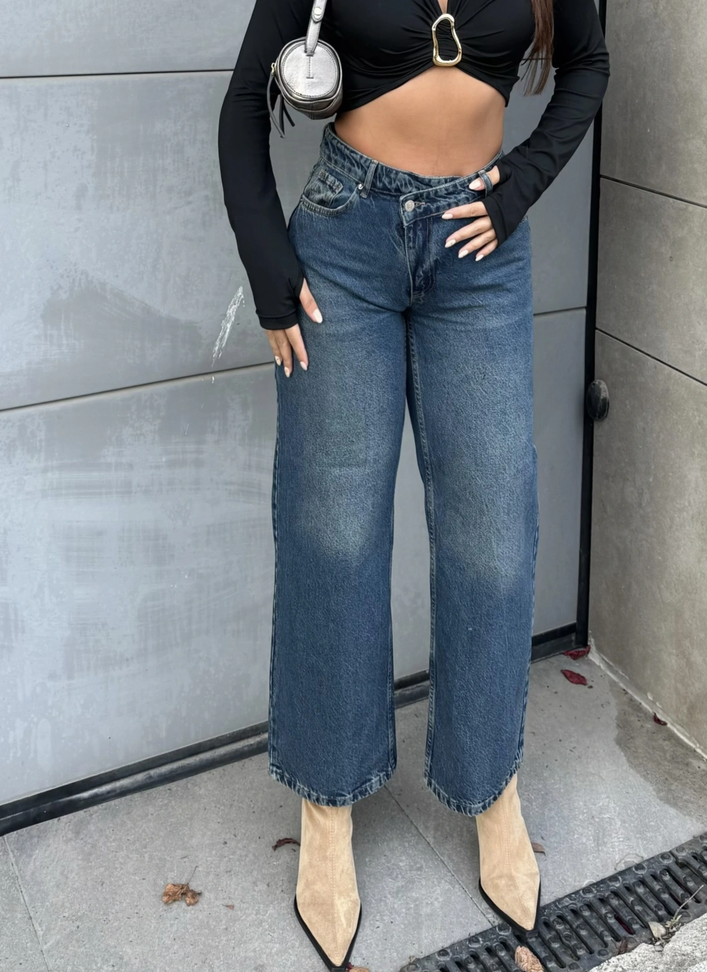 Mavi Tint Asimetrik Düğmeli Pantolon