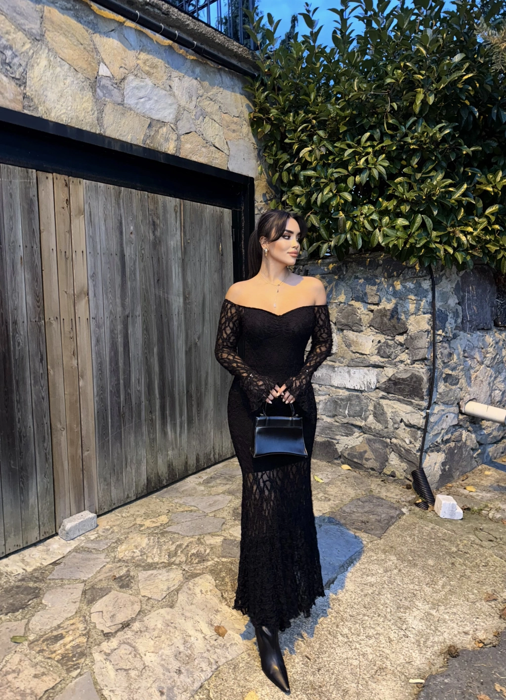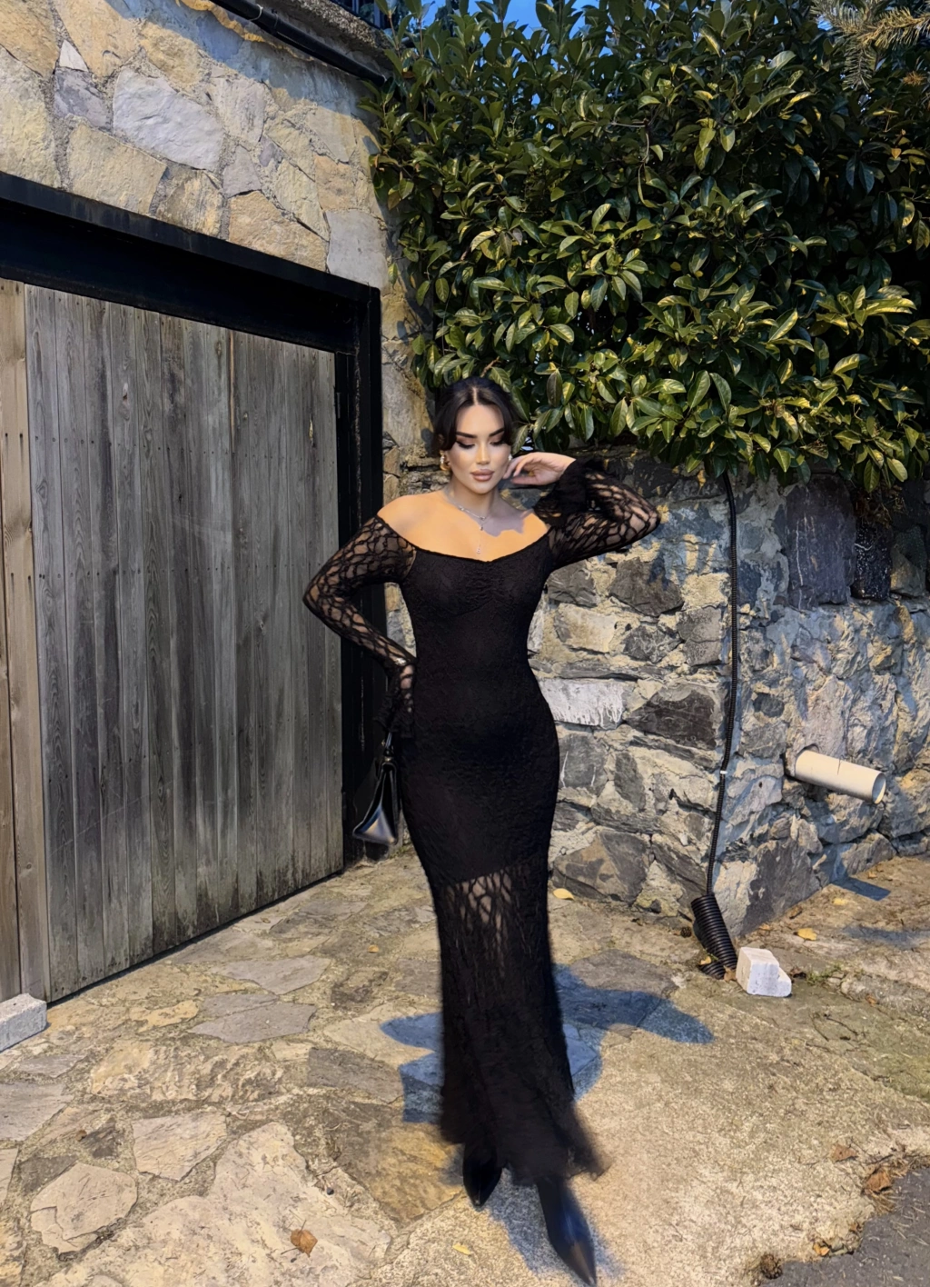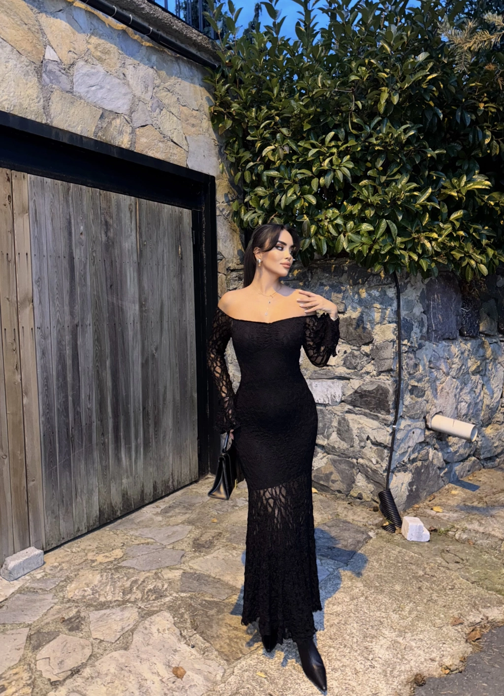 Siyah Dantelli Madonna Yaka Uzun Elbise