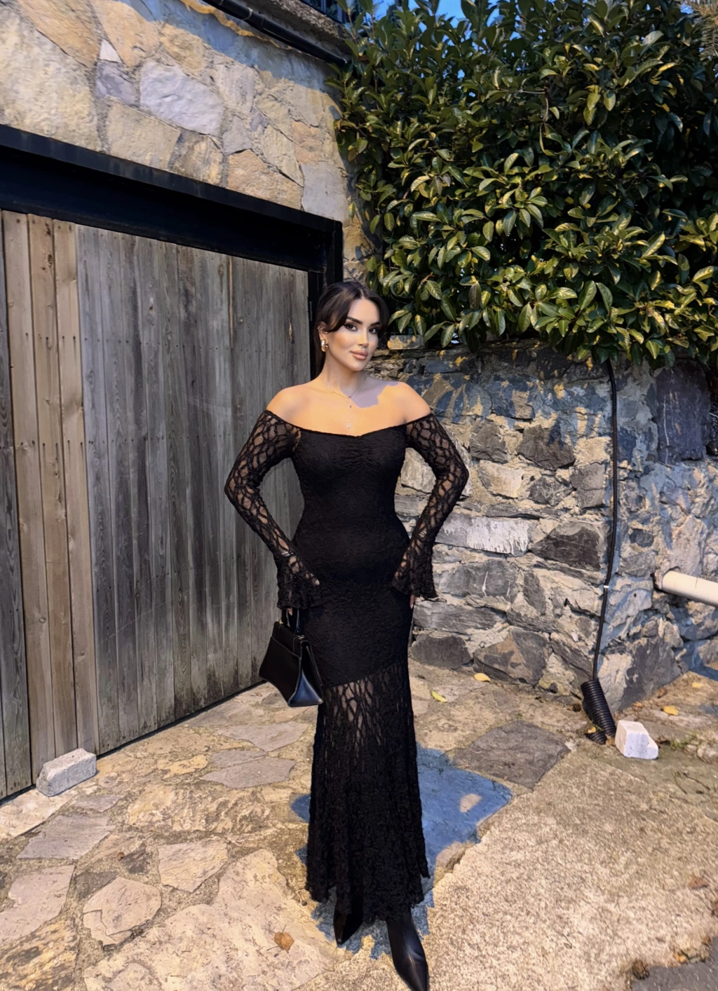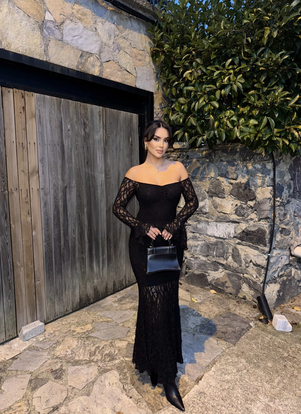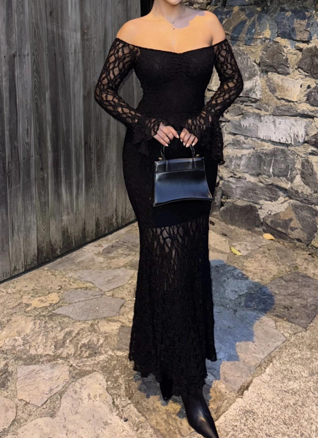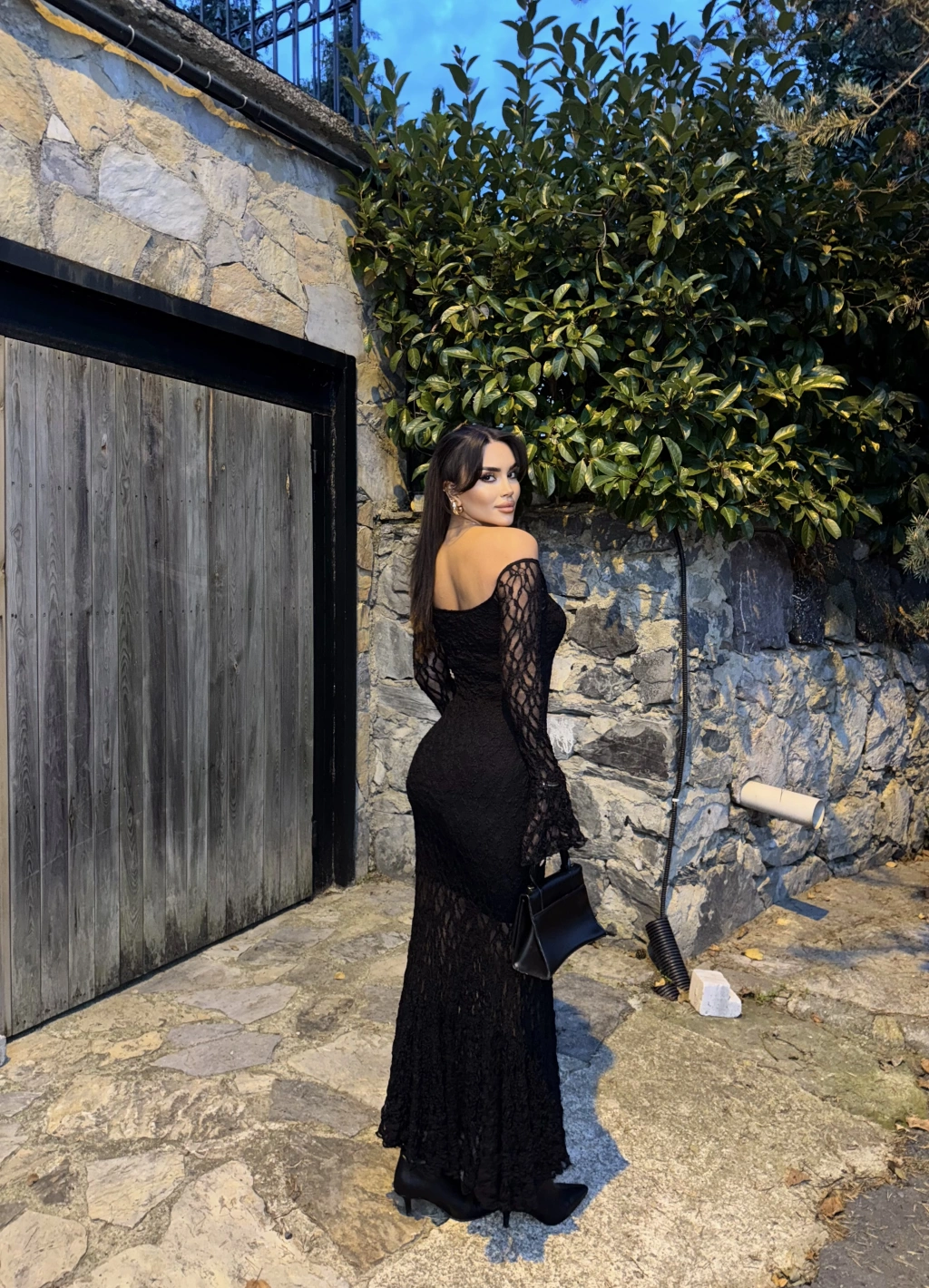 Siyah Dantelli Madonna Yaka Uzun Elbise