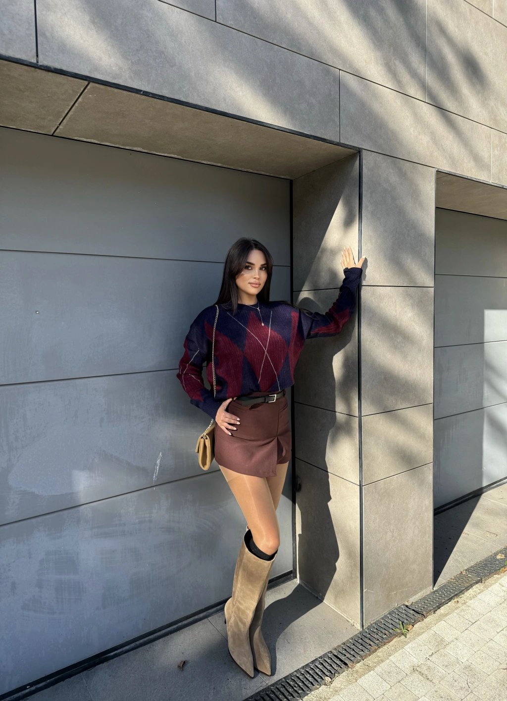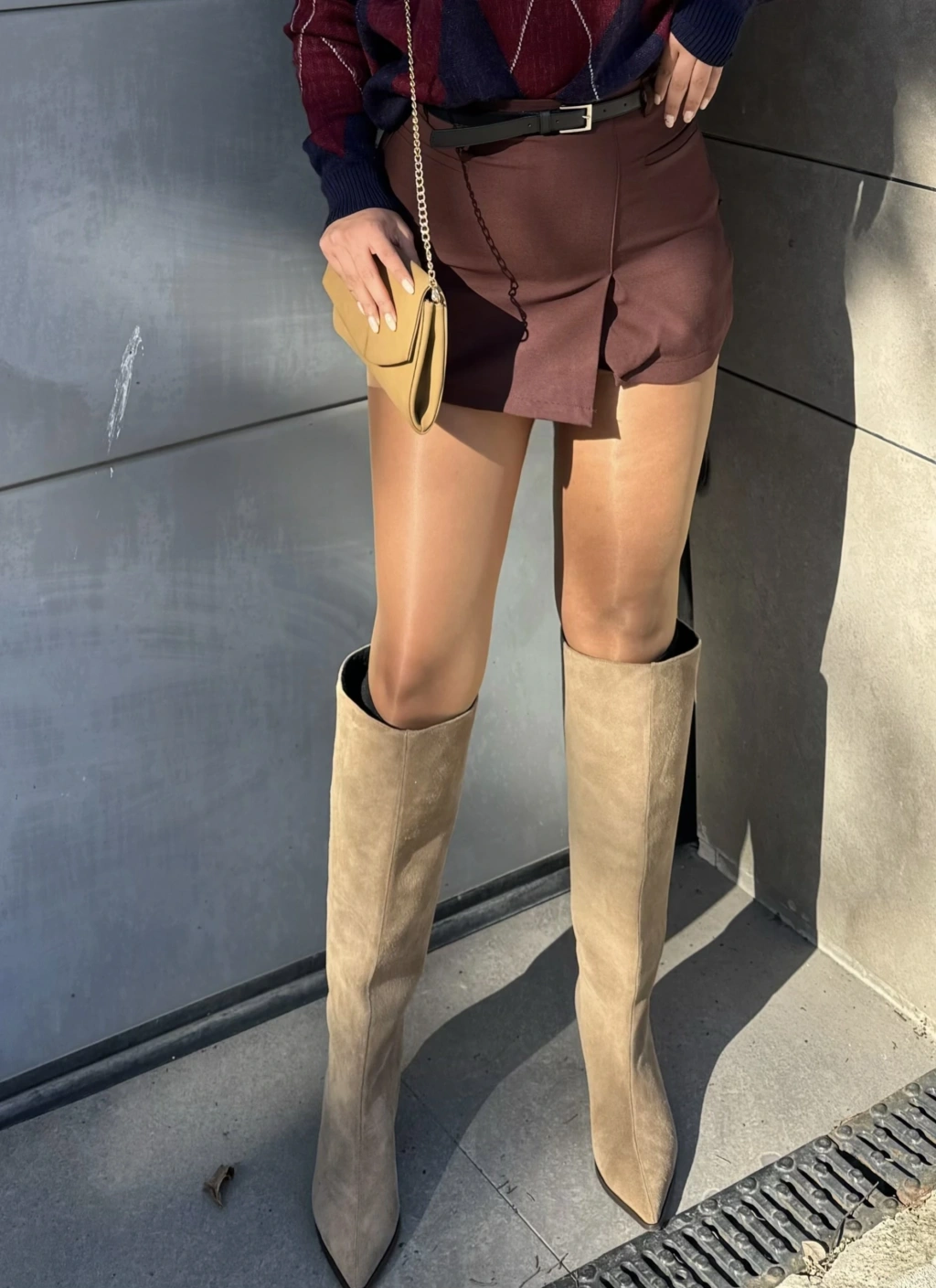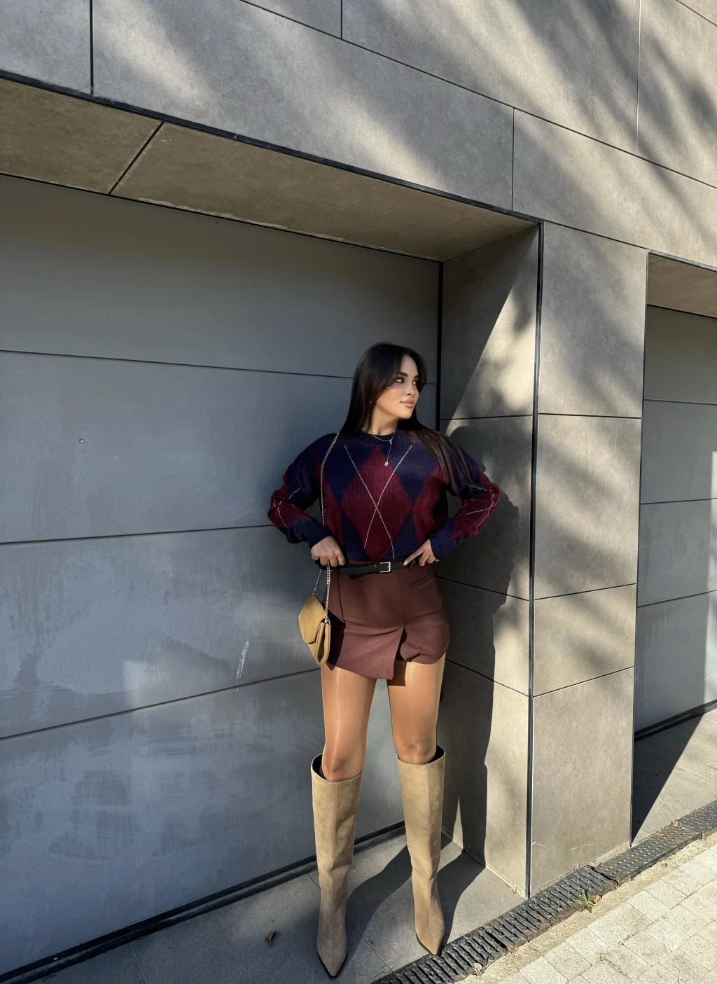 Kahverengi Yırtmaçlı Kemerli Şort Etek