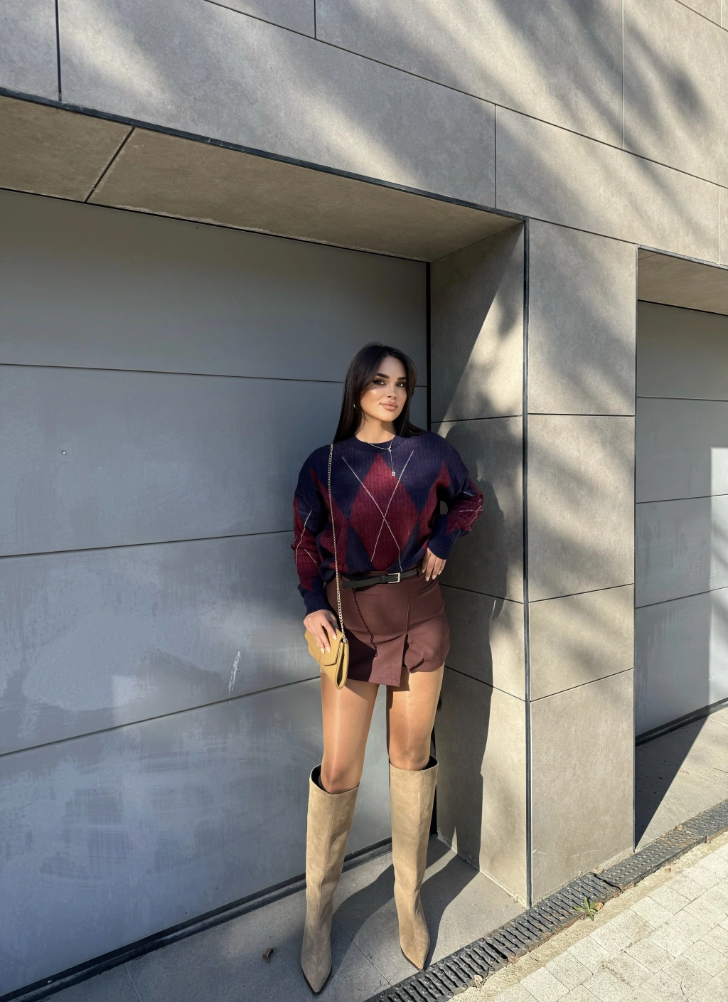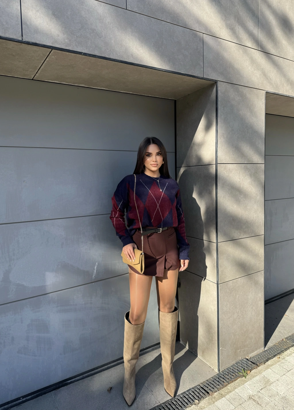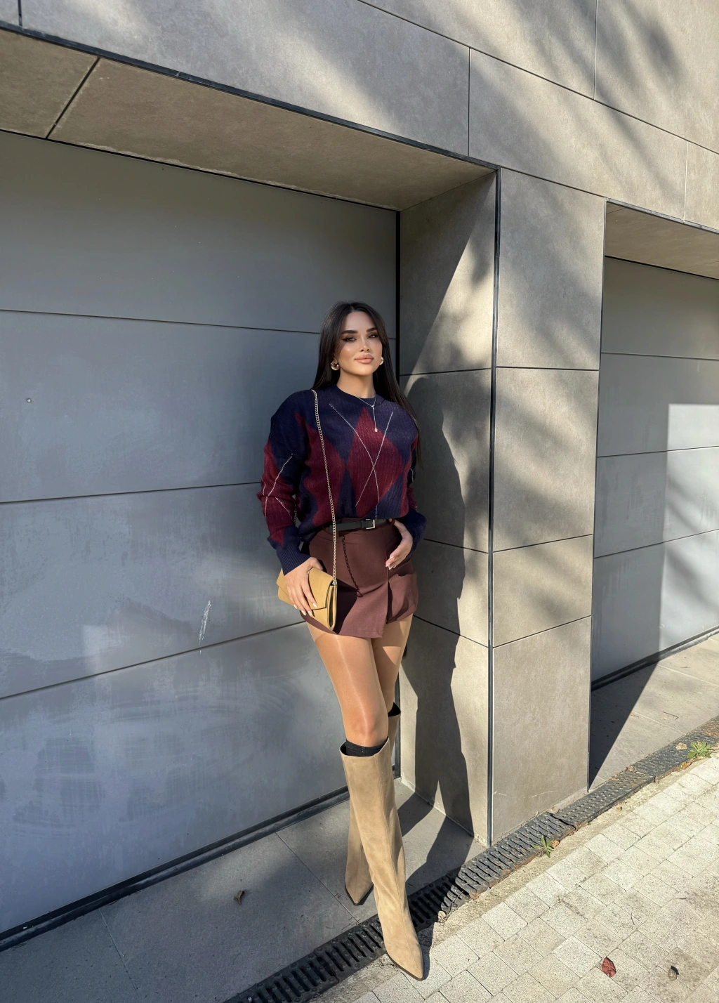 Kahverengi Yırtmaçlı Kemerli Şort Etek