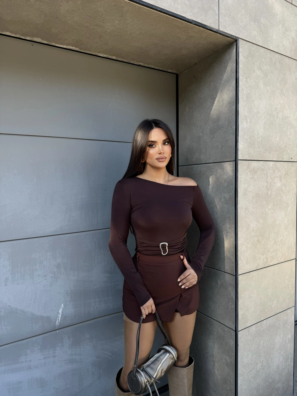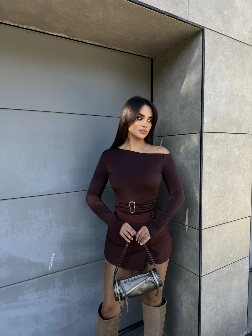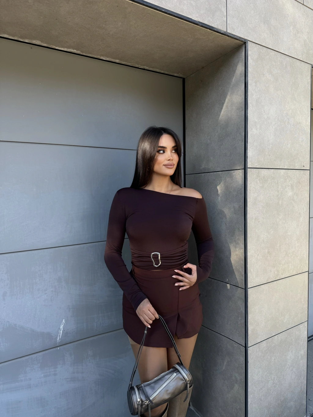 Kahverengi Omuz Detay Aksesuarlı Tasarım Crop
