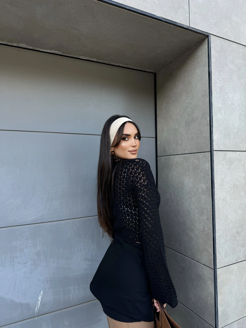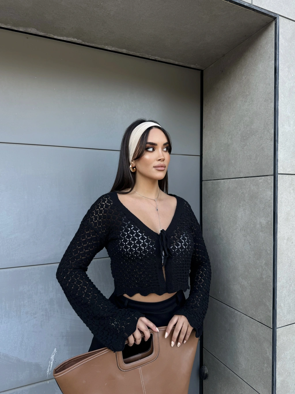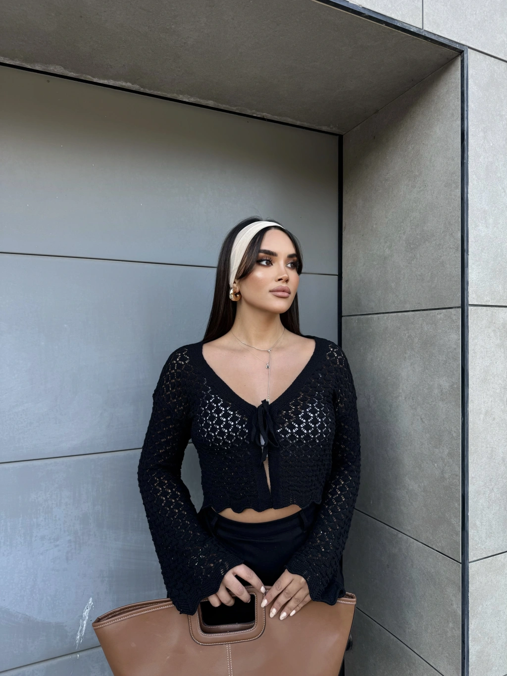 Siyah Ajurlu Ön Bağlamalı Triko Bluz