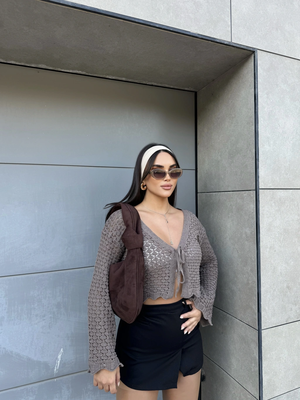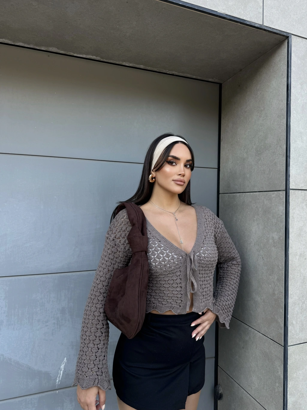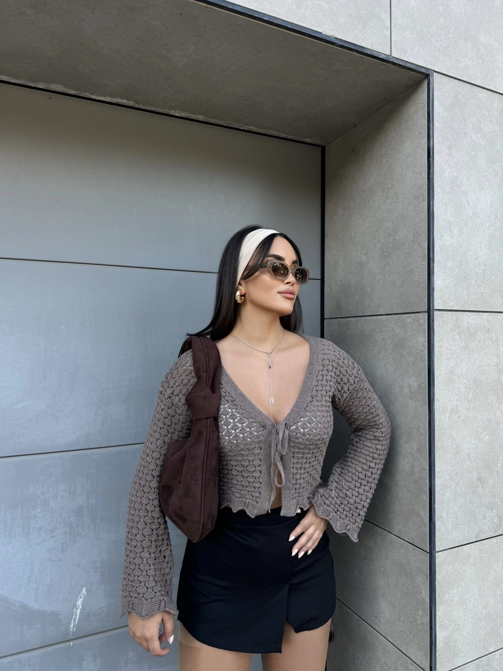 Kahverengi Ajurlu Ön Bağlamalı Triko Bluz