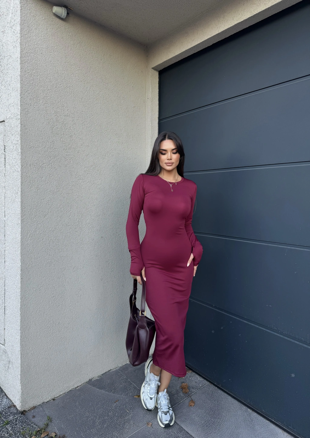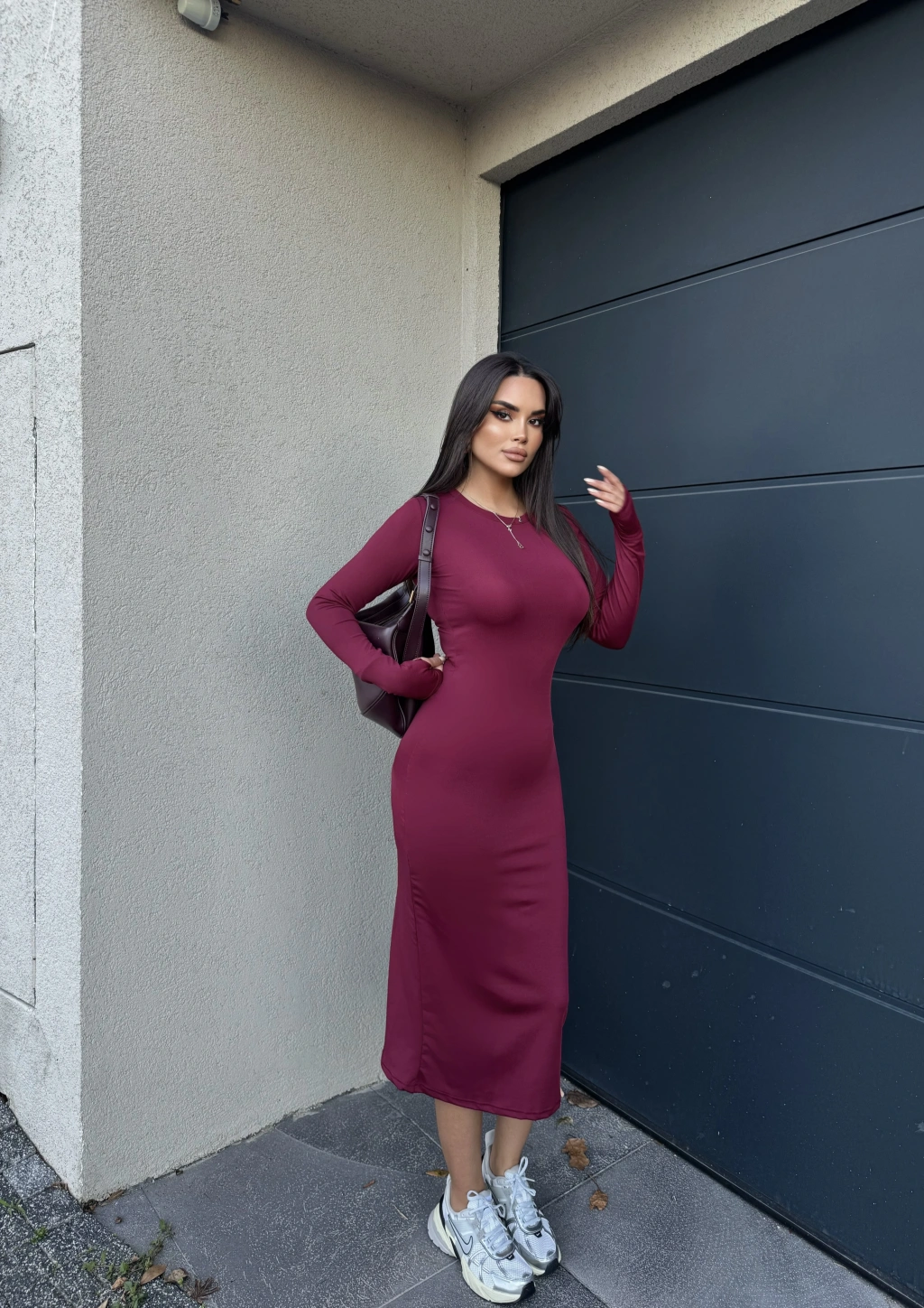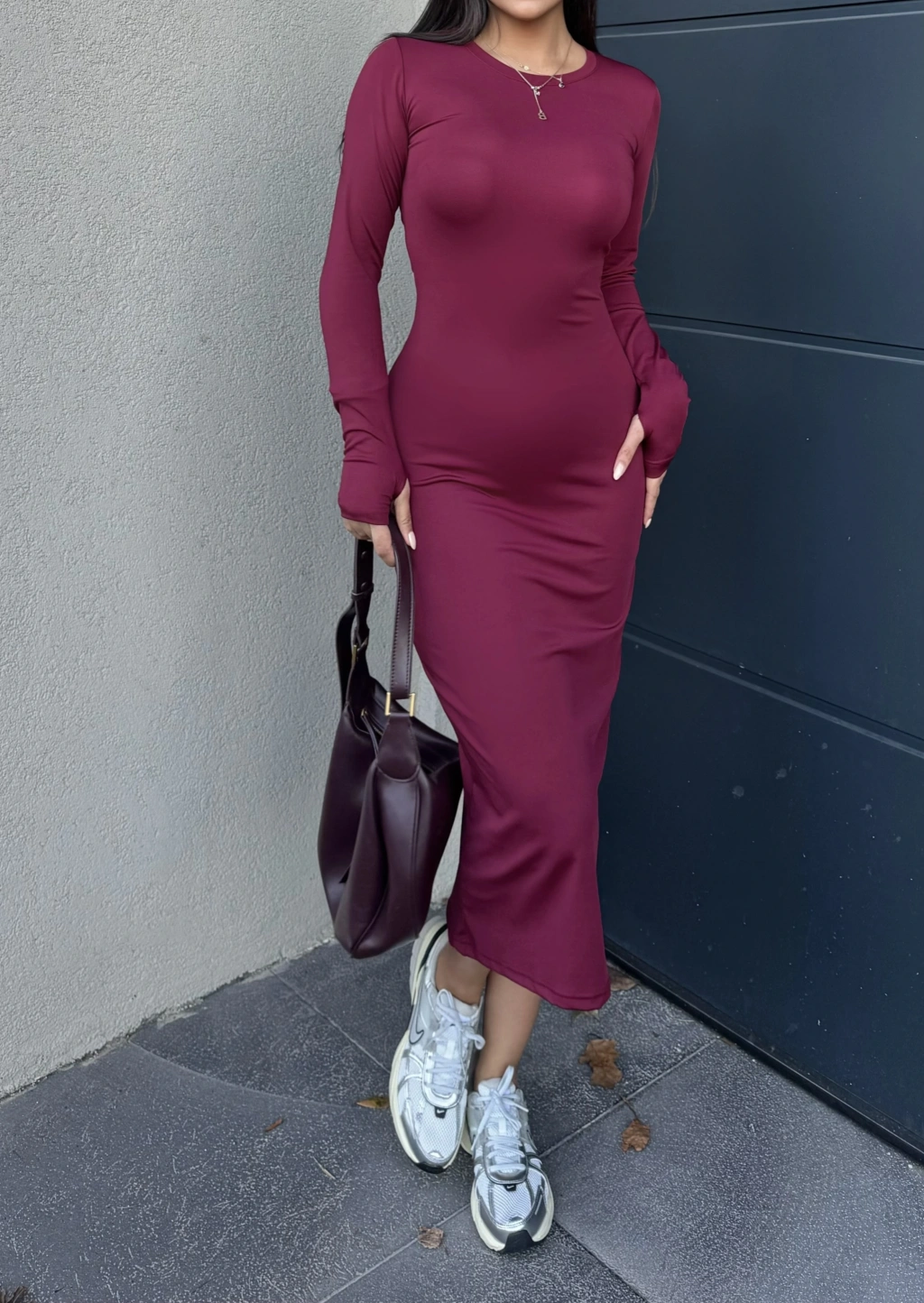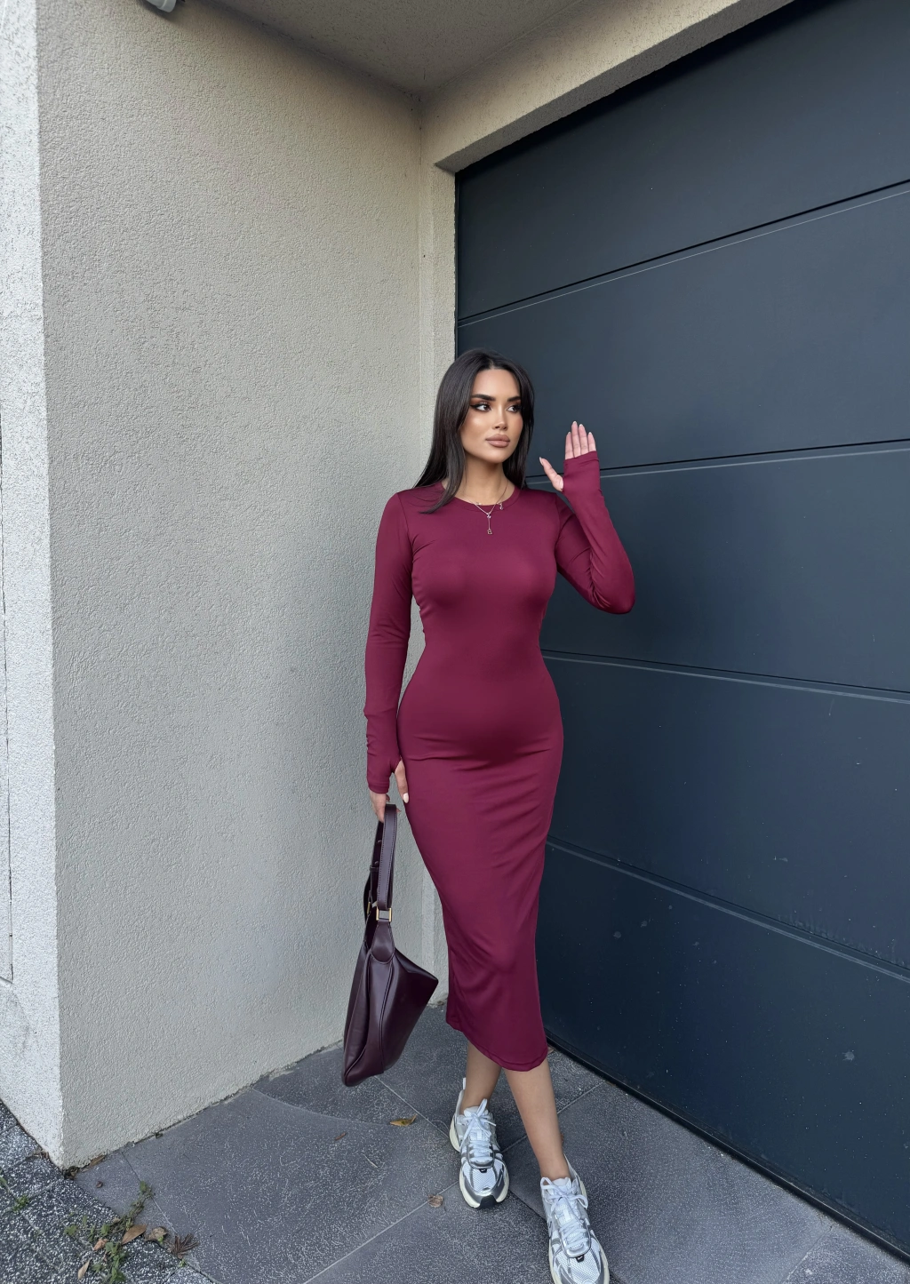 Bordo Bisiklet Yaka Parmak Geçirmeli Elbise