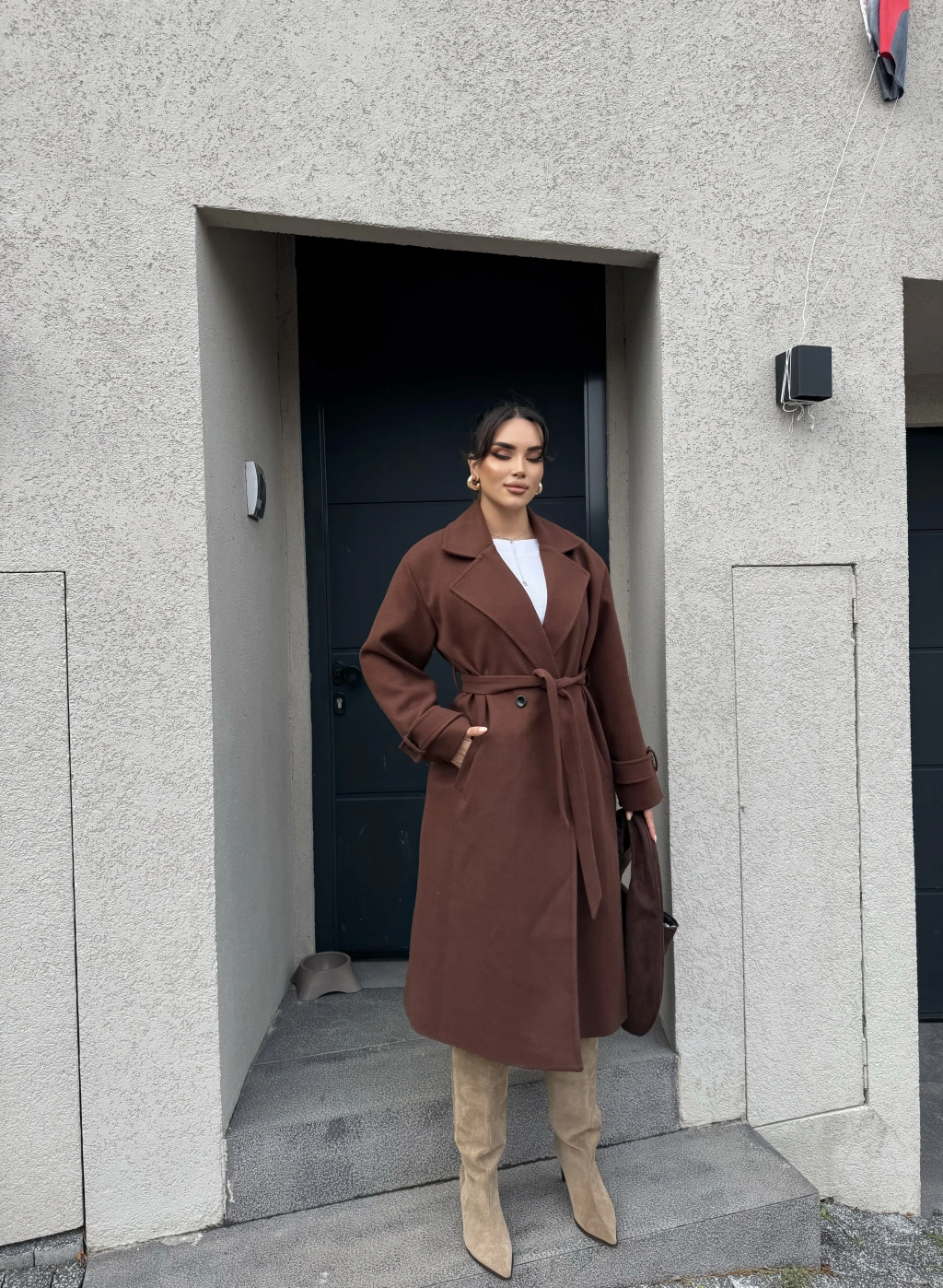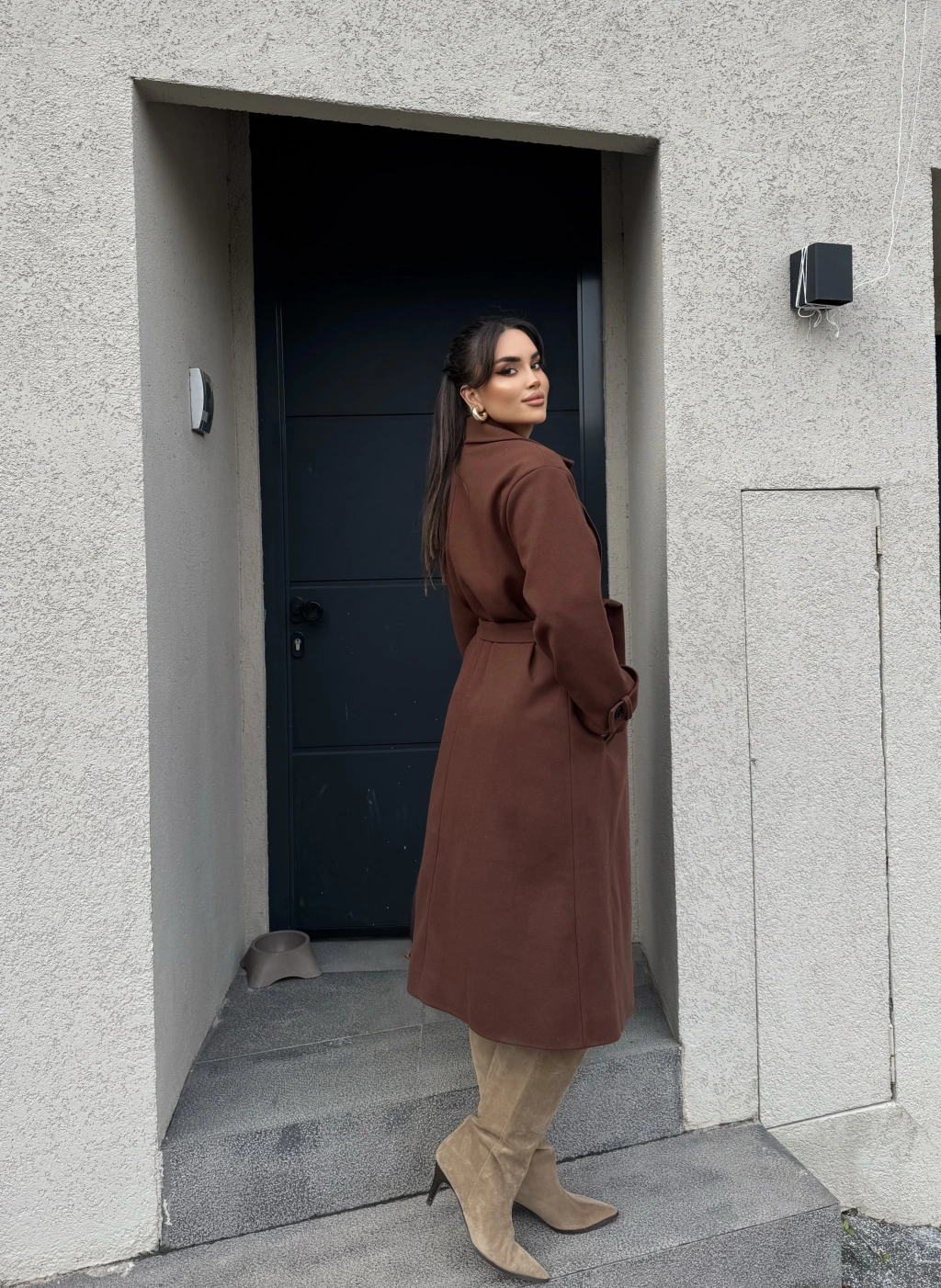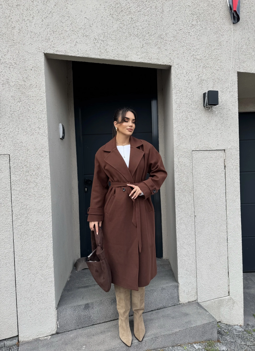 Kahverengi Uzun Kuşaklı Kaşe Kaban