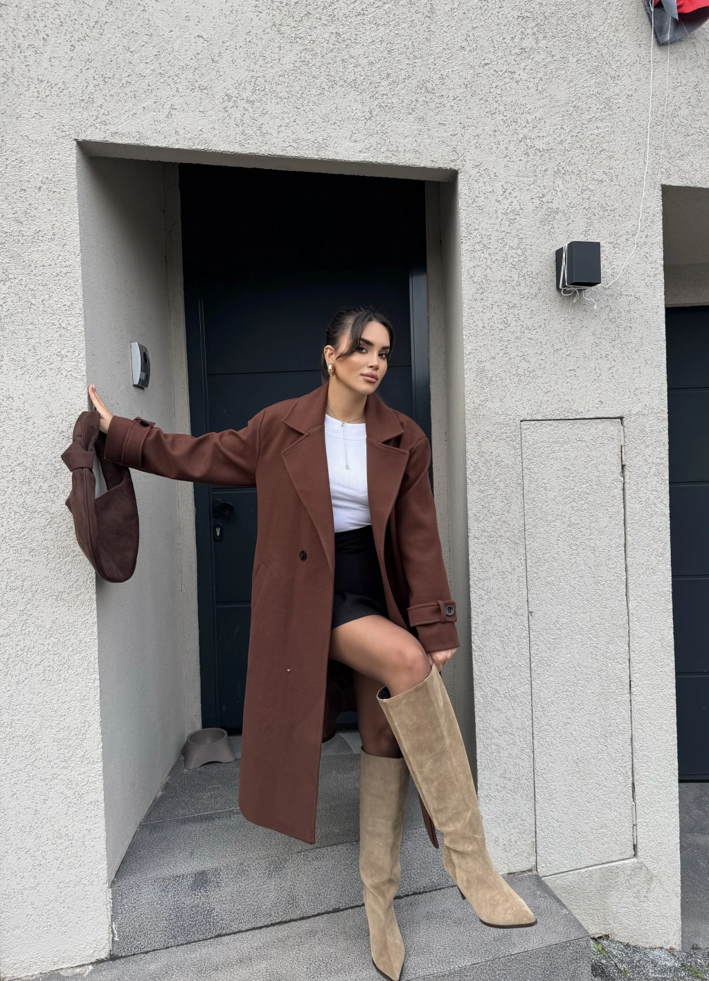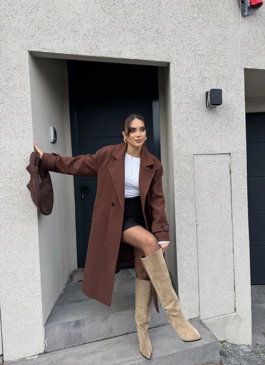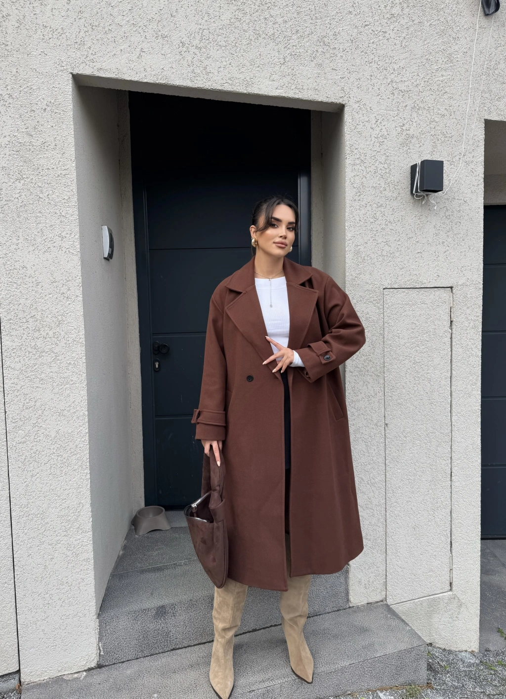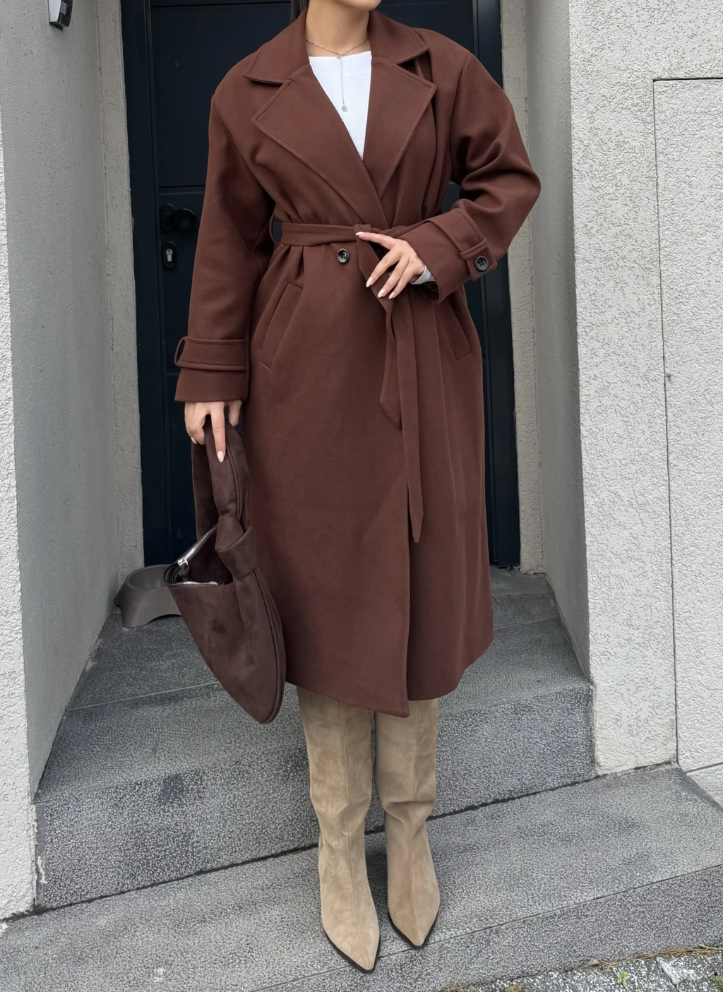 Kahverengi Uzun Kuşaklı Kaşe Kaban