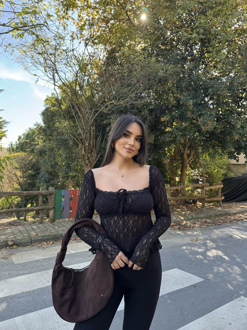 Siyah Kare Yaka Dantel Tasarım Bluz