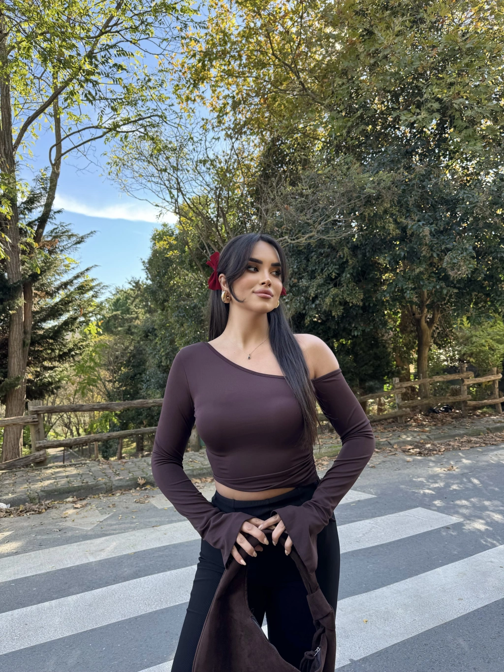 Kahverengi Tek Omuz Büzgülü Asimetrik Crop