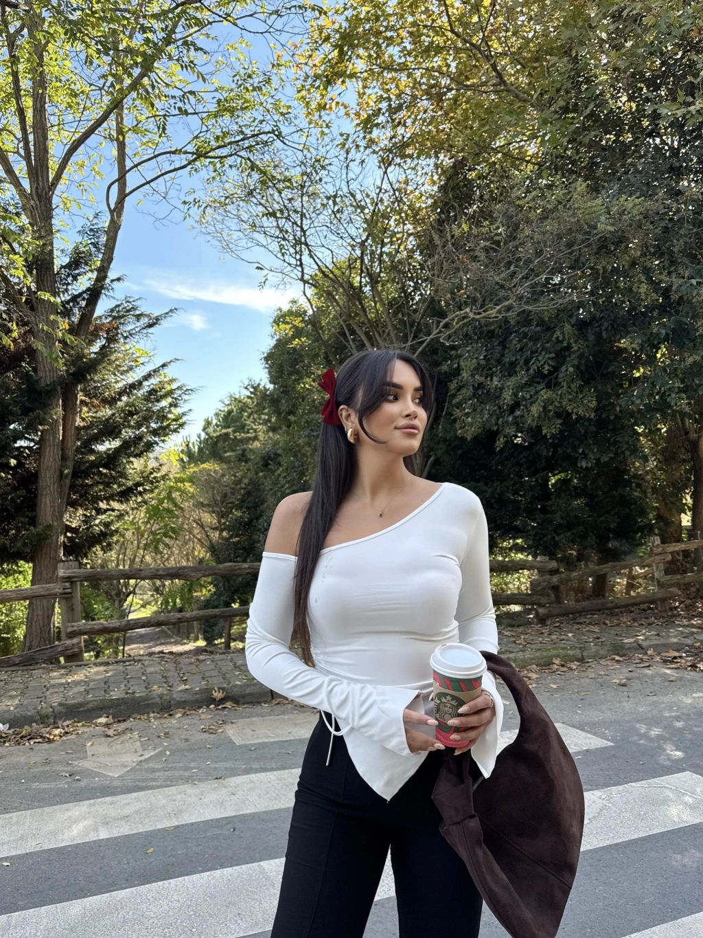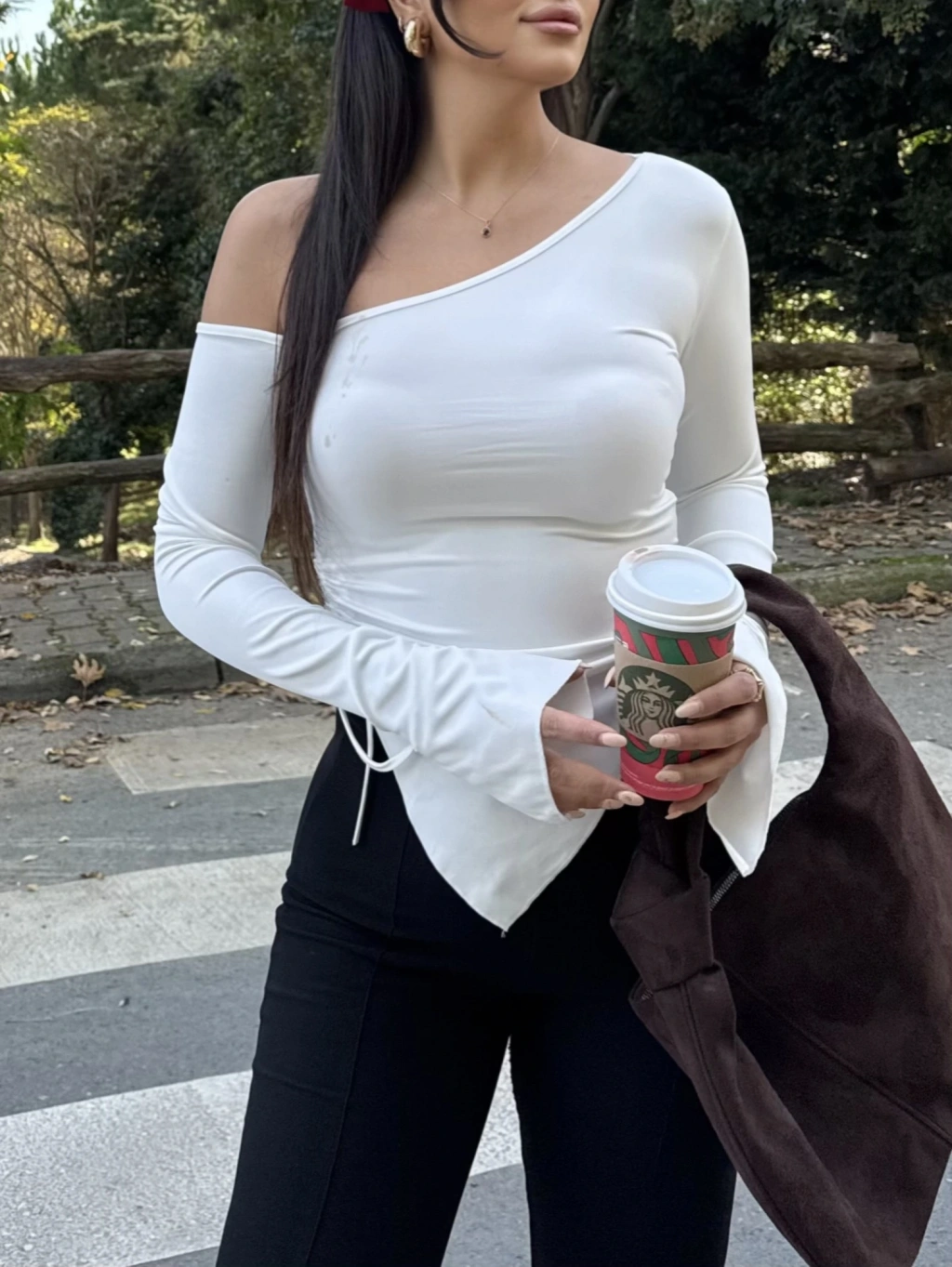 Beyaz Tek Omuz Büzgülü Asimetrik Crop