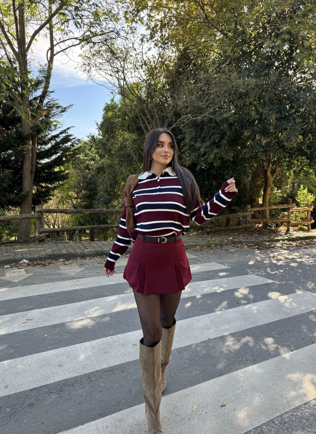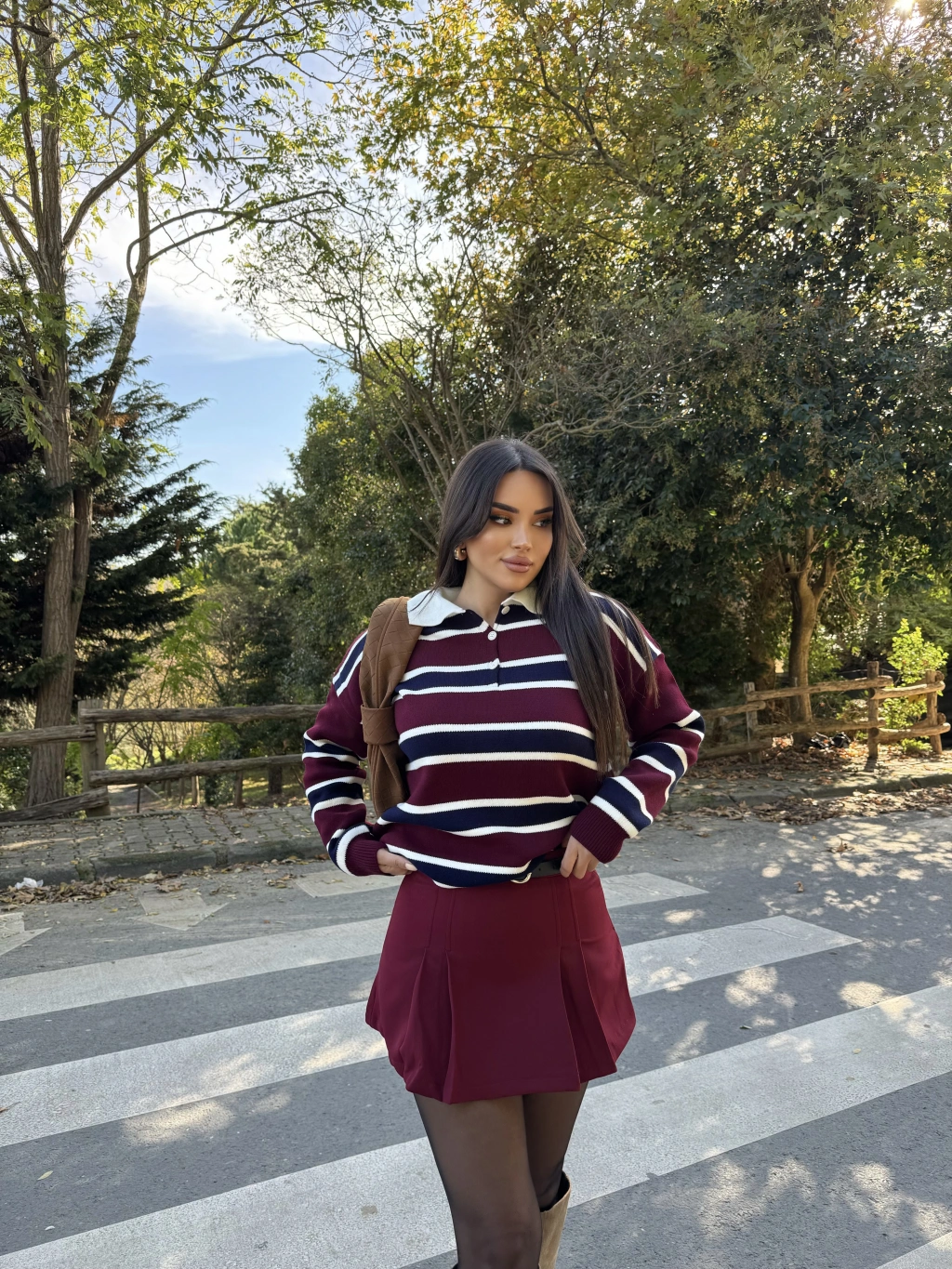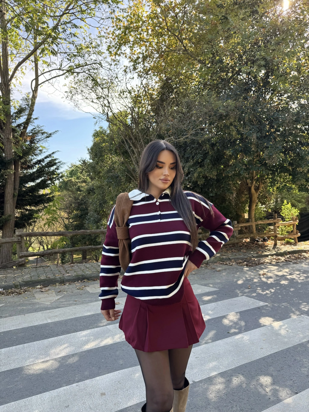 Polo Yaka Bordo Lacivert Çizgili Triko Kazak