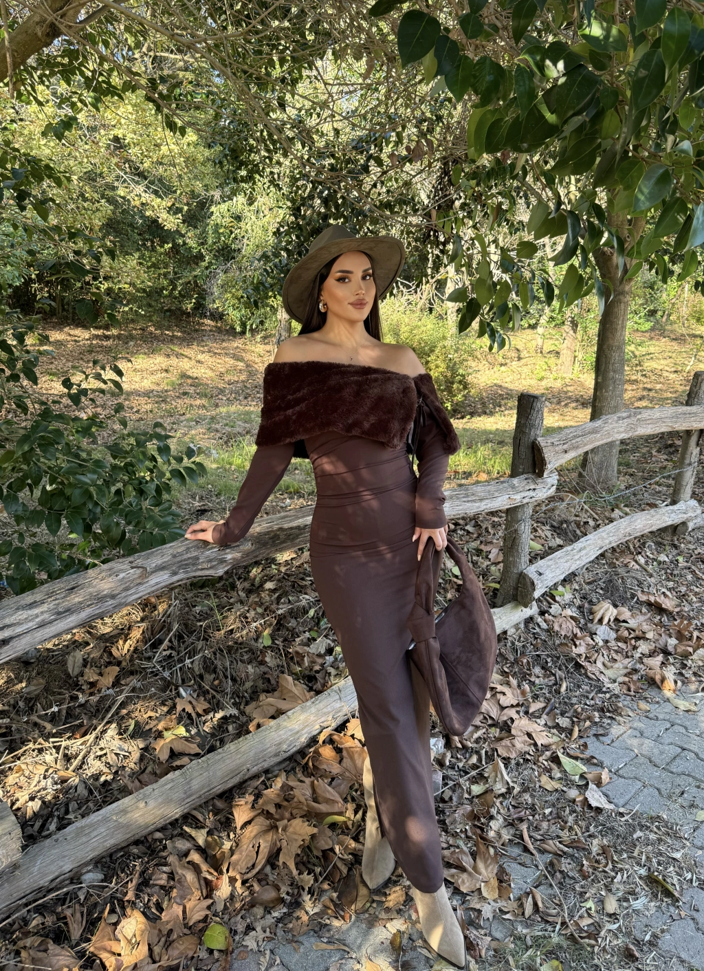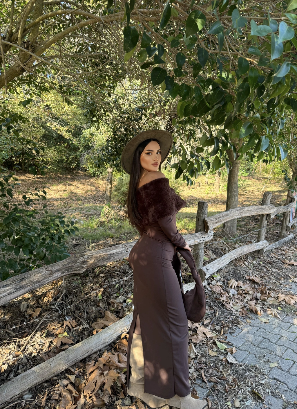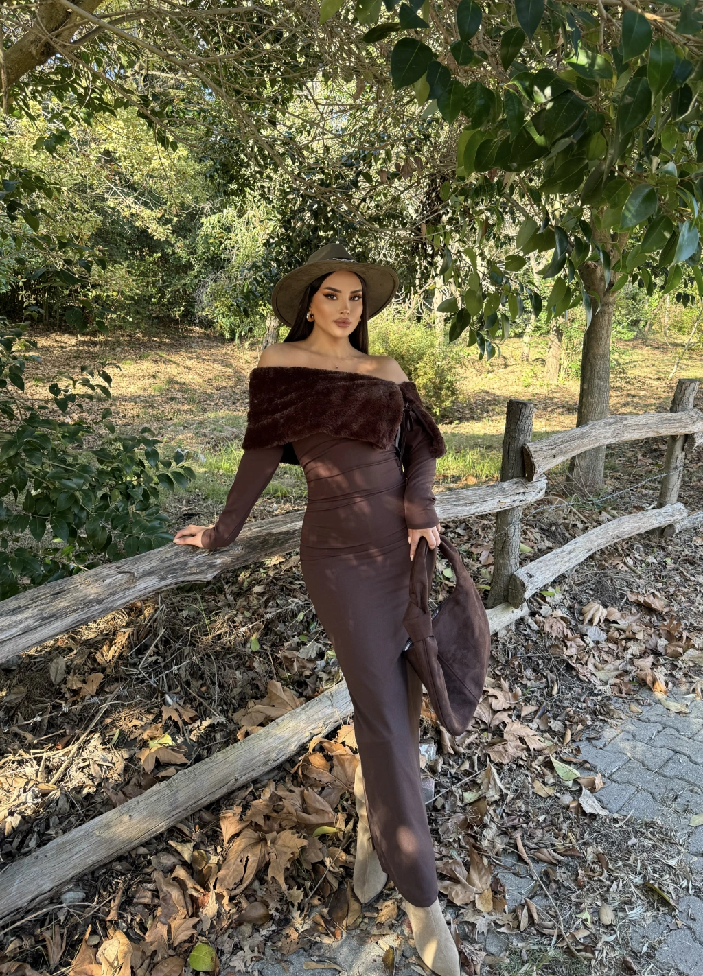 Kahverengi Kürk Detay Tasarım Madonna Elbise