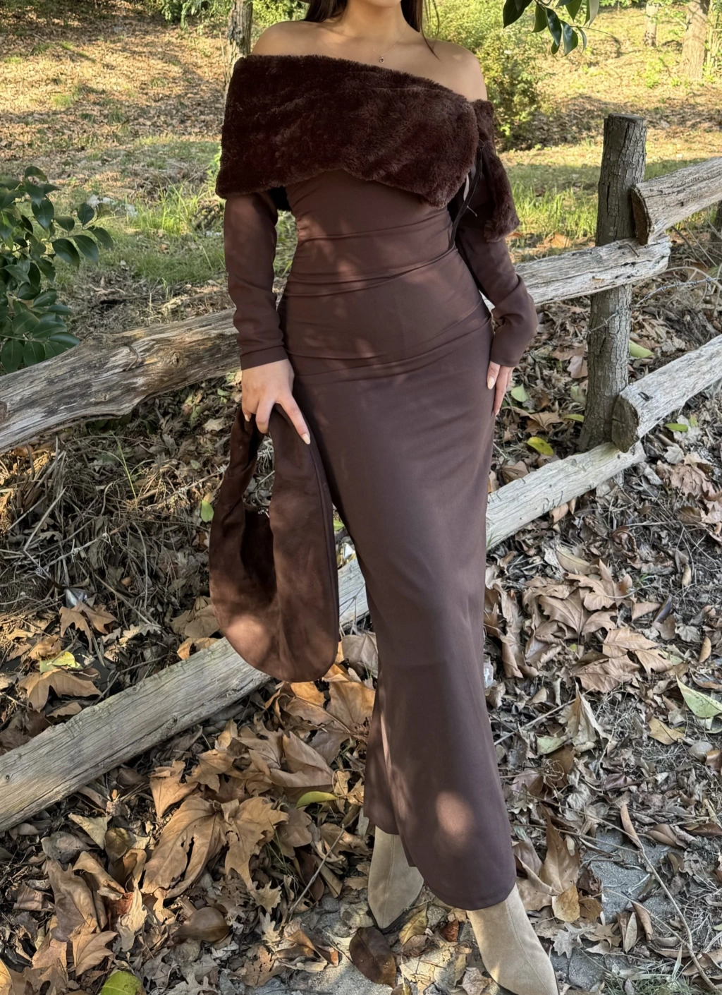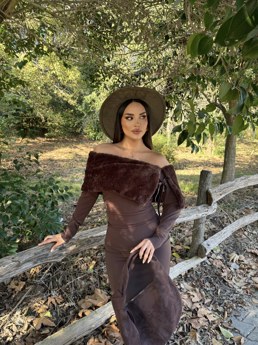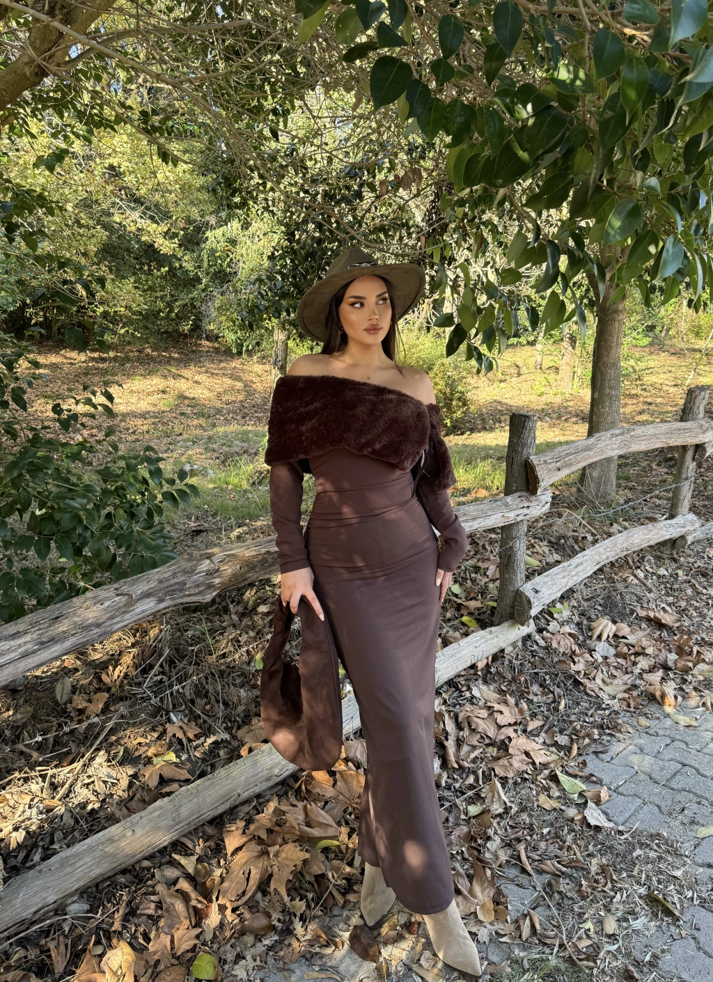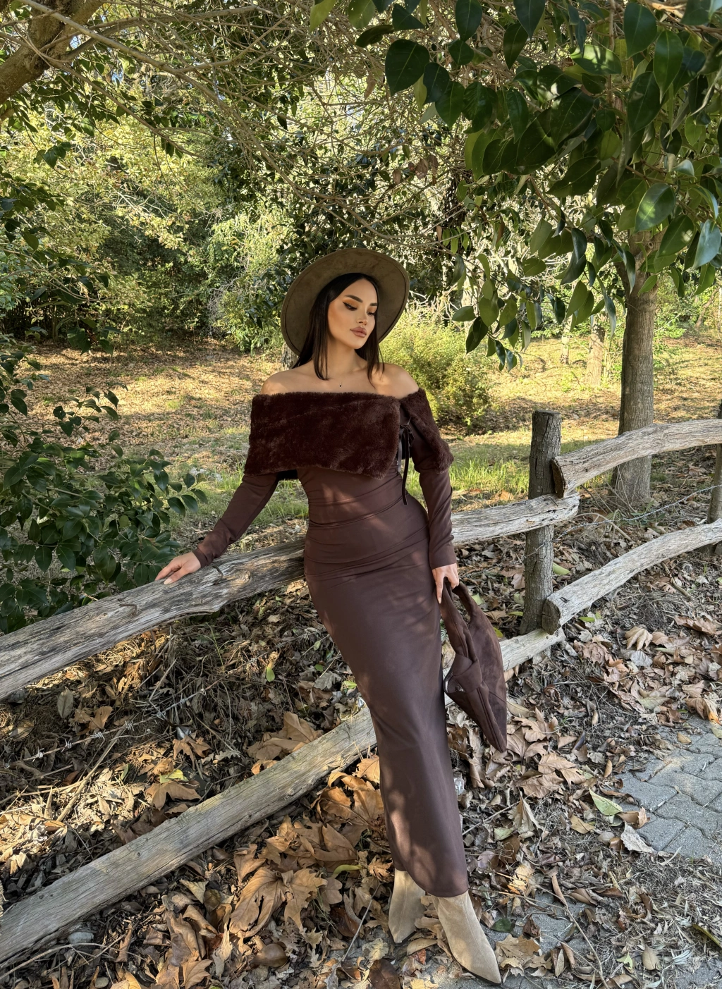 Kahverengi Kürk Detay Tasarım Madonna Elbise