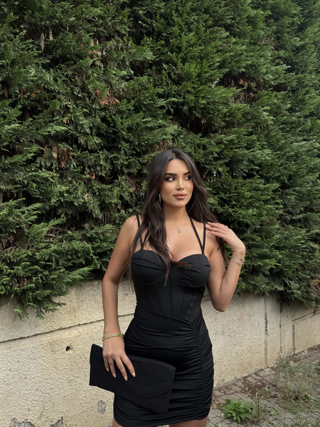 Siyah Korse Detay Askılı Tasarım Mini Elbise