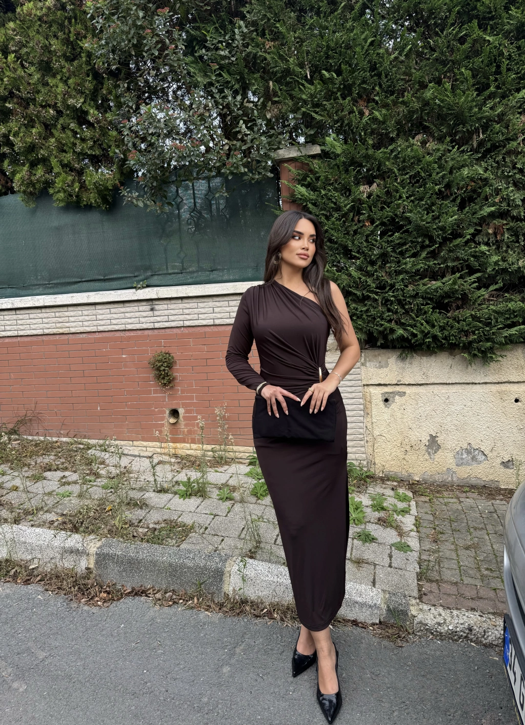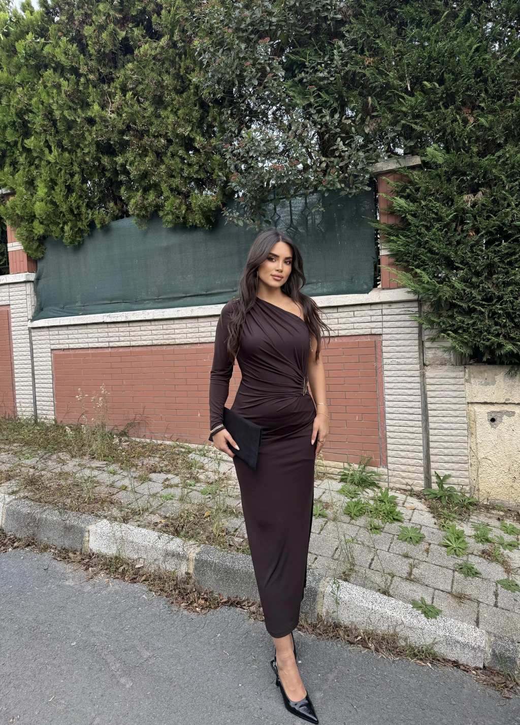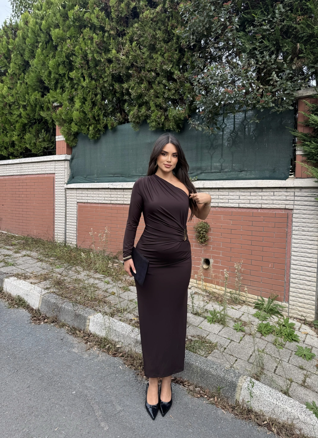 Kahverengi Tek Kol Tokalı Uzun Elbise