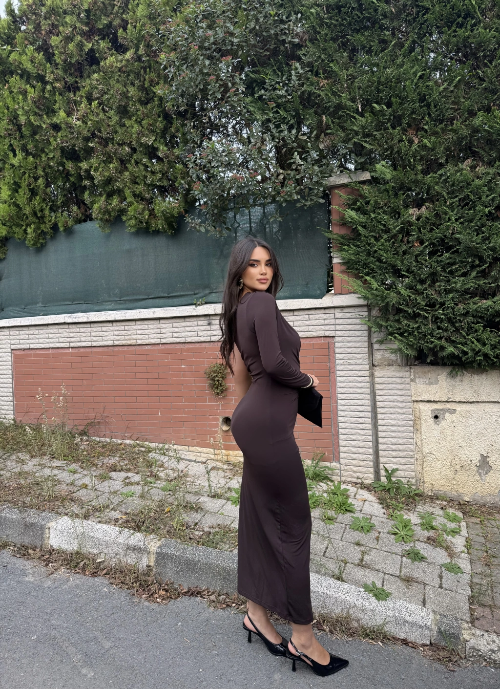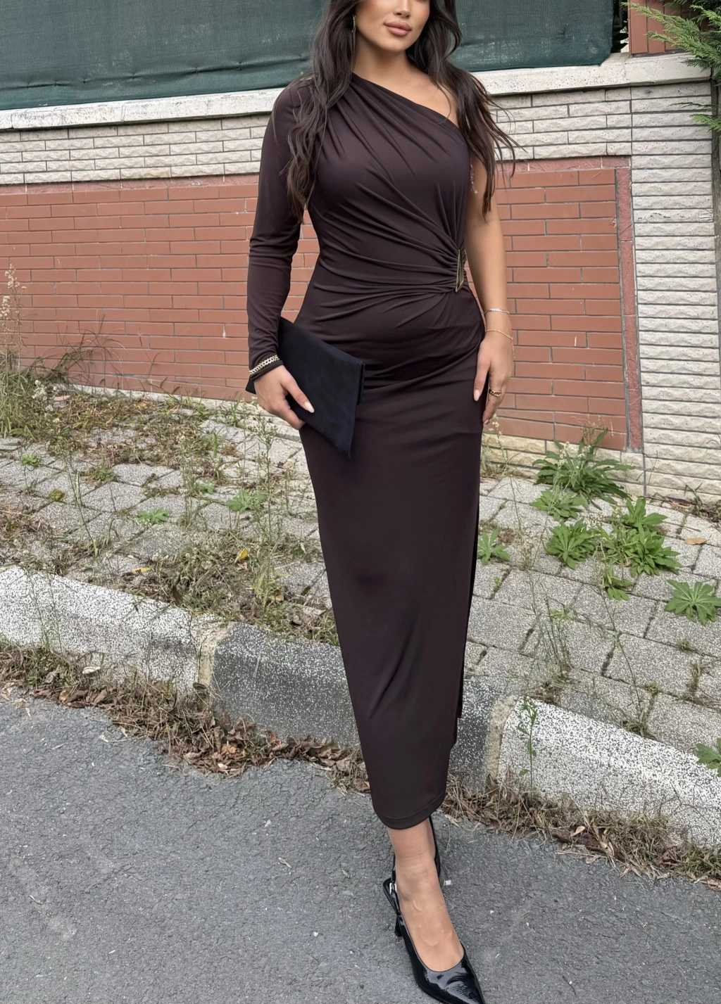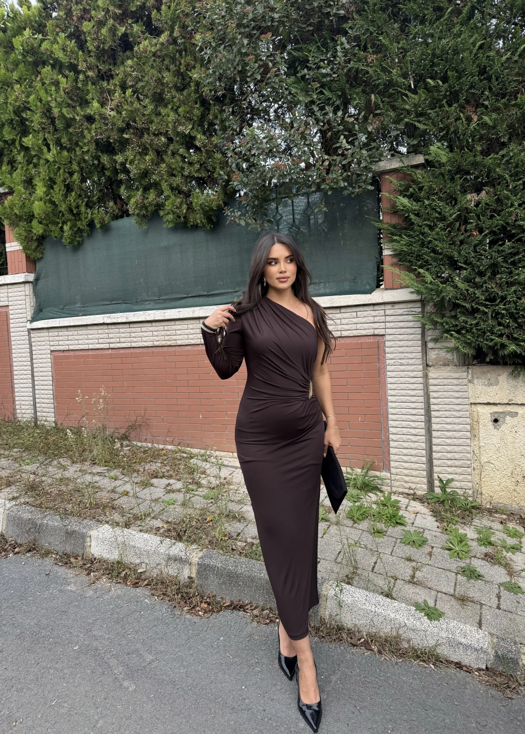 Kahverengi Tek Kol Tokalı Uzun Elbise