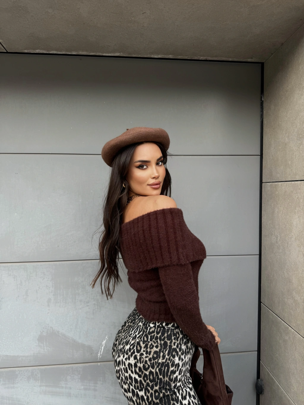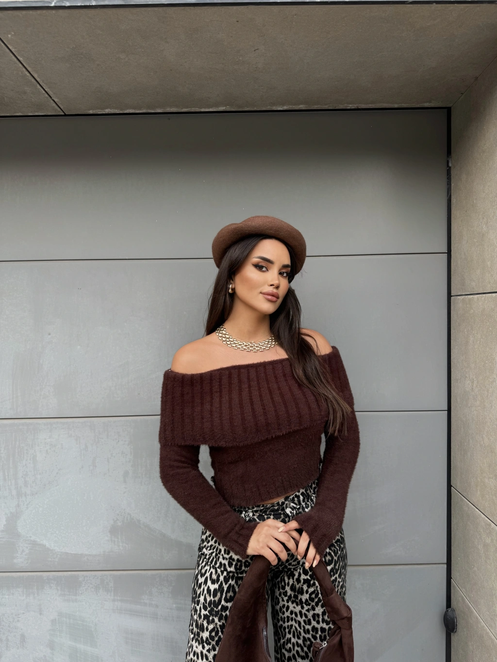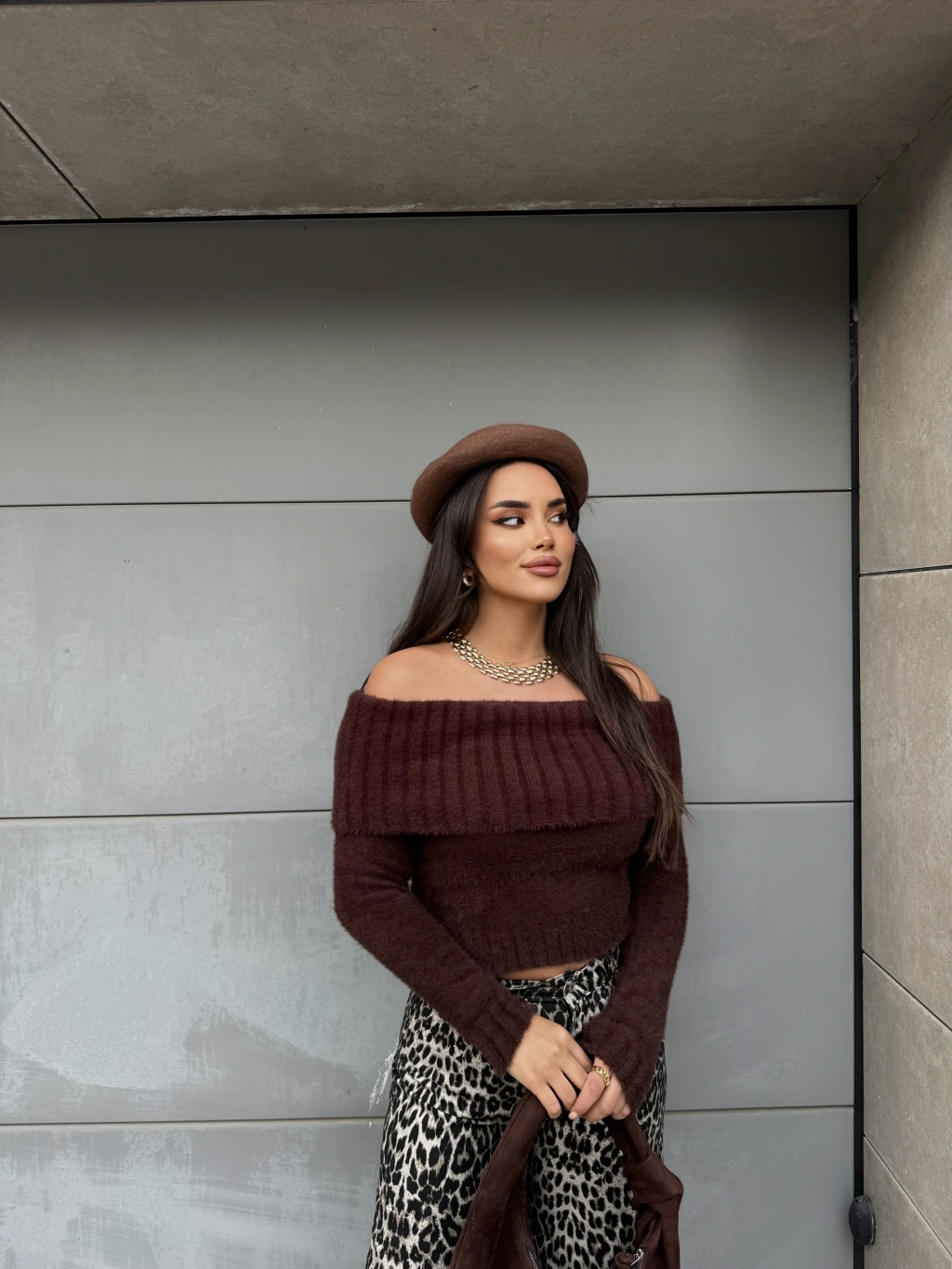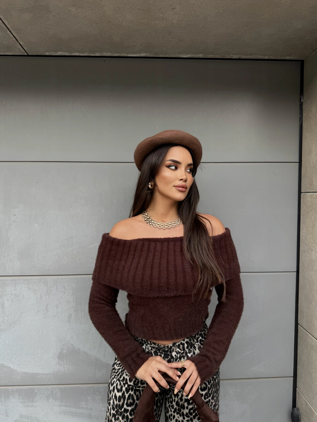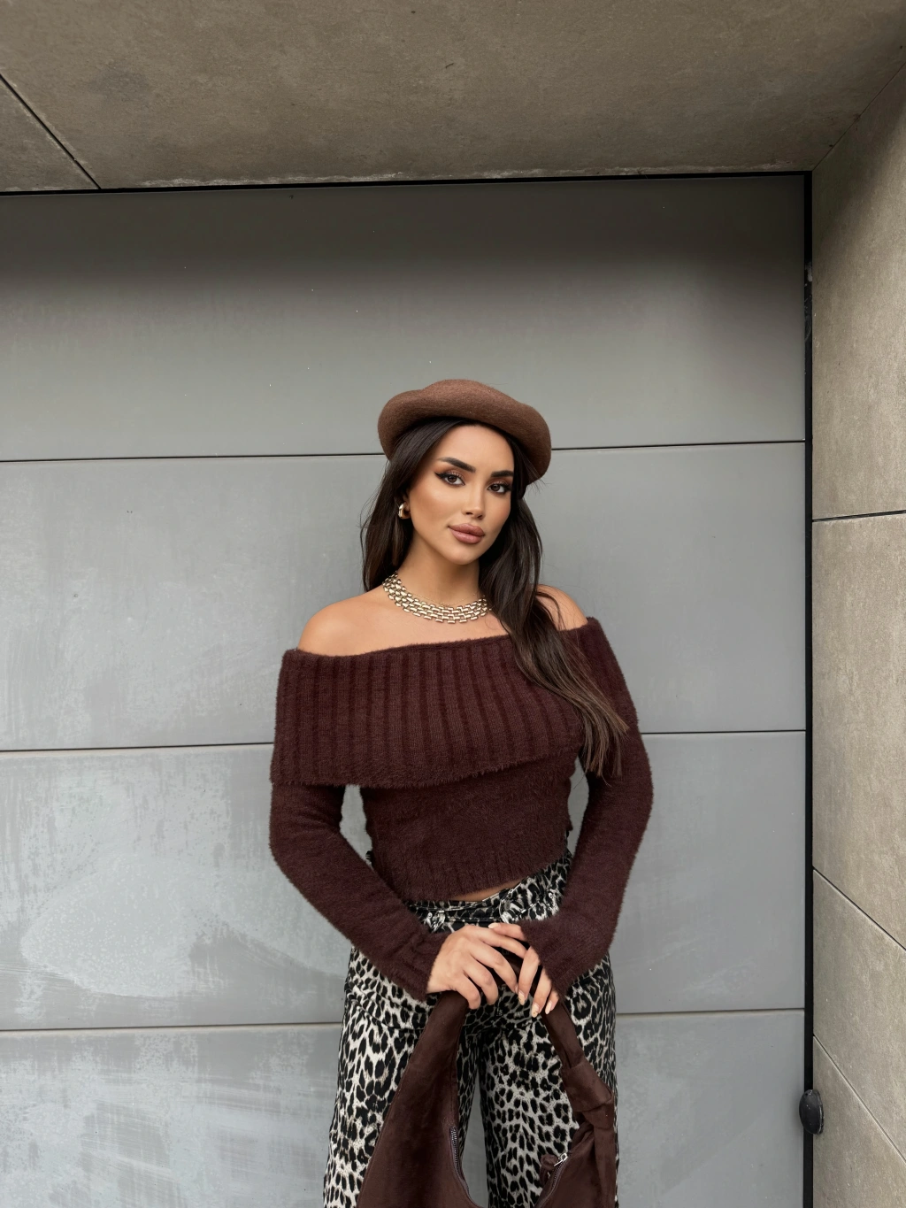 Kahverengi Yumoş Madonna Yaka Kazak