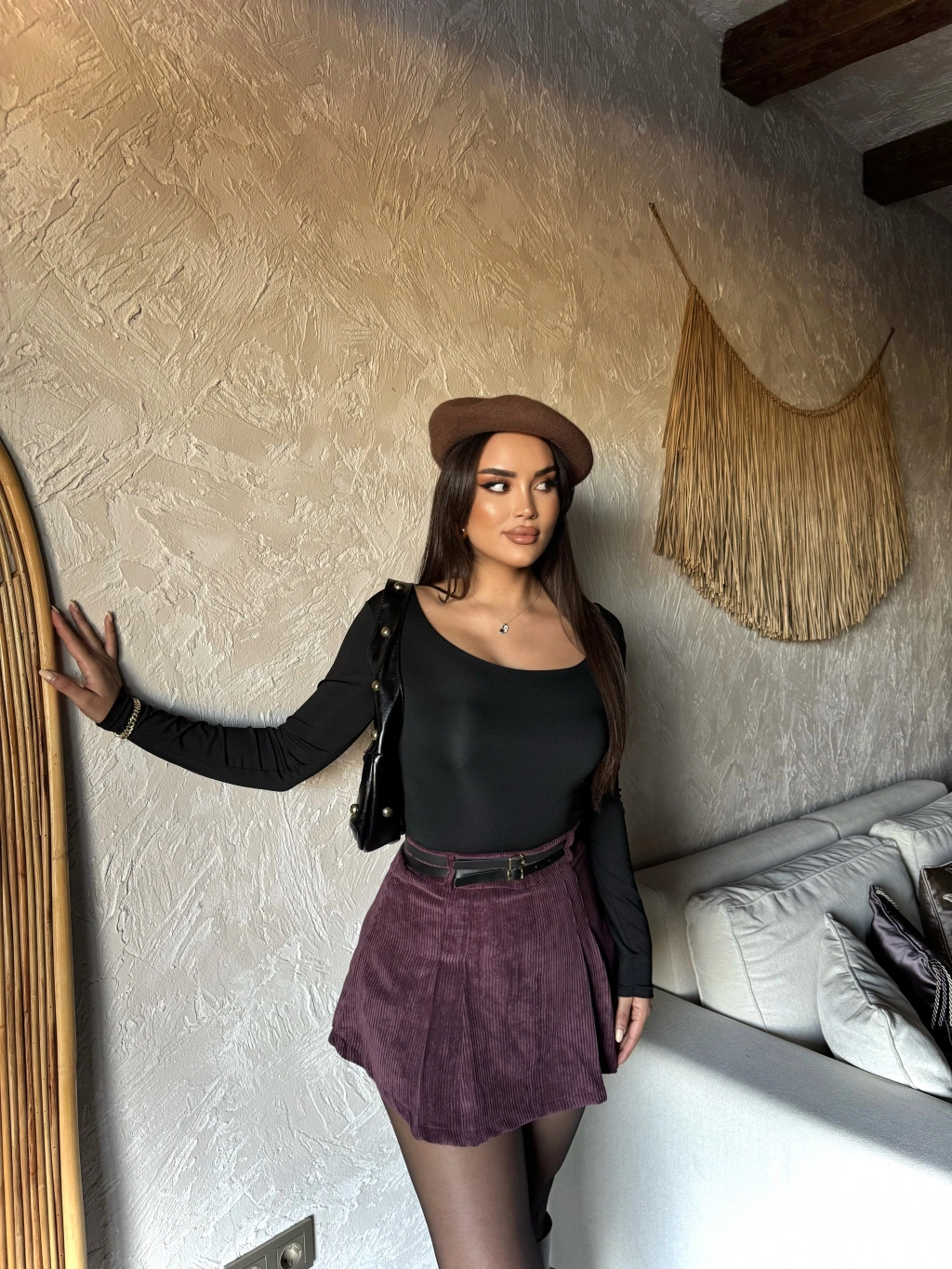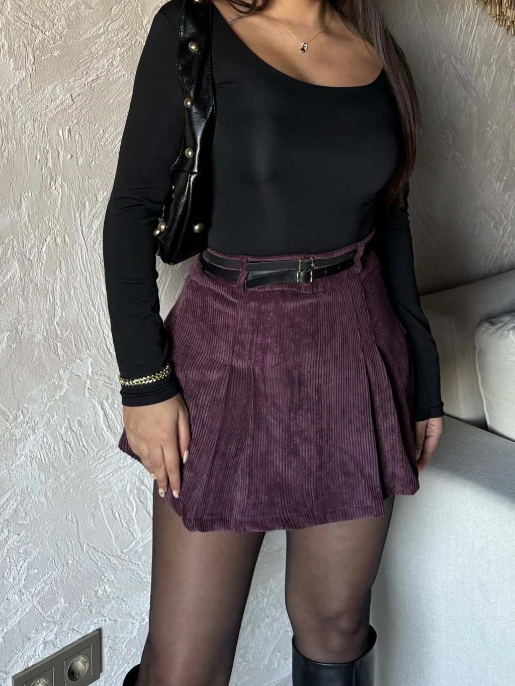 Bordo Kadife Çift Kemer Şort Etek