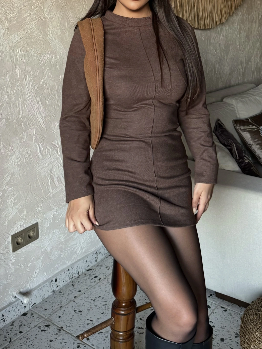 Kahverengi Yumoş Mini Elbise