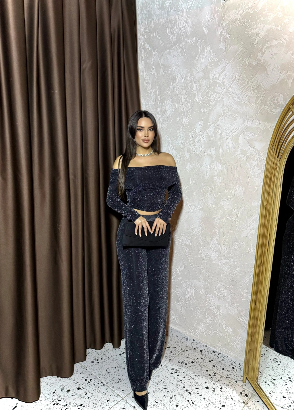 Siyah Buzzy Simli Bluz Pantolon Takım