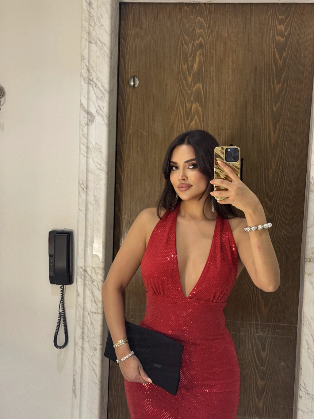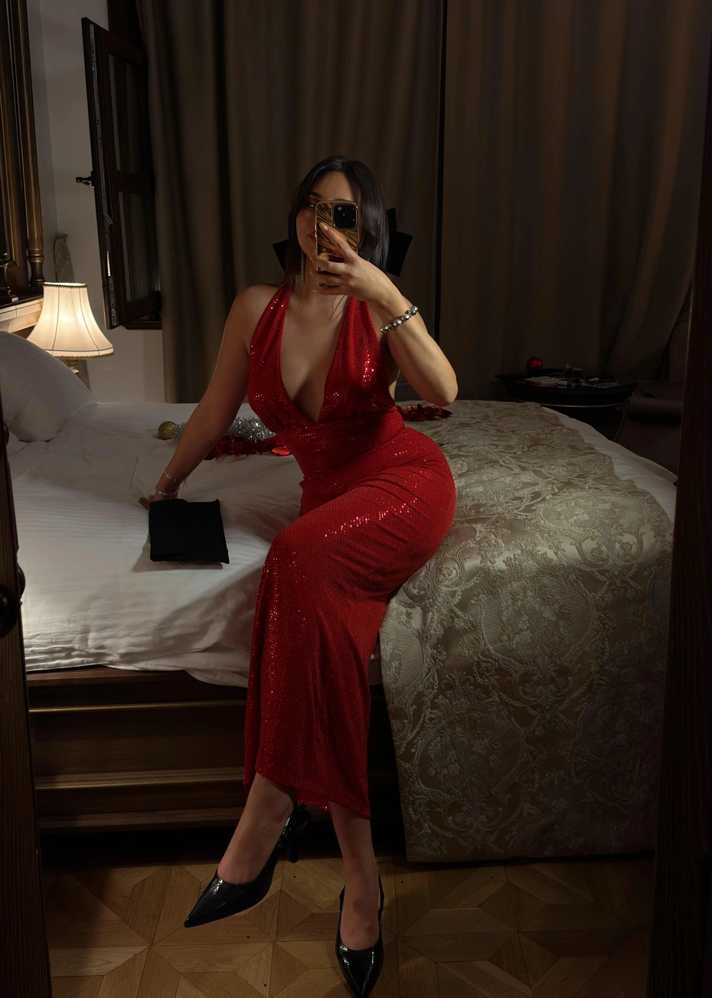 Kırmızı Payetli Boyundan Bağlamalı Uzun Elbise